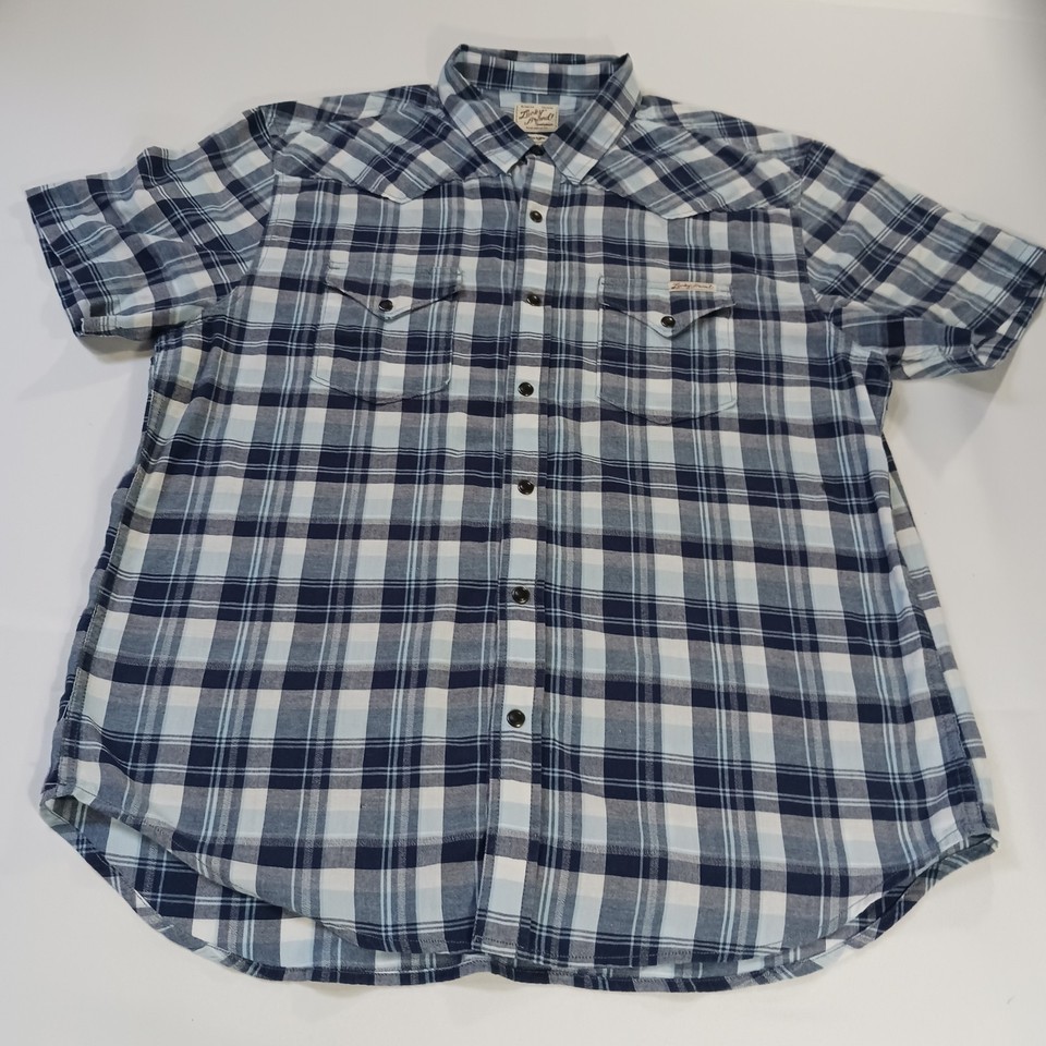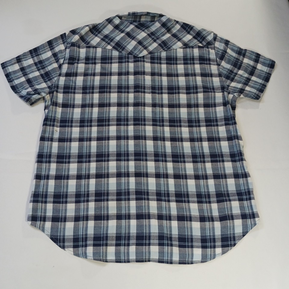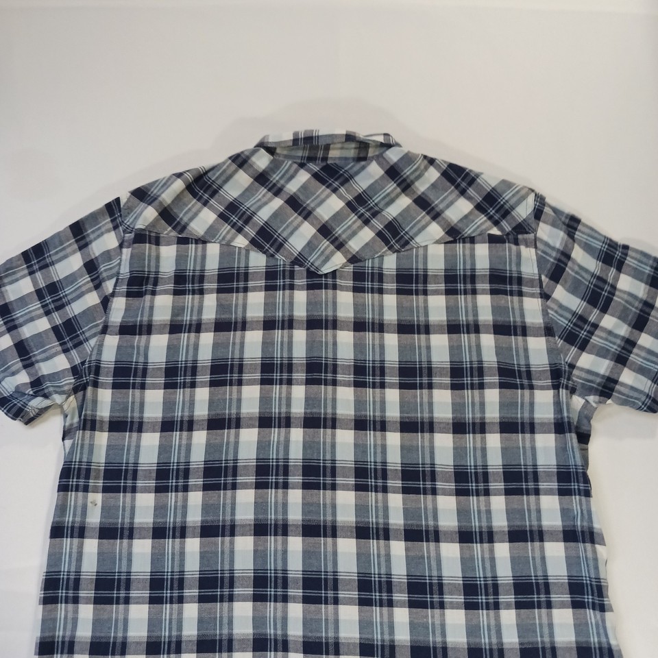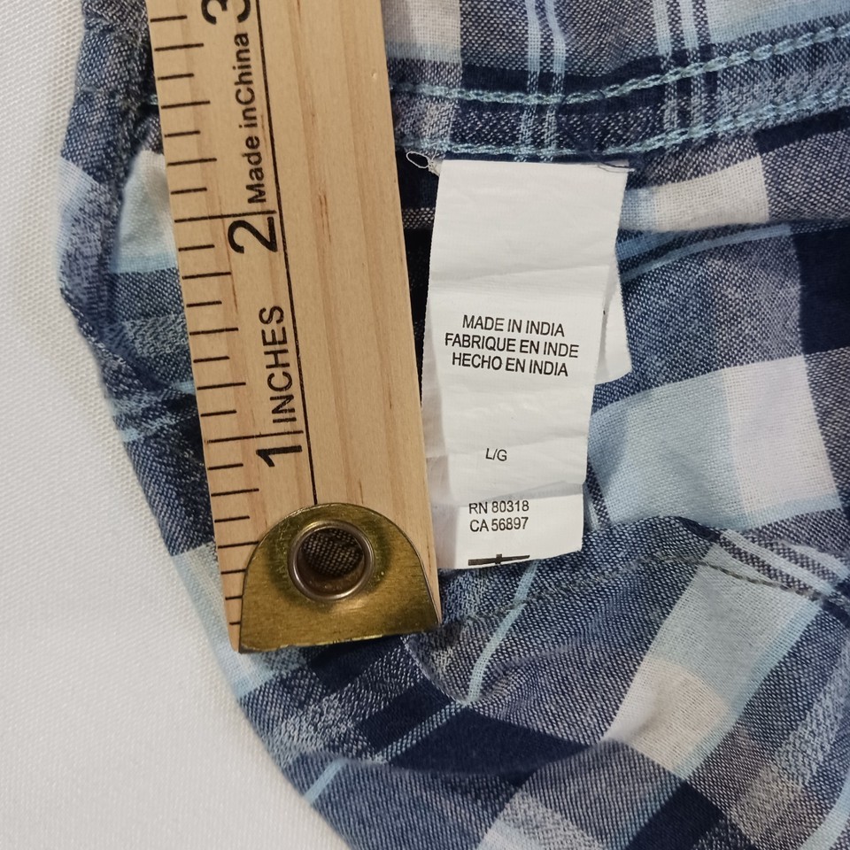 The Lucky Brand Sportswear Men's Western Pearl Snap Button Up Blue Plaid Shirt in size L is a classic and stylish addition to any man's wardrobe. Made of cotton with a woven fabric type, this short sleeve shirt features a collared neckline, button closure, and spread collar style. The blue plaid pattern adds a touch of Western flair, while the accents of the Lucky Brand logo give it a unique and trendy look. With a regular fit and convenient pockets, this shirt is perfect for casual occasions or everyday wear.