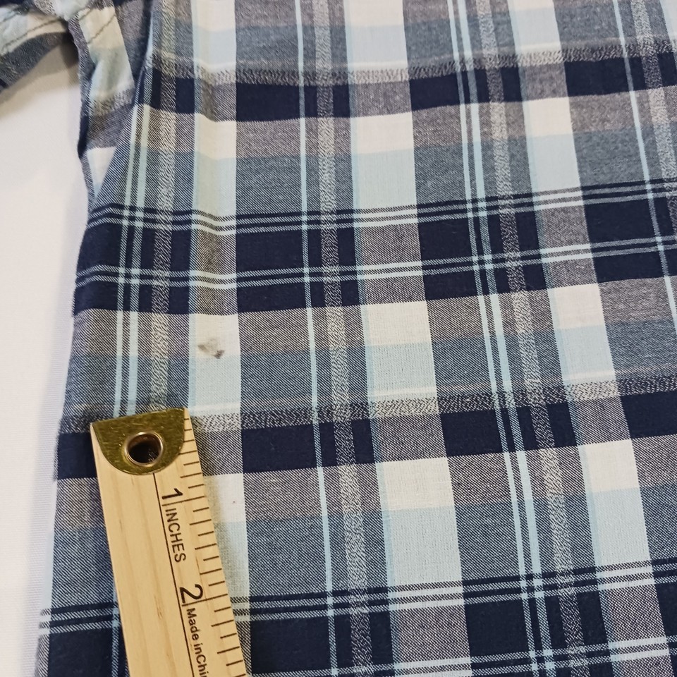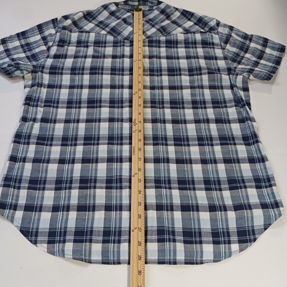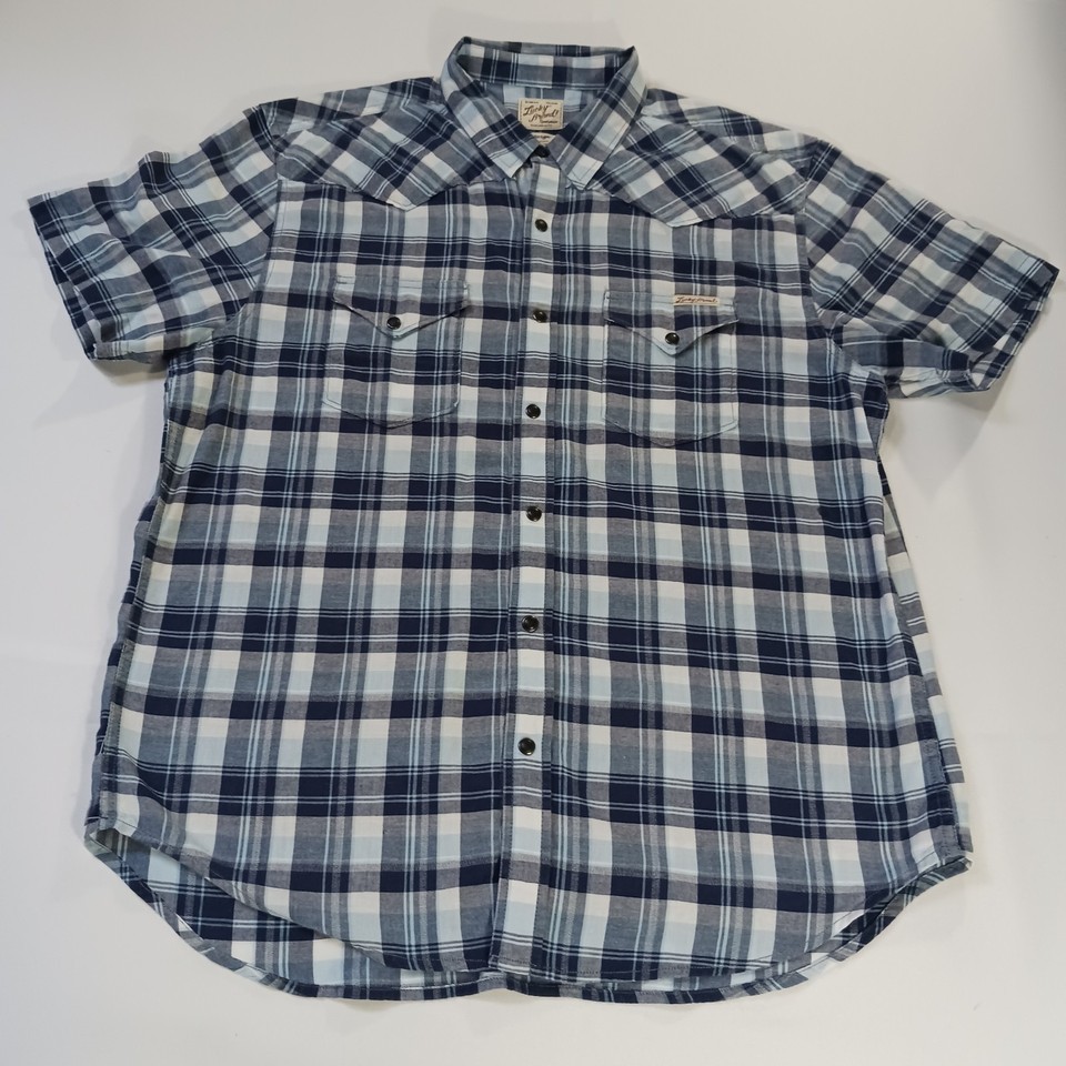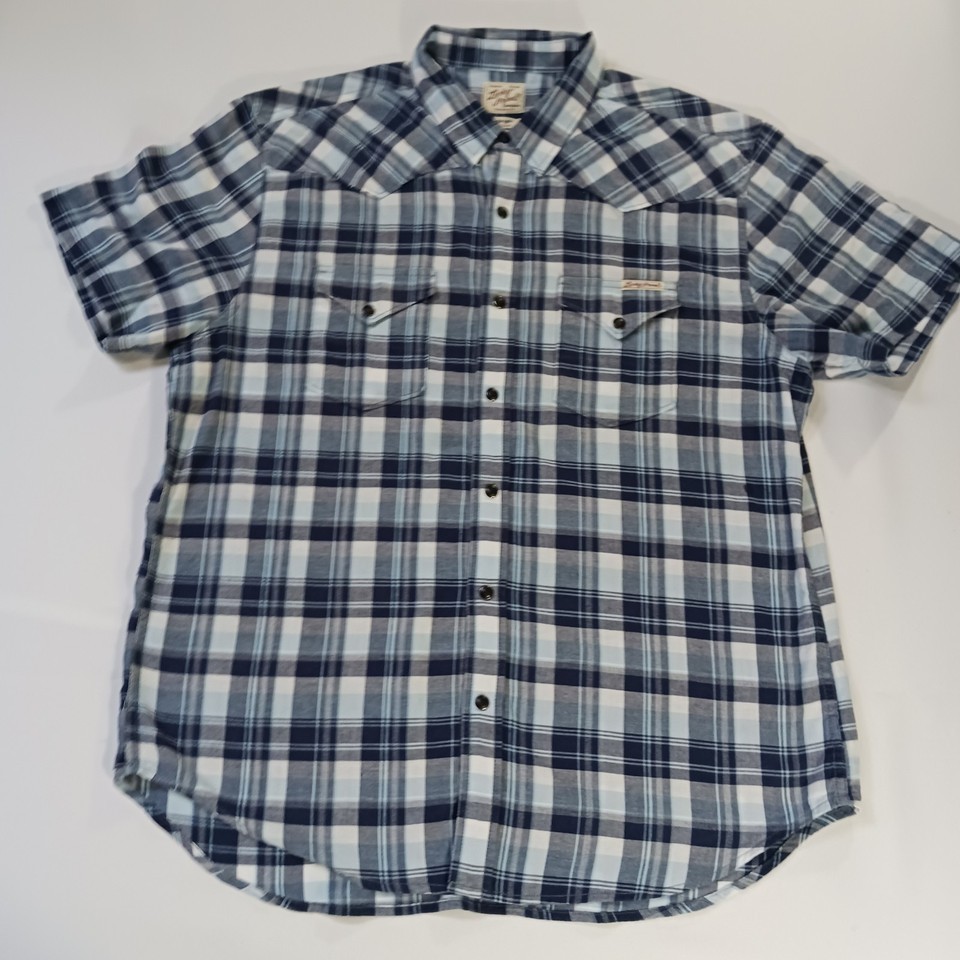 The Lucky Brand Sportswear Men's Western Pearl Snap Button Up Blue Plaid Shirt in size L is a classic and stylish addition to any man's wardrobe. Made of cotton with a woven fabric type, this short sleeve shirt features a collared neckline, button closure, and spread collar style. The blue plaid pattern adds a touch of Western flair, while the accents of the Lucky Brand logo give it a unique and trendy look. With a regular fit and convenient pockets, this shirt is perfect for casual occasions or everyday wear.