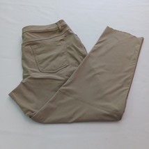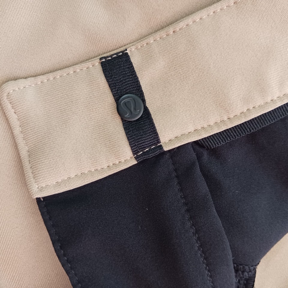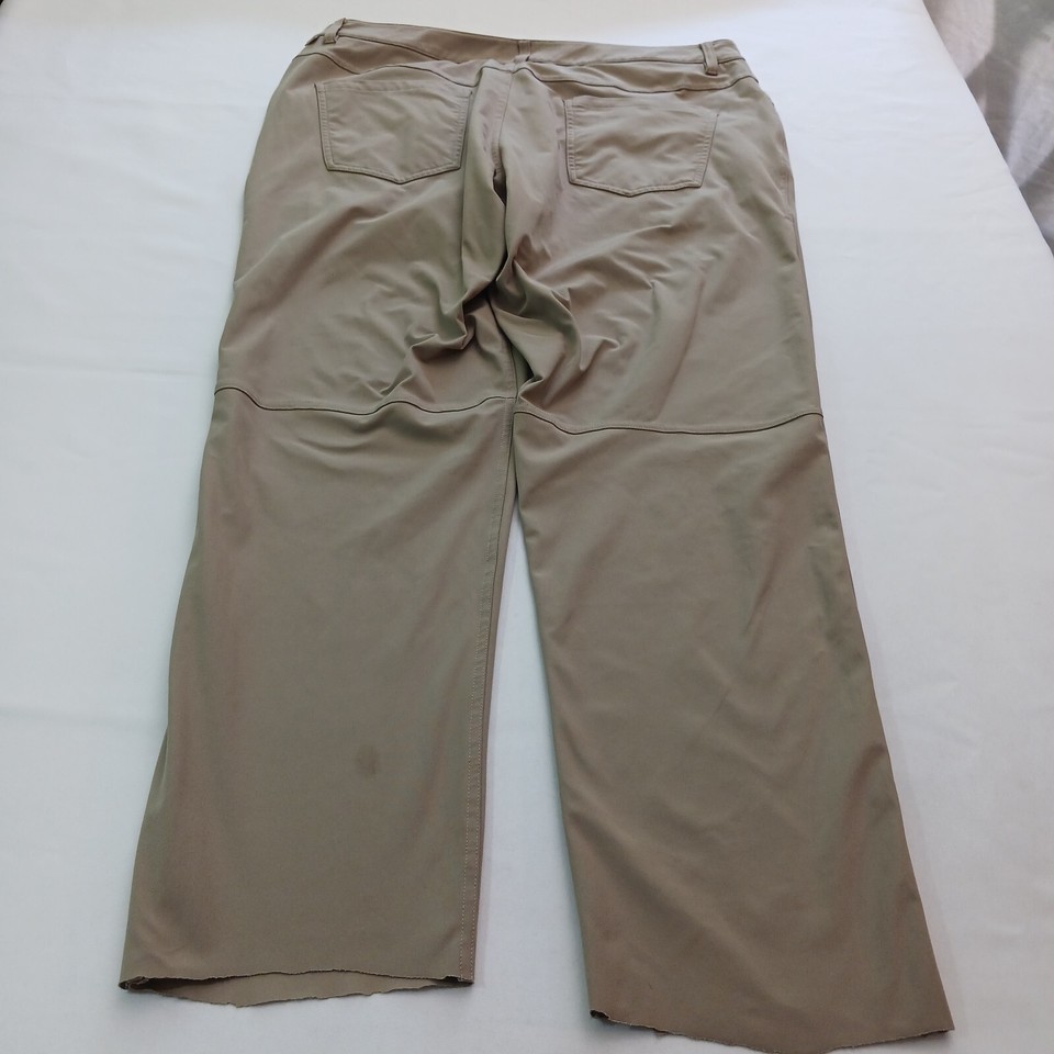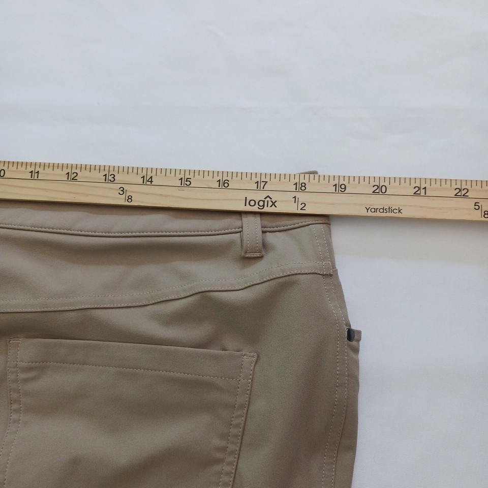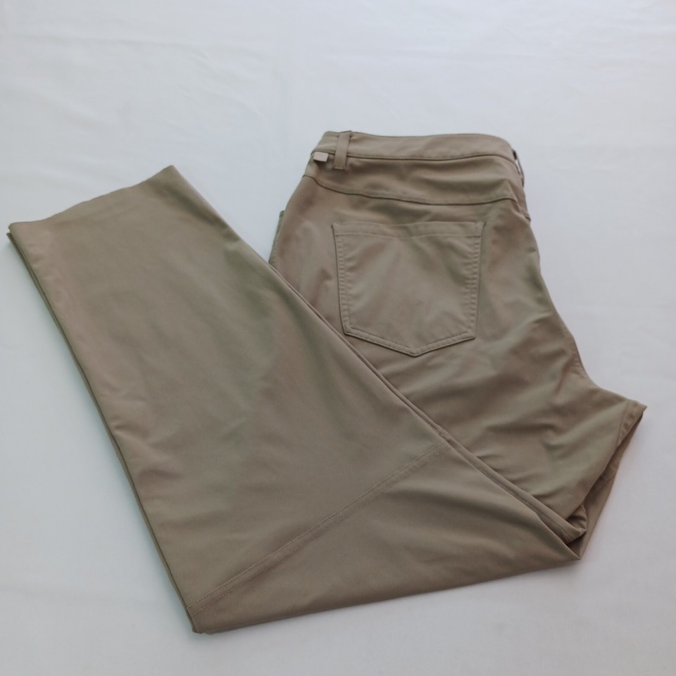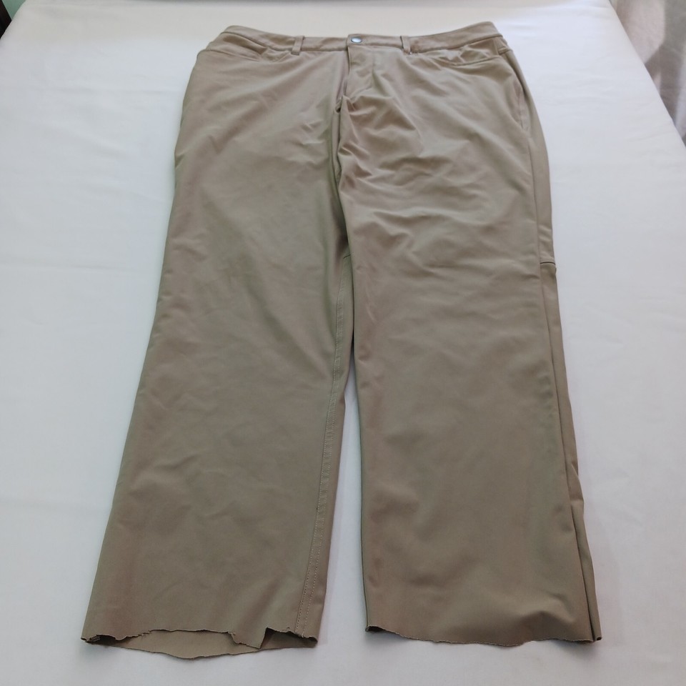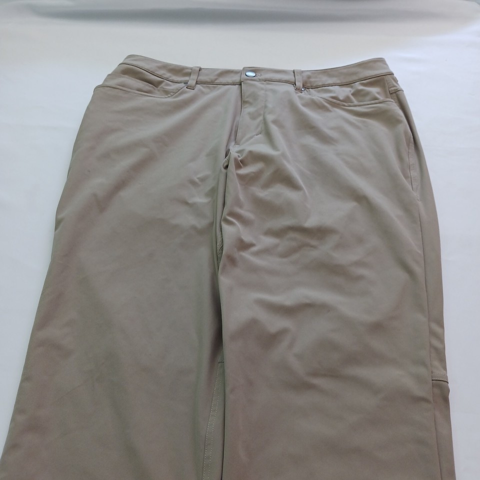 These Lululemon pants in a beige/khaki color are perfect for any active woman. They feature a solid pattern and a relaxed fit, with a straight leg style and a pull-on closure. The pants are made of a durable polyester blend material and feature stretch for added comfort during any gym or training session, as well as for walking or dance activities.