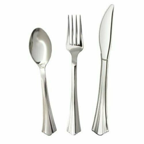 Get the look of silverware without the cleanup. With their elegant design, they're sure to have your guests doing a double-take. Surprise them with this premium-strength plastic set of forks, knives and spoons that are sturdy and will make your guests ask, "Is this real silver?" This cutlery knows when to make a swift exit making for easy cleanup at the end of the event.