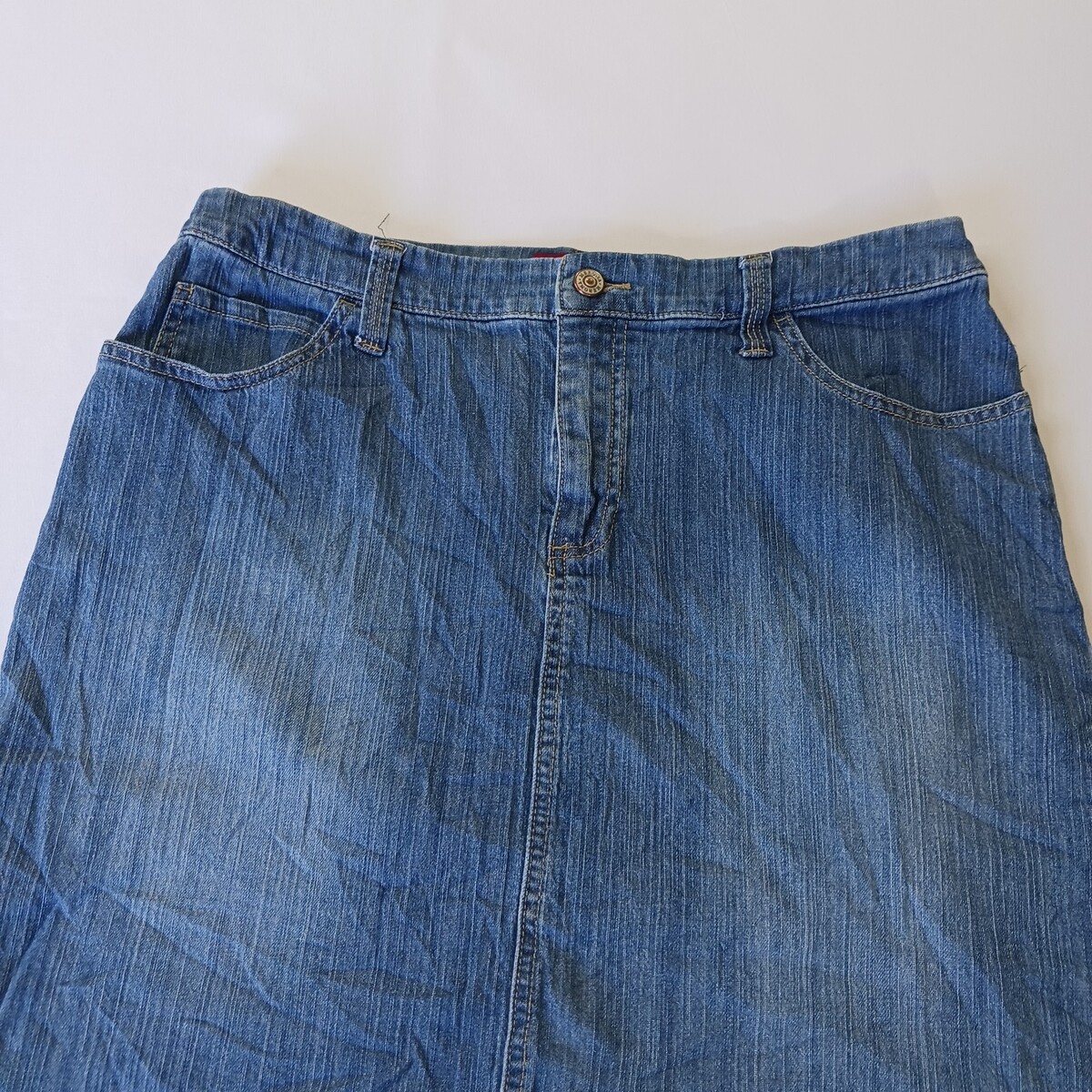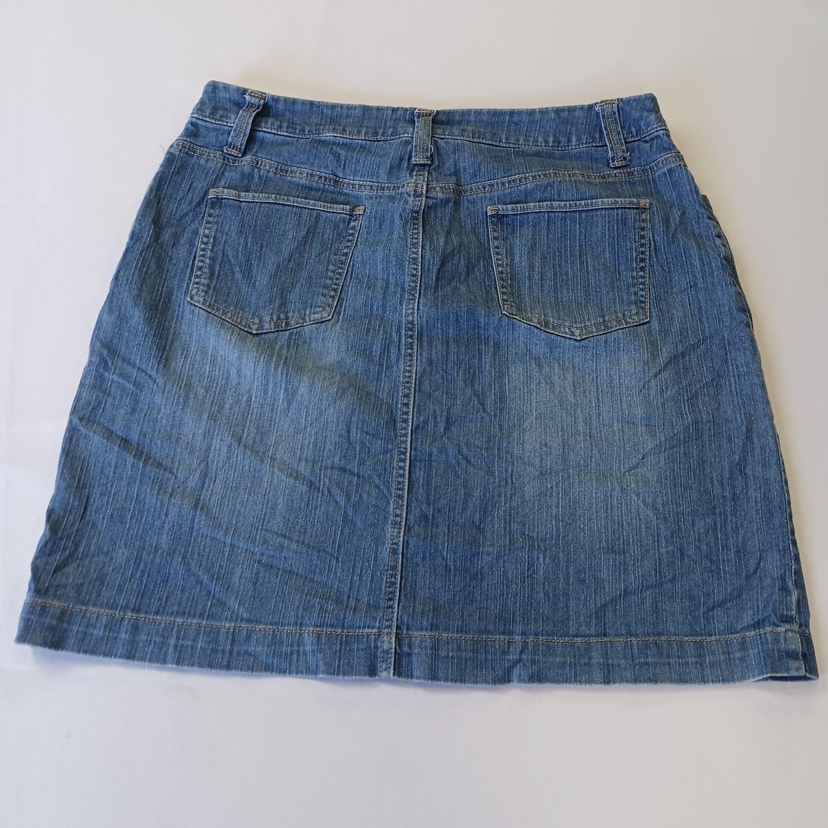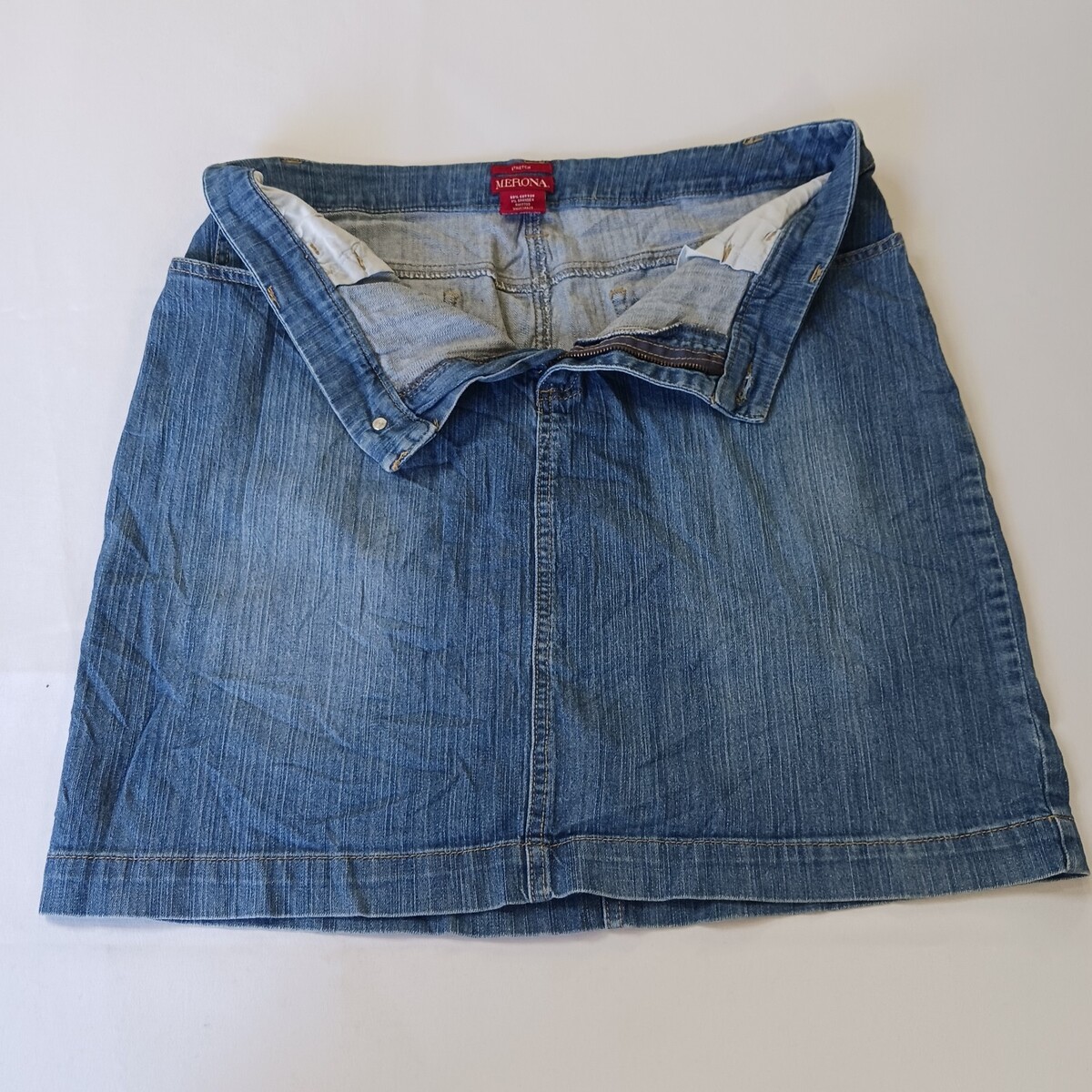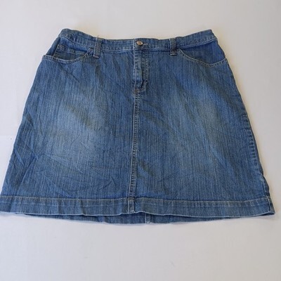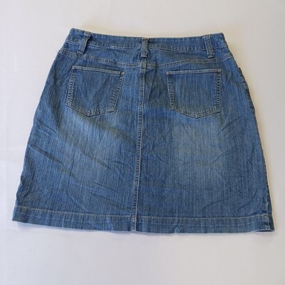 The Merona RN#17730 Women's Blue Cotton Blend Stretch Denim Skirt in size 12 with a waist size of 32 inches is a stylish and versatile piece for any casual occasion. Made from a comfortable cotton blend with added spandex for stretch, this straight and pencil style skirt is machine washable for easy care. The solid blue color and denim fabric make it a classic wardrobe staple that can be worn in various seasons like summer, fall, and spring. With a zip button closure and four pockets, this Merona skirt combines both style and functionality for any woman's clothing collection.