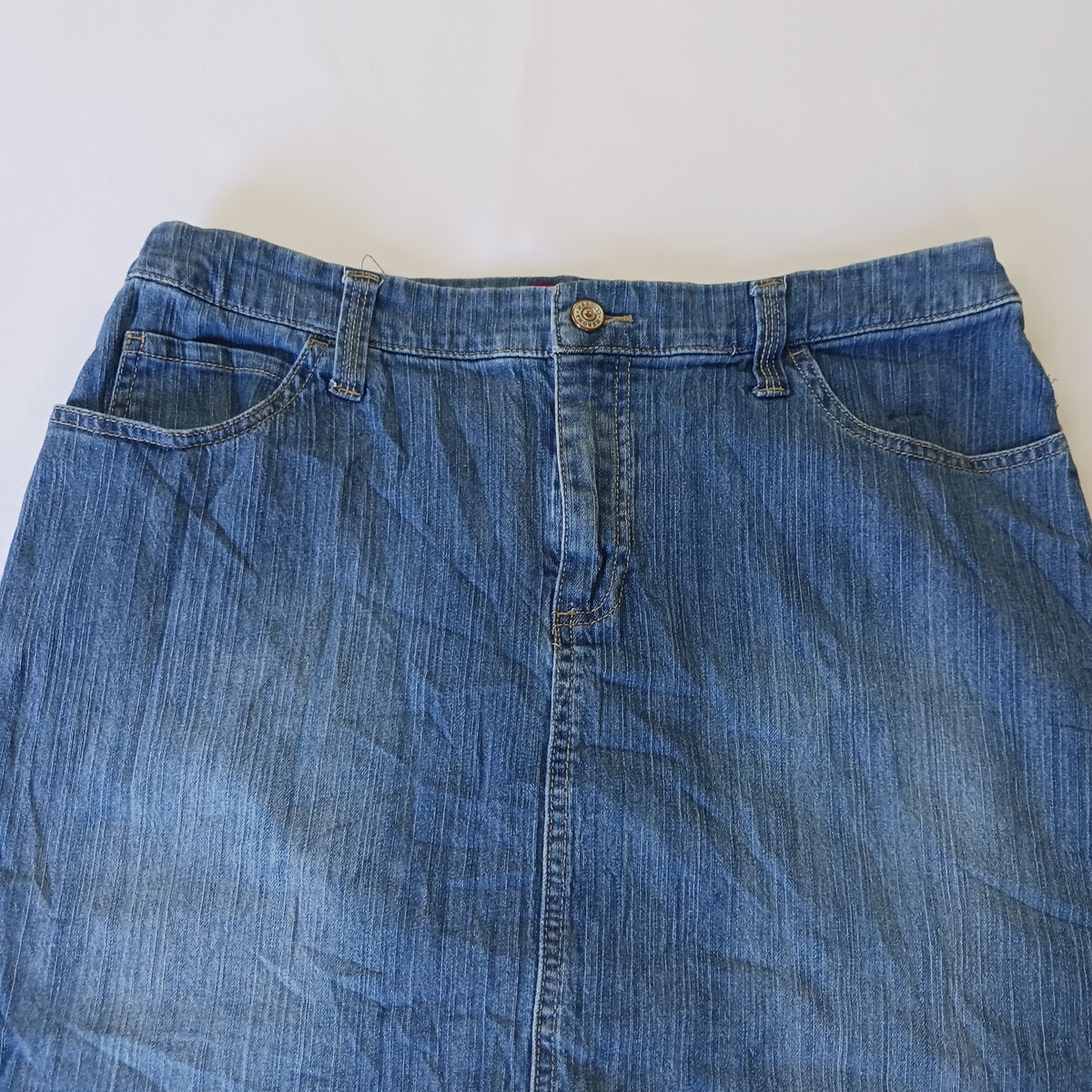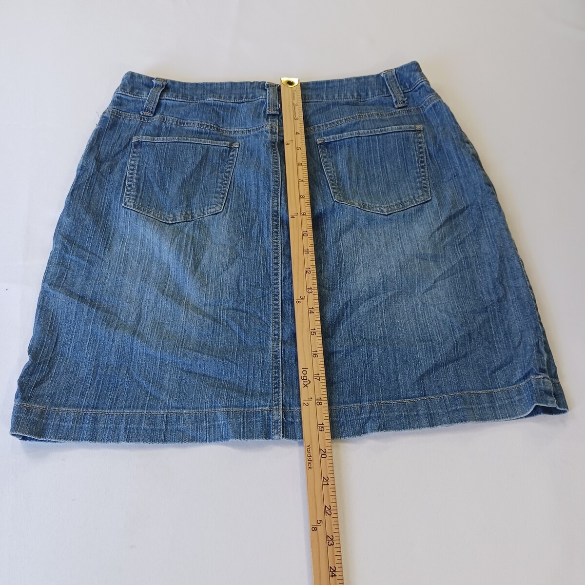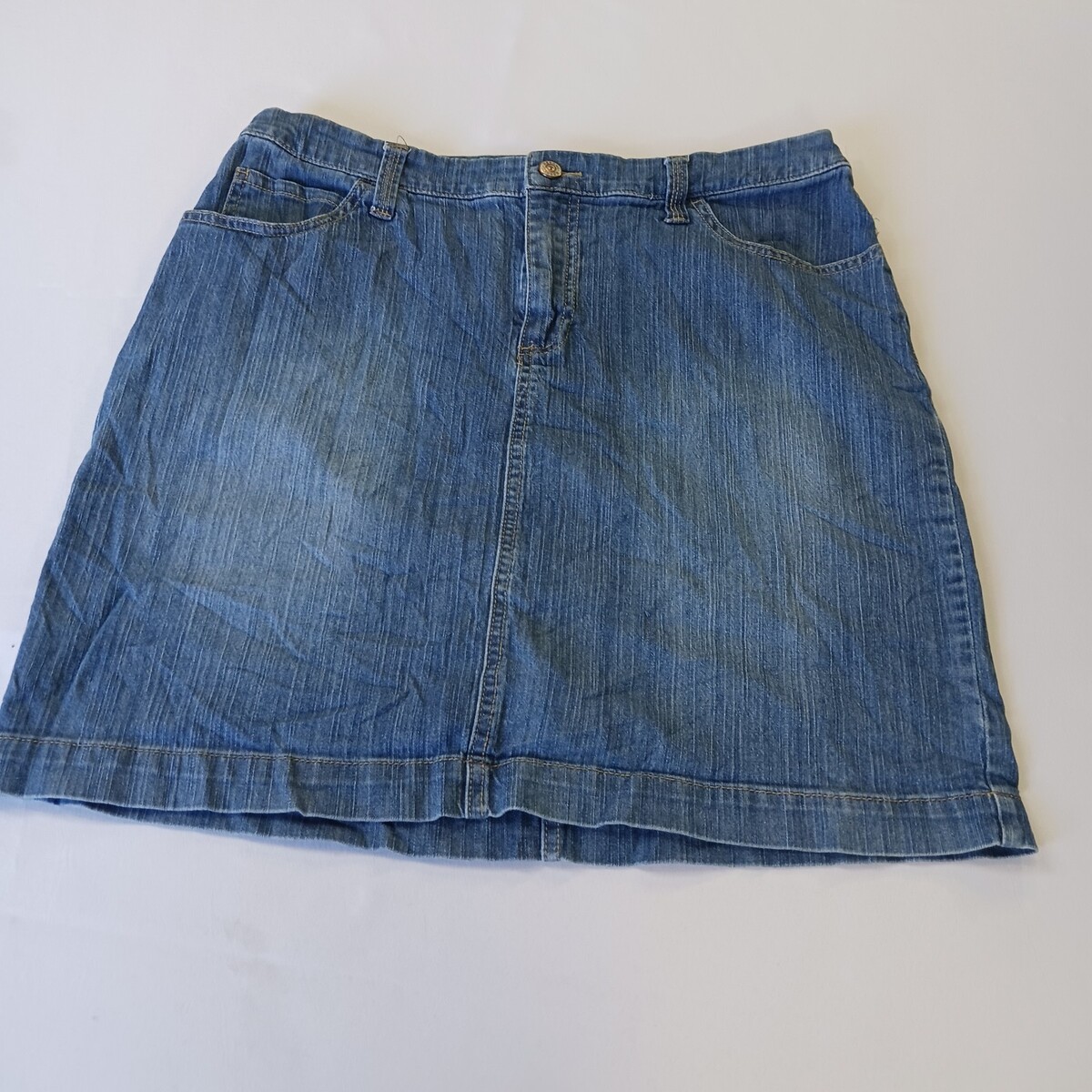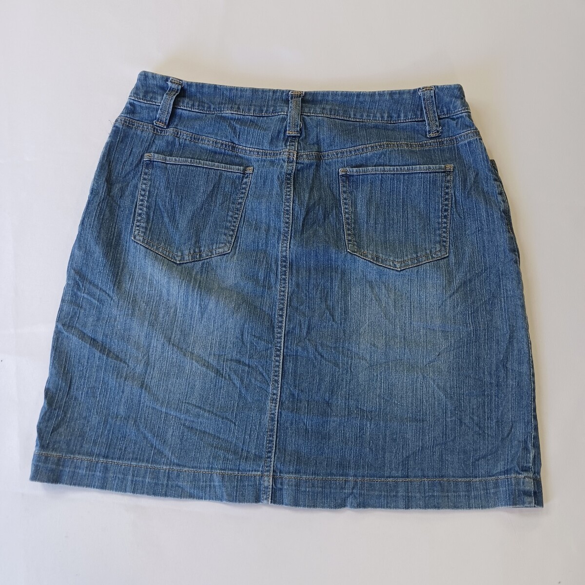 The Merona RN#17730 Women's Blue Cotton Blend Stretch Denim Skirt in size 12 with a waist size of 32 inches is a stylish and versatile piece for any casual occasion. Made from a comfortable cotton blend with added spandex for stretch, this straight and pencil style skirt is machine washable for easy care. The solid blue color and denim fabric make it a classic wardrobe staple that can be worn in various seasons like summer, fall, and spring. With a zip button closure and four pockets, this Merona skirt combines both style and functionality for any woman's clothing collection.