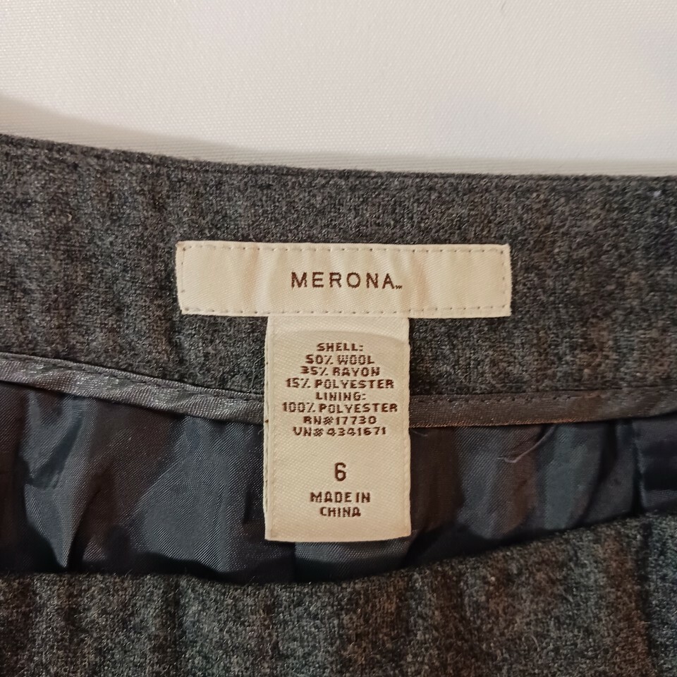 This is a vintage Merona women's A-line skirt in a gray color, made from a blend of polyester, rayon, and wool material. It features a zip closure, with a waist size of 30 inches and a skirt length of 22.5 inches, designed in a size 6 for regular fit. The skirt is lined for added comfort and style.