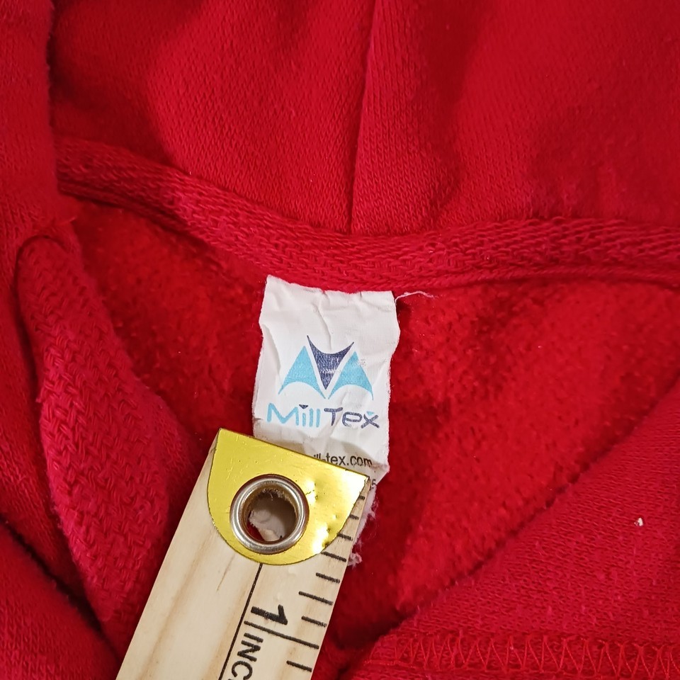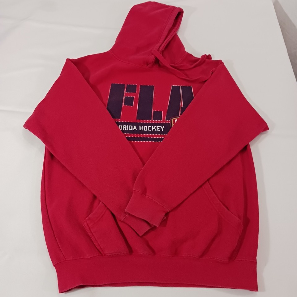 Show your support for the Florida Panthers with this stylish red hoodie sweatshirt by Mill Tex. Made for comfort and warmth, this hoodie features the team's logo prominently on the chest and is perfect for game day or casual wear. The size is large with a chest measurement of 46 inches, making it a great fit for most men.