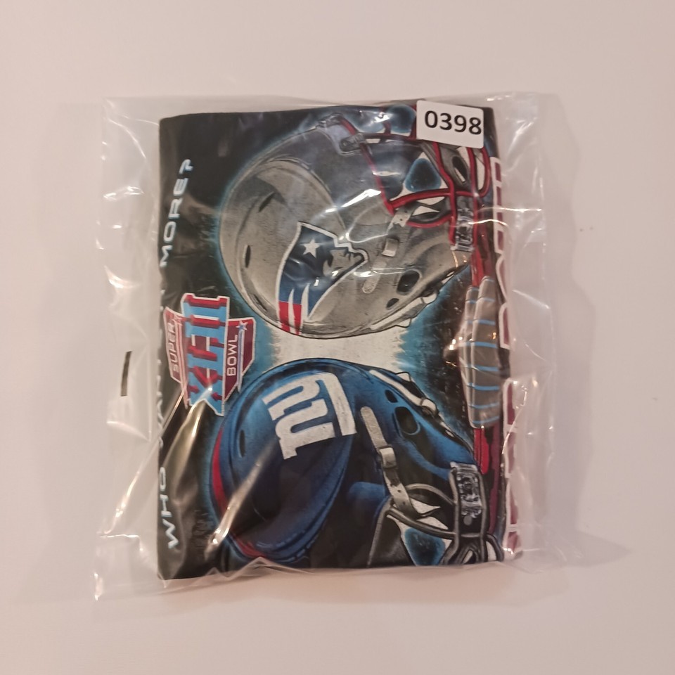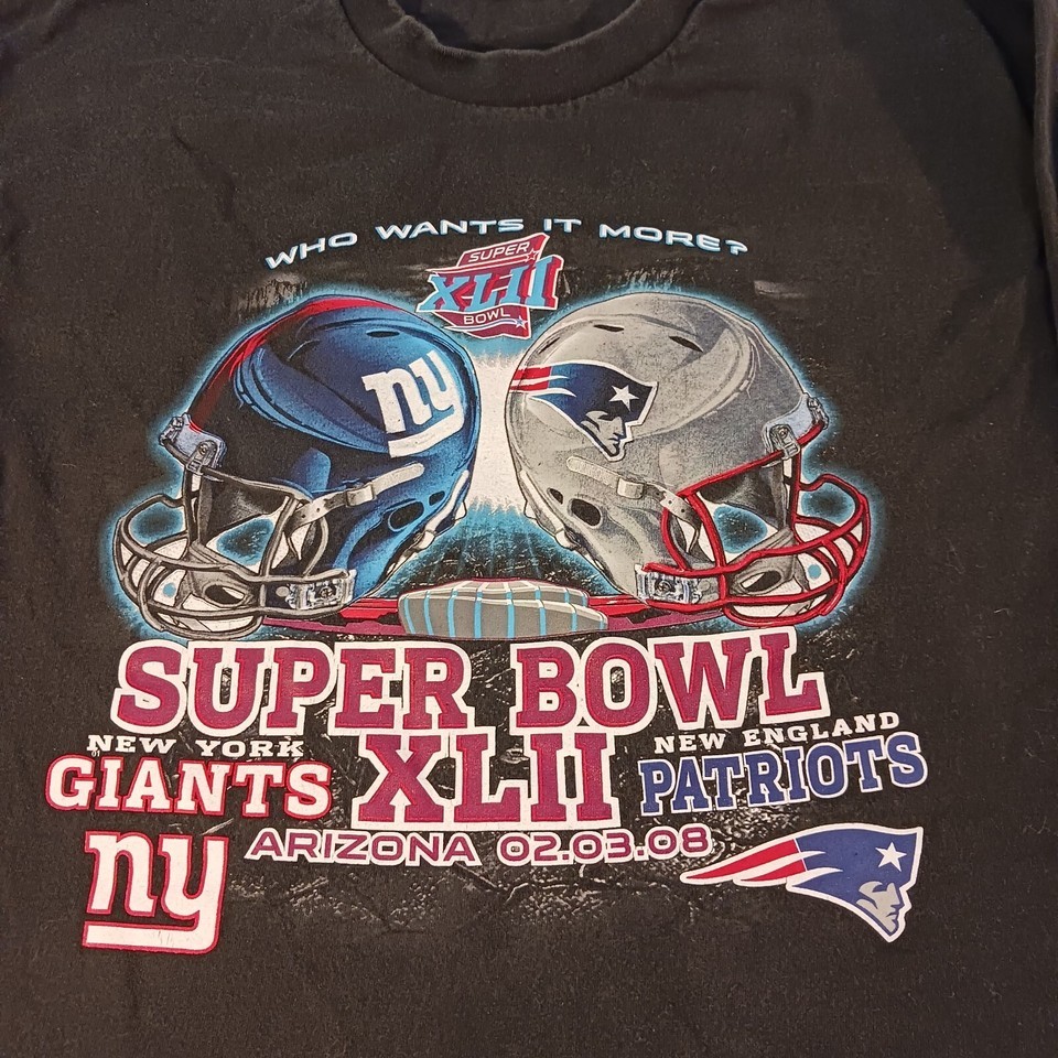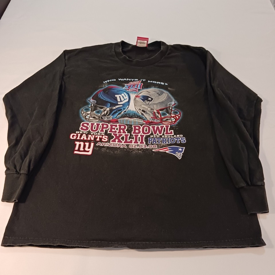 Show your support for the New England Patriots with this officially licensed NFL Super Bowl XLII t-shirt. Made from comfortable black cotton, this shirt is perfect for football fans looking to represent their team. The shirt features the Giants Vs Patriots 2008 game and is available in size XL for men.