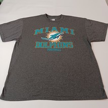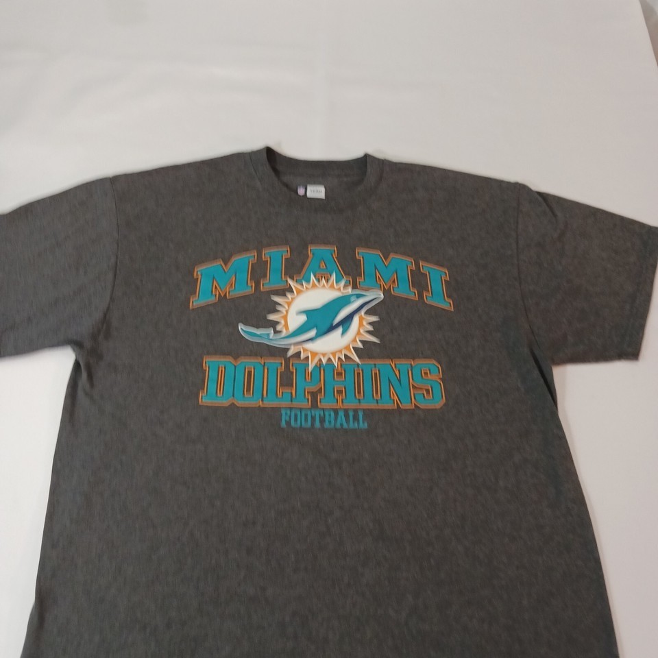 The product is an officially licensed NFL Team Apparel Miami Dolphins men's gray short sleeve graphic t-shirt in size XL. Made in Nicaragua, this shirt features the Miami Dolphins team logo or graphics on the front. It is designed for male fans of the Miami Dolphins to show their support for the team in a comfortable and stylish way. Perfect for wearing to football games or casual outings, this shirt is a must-have for any Miami Dolphins fan looking to represent their team with pride.