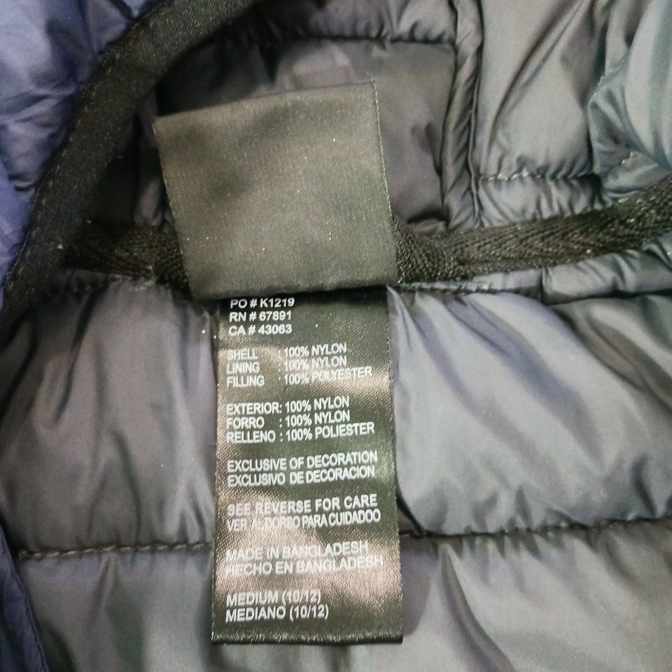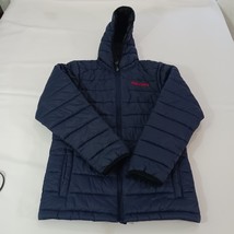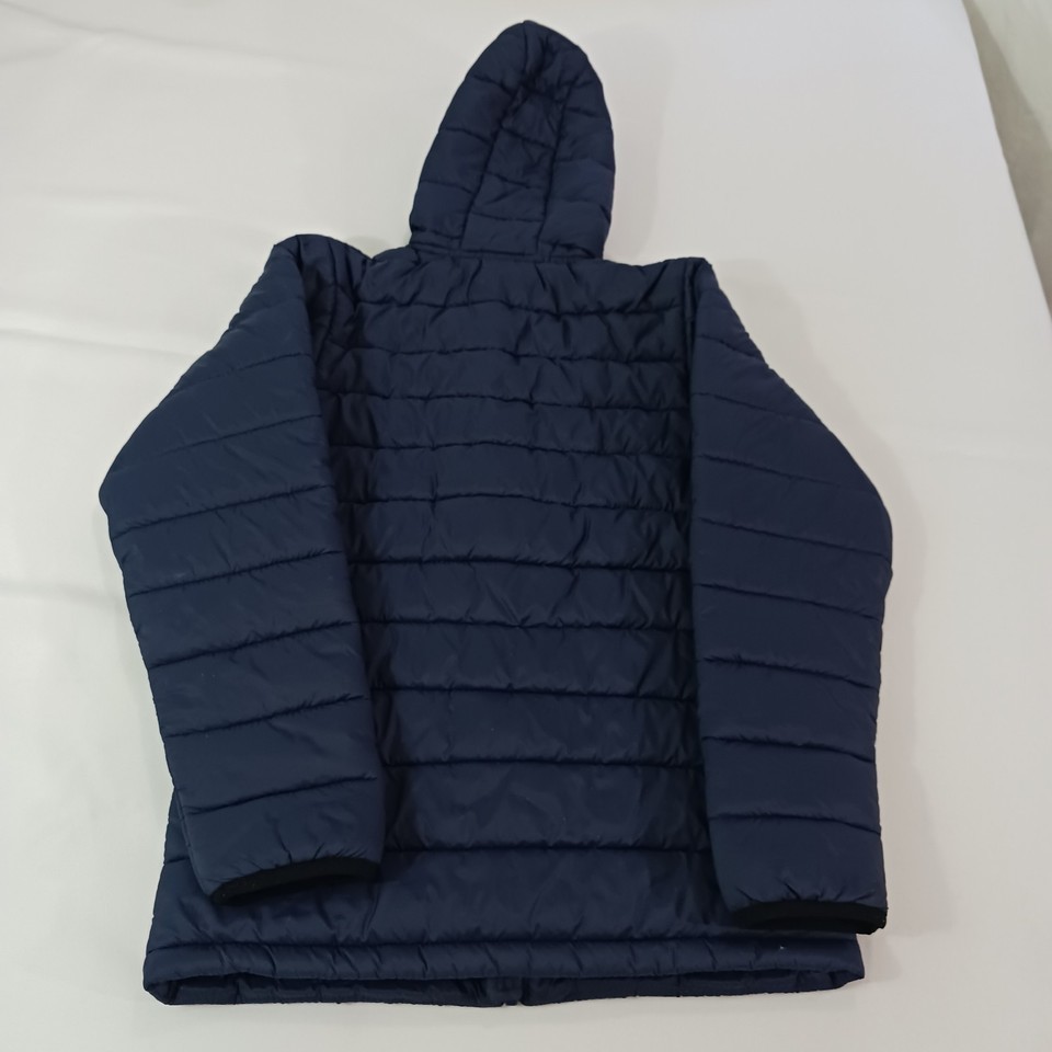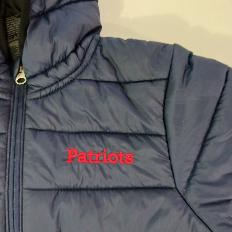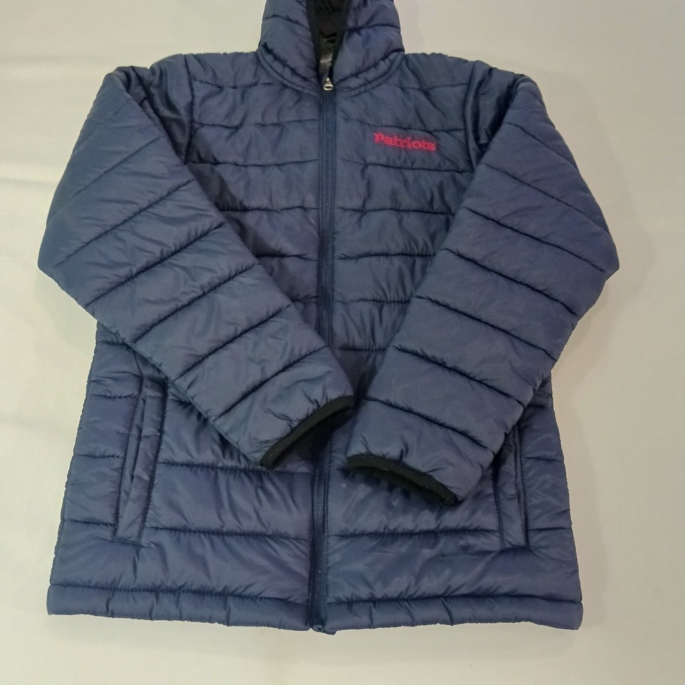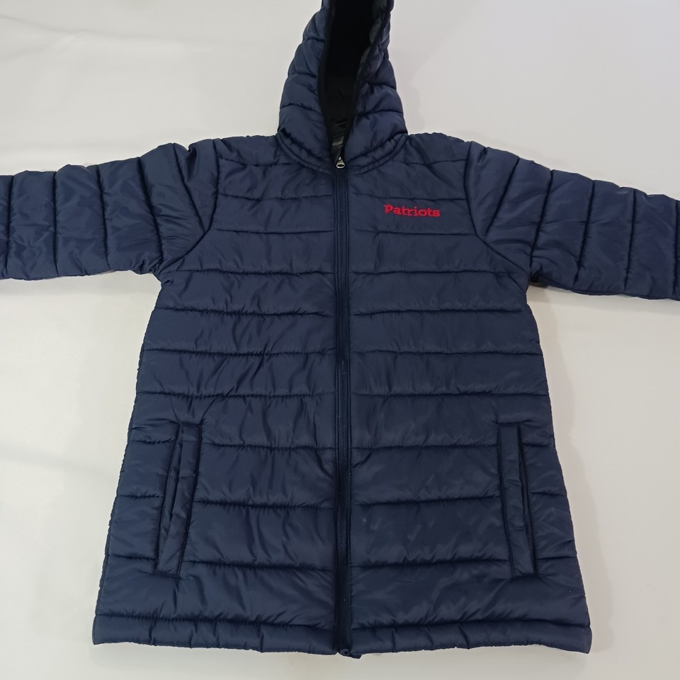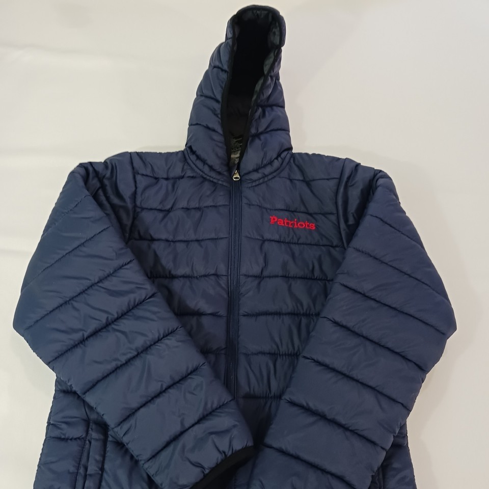 The product is a youth size medium (10/12) puffer hooded jacket coat in blue, featuring the official logo of the New England Patriots from the National Football League (NFL). It is officially licensed by the NFL team and designed for unisex children who are fans of the team. The jacket is a must-have for young fans looking to stay warm and show their support for the Patriots during football season.