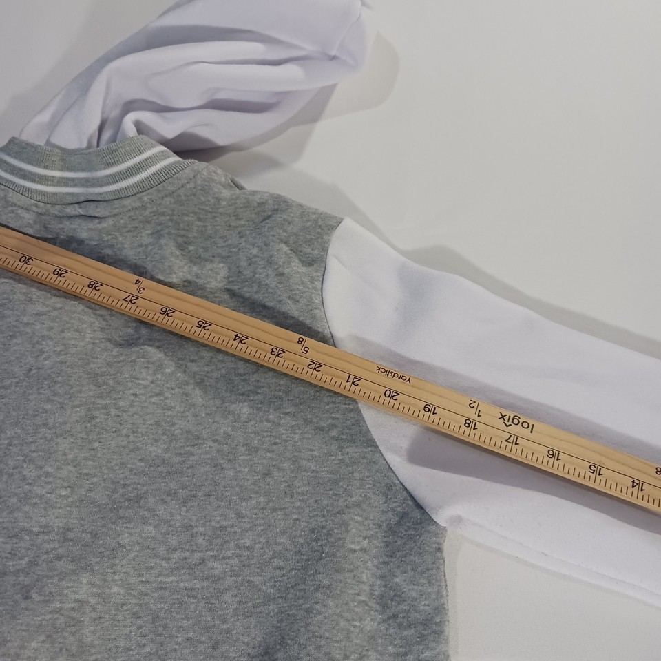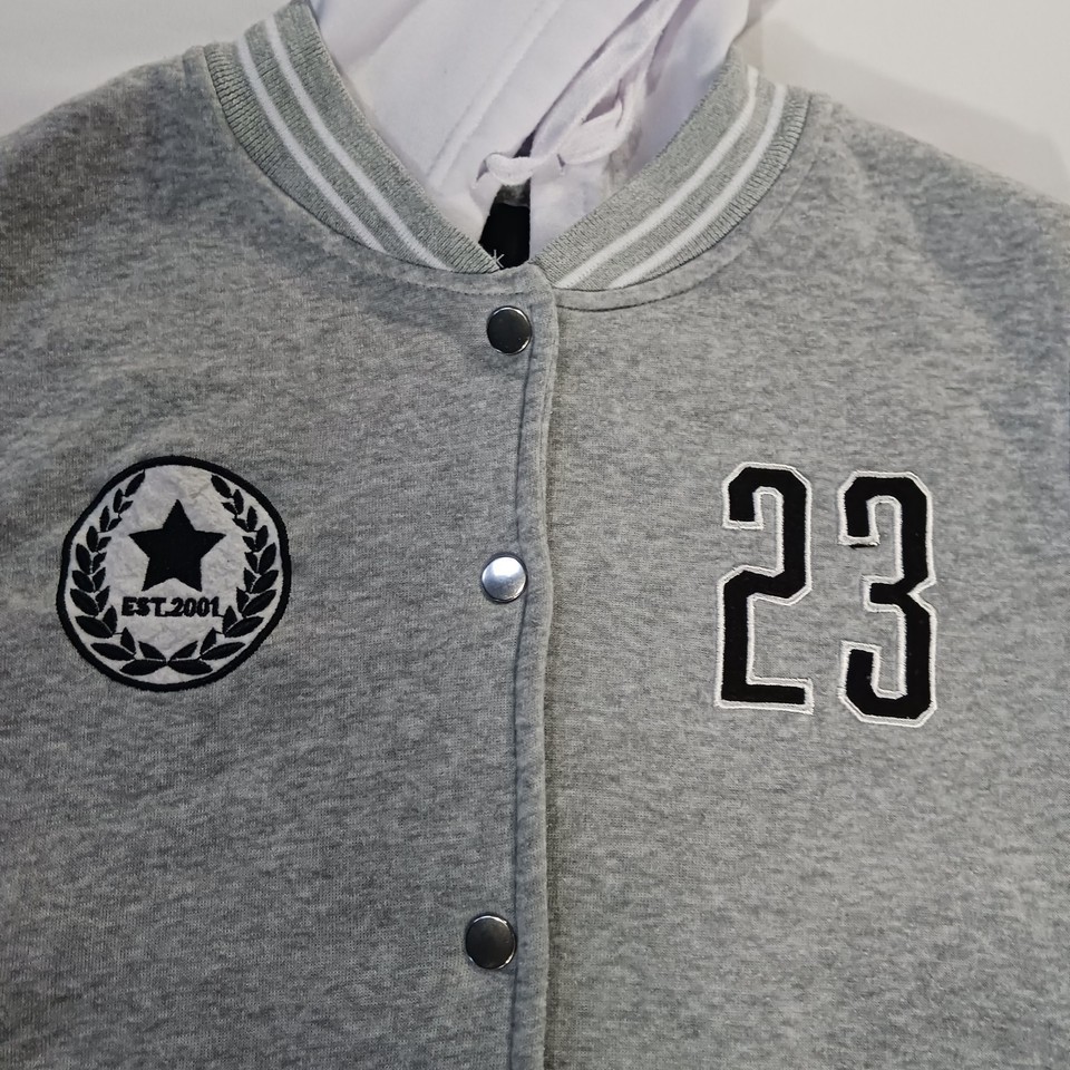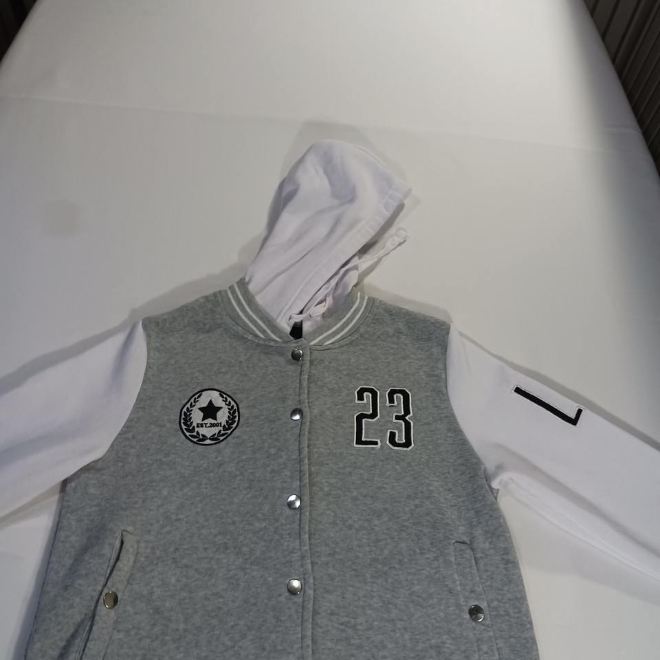 This New Look Varsity Jacket #23 in size Large is a stylish and versatile addition to any teen's wardrobe. Made from a comfortable cotton blend material with snap buttons and a hood, it is perfect for casual occasions during the winter, fall, and spring seasons. The gray and white color scheme, along with the sporty theme and various activities it can be worn for, adds a trendy and practical touch to this classic varsity jacket design. Perfect for layering up in style.