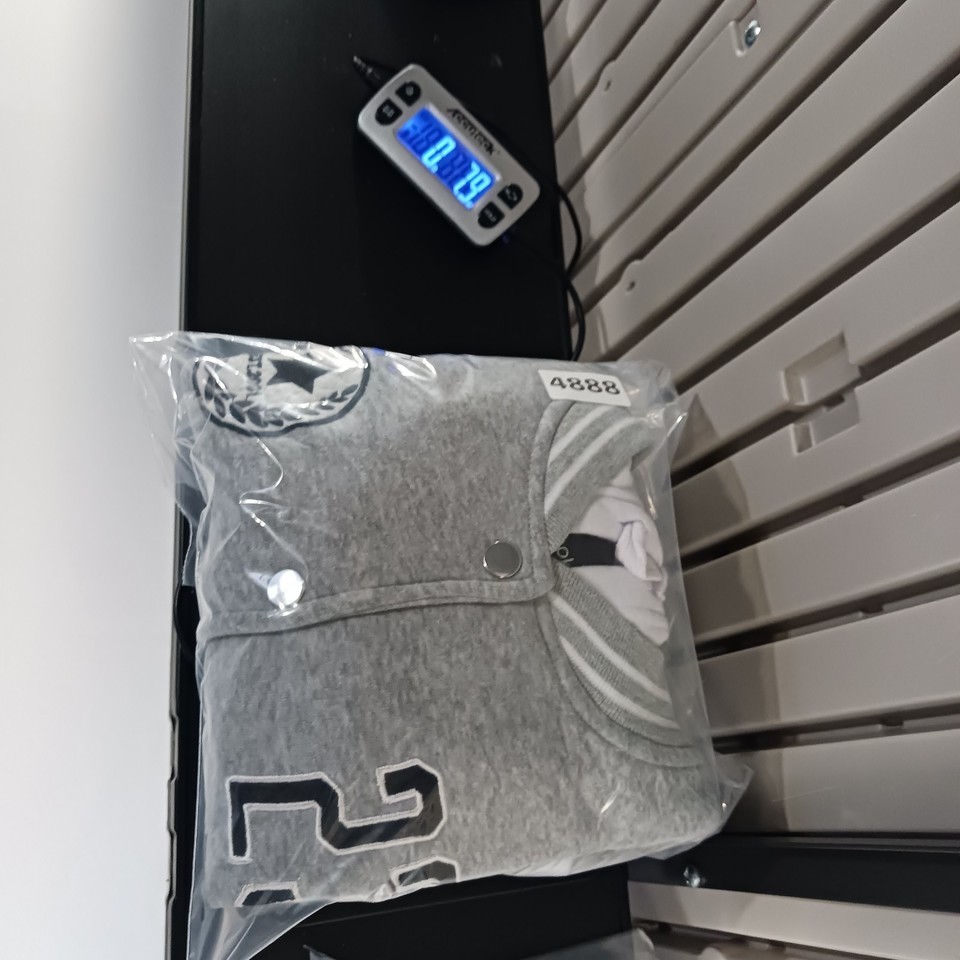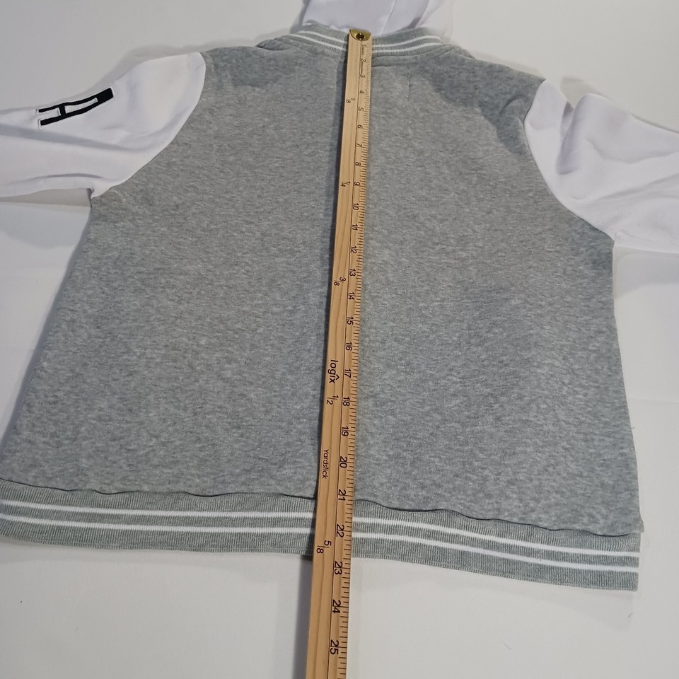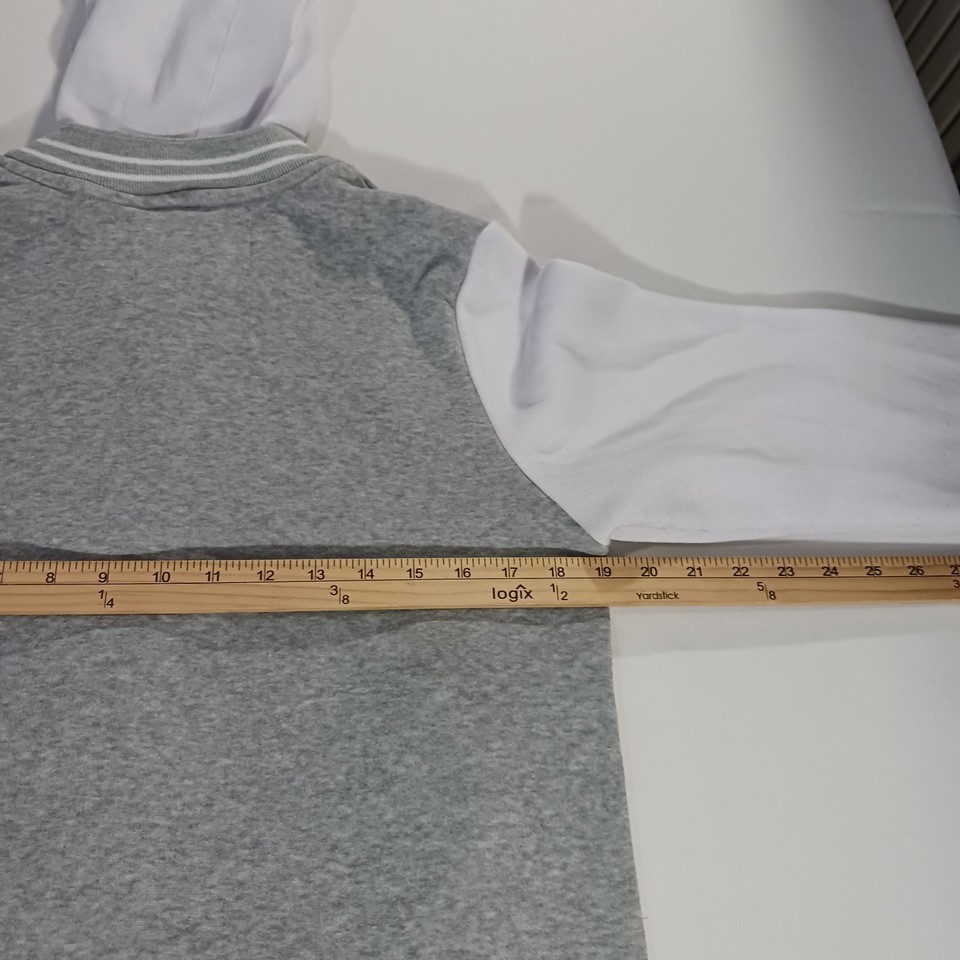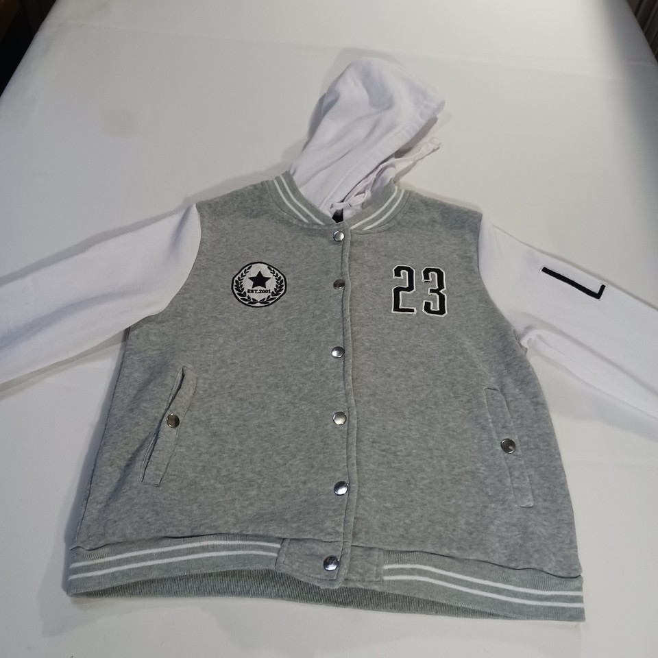This New Look Varsity Jacket #23 in size Large is a stylish and versatile addition to any teen's wardrobe. Made from a comfortable cotton blend material with snap buttons and a hood, it is perfect for casual occasions during the winter, fall, and spring seasons. The gray and white color scheme, along with the sporty theme and various activities it can be worn for, adds a trendy and practical touch to this classic varsity jacket design. Perfect for layering up in style.