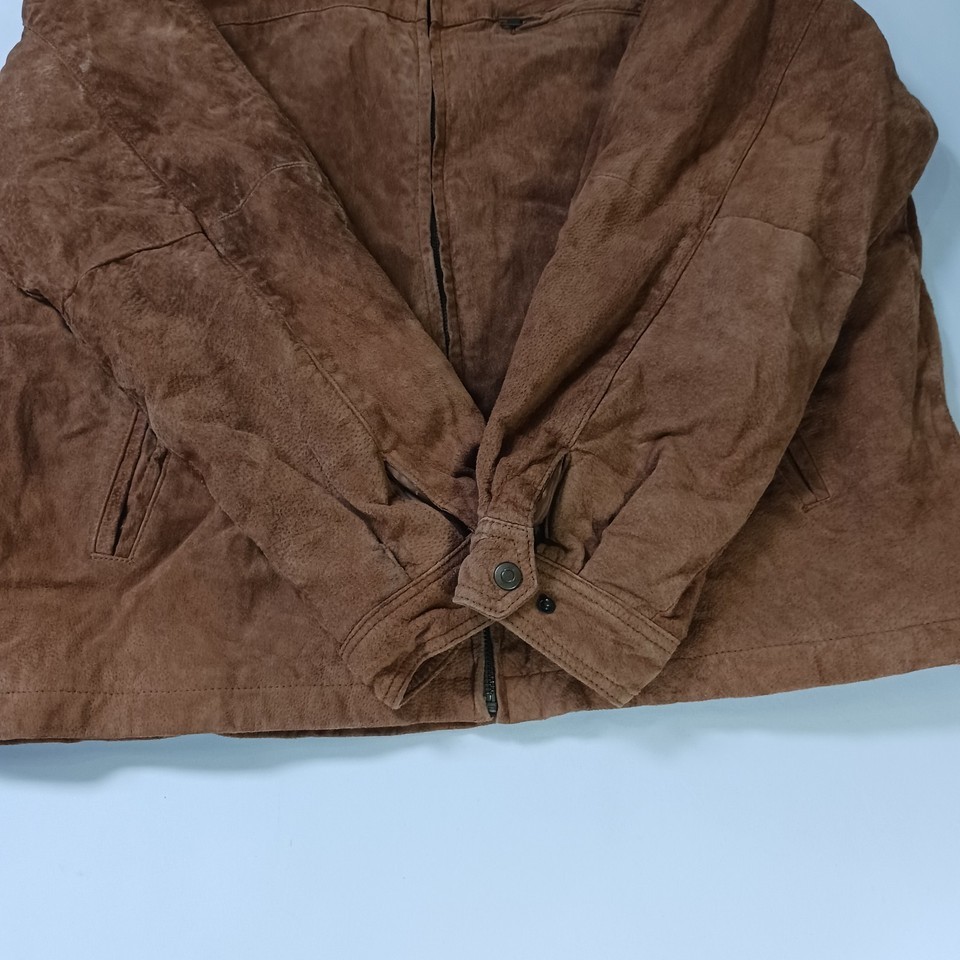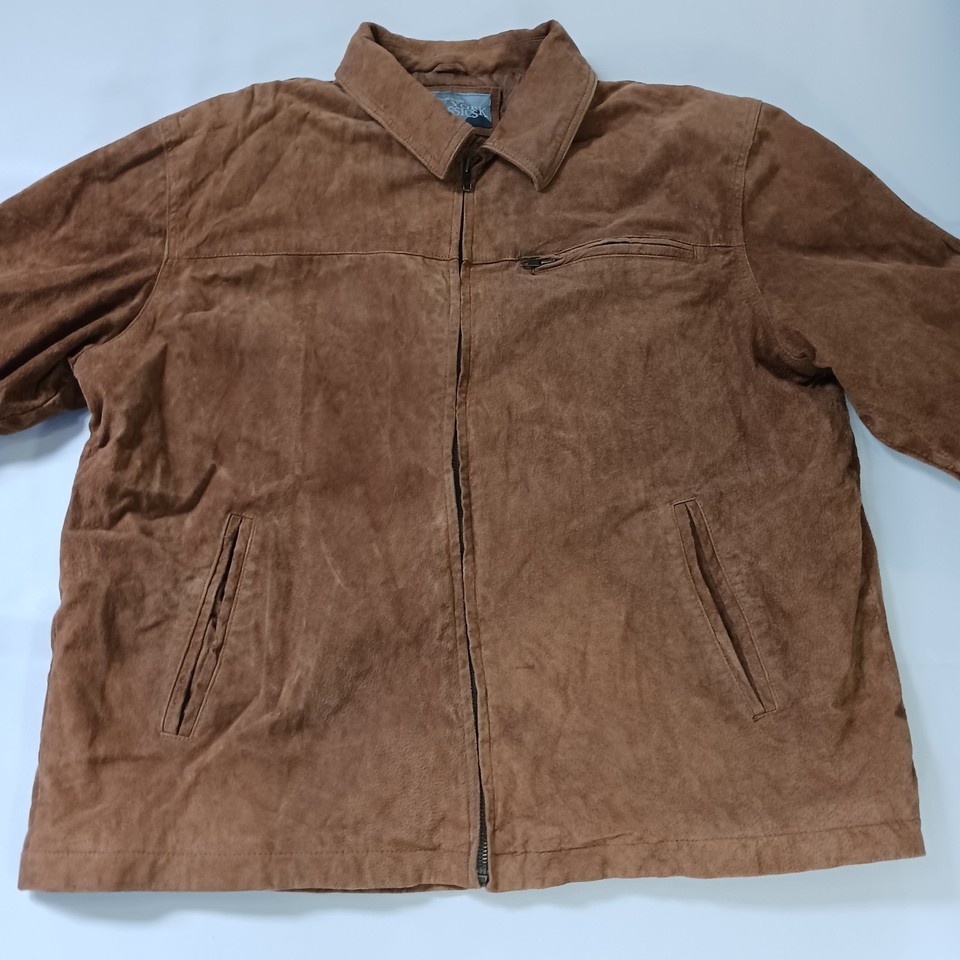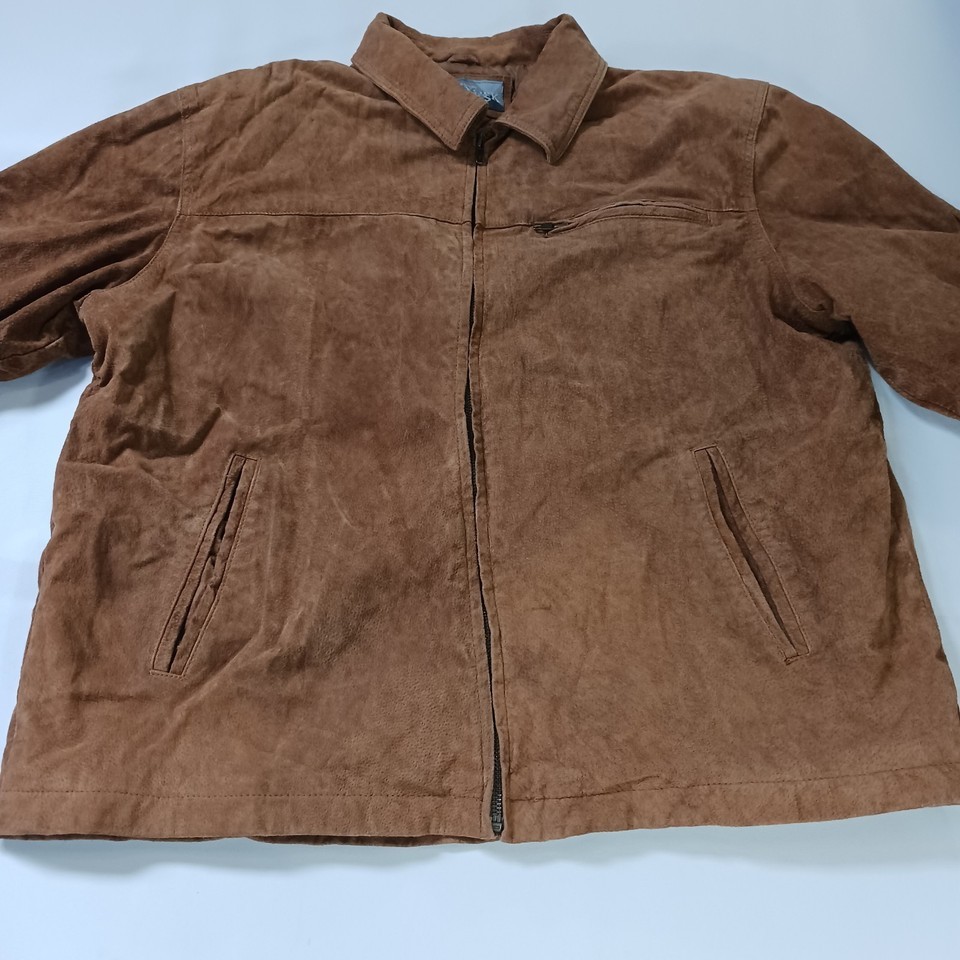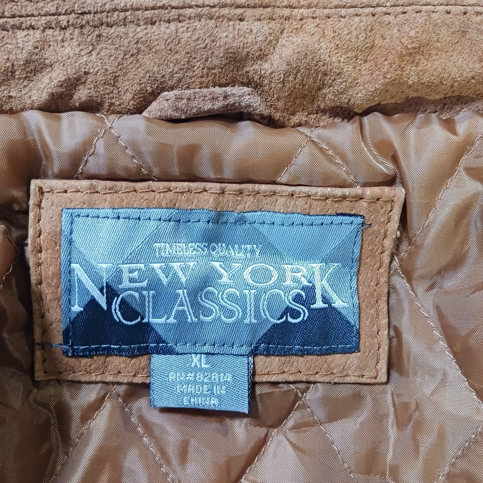 The New York Classics RN#82814 Men's Brown Genuine Leather Full Zip Jacket in size XL is a stylish and classic outerwear piece for men. Made from high-quality leather with a solid pattern, this jacket features long sleeves and a full zip closure for a convenient and easy wear. The jacket has a durable polyester lining and is designed by the reputable brand New York Classics, ensuring both style and quality. This versatile jacket in a timeless brown color can be a perfect addition to any man's wardrobe, suitable for various occasions.