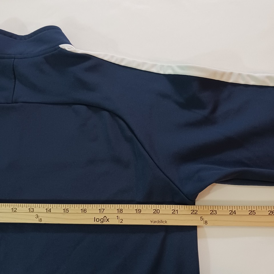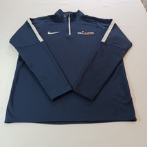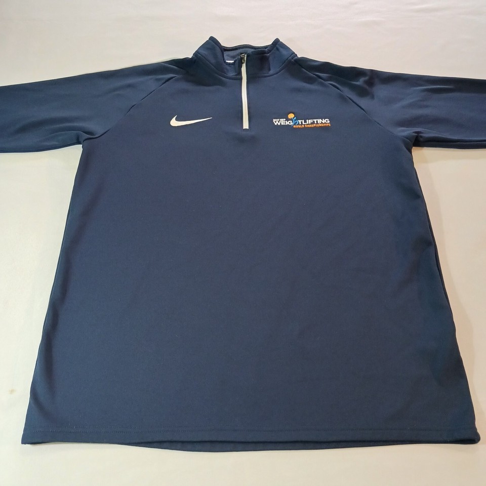 Elevate your weight lifting game with this Nike Dri-Fit sweatshirt, designed for the 2017 IWF Weight Lifting Championship. The blue pullover features a solid pattern, long sleeves, and a mock neck with a 1/4 zip closure. Made with machine washable polyester material, this regular fit sweatshirt is perfect for any season, whether it be winter, summer, or spring.
