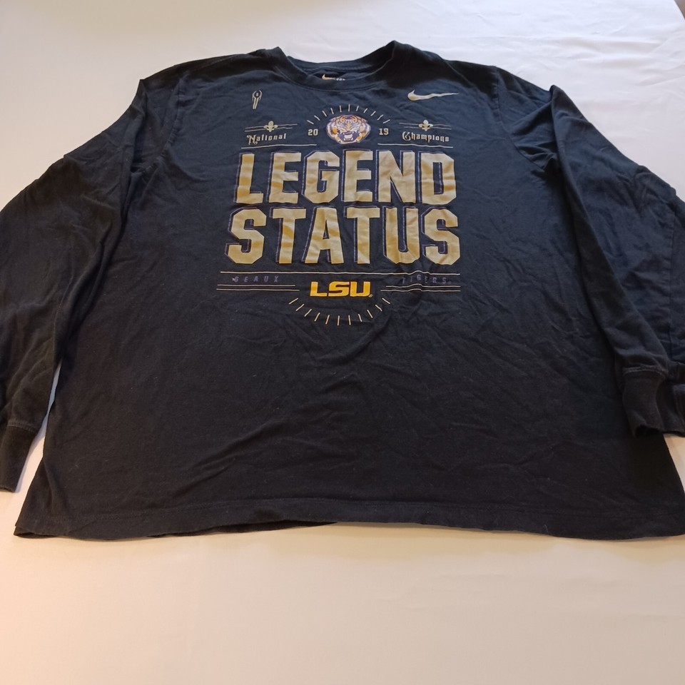 Show off your team spirit with this Nike LSU Tigers 2019 National Champion Legend Status Long Sleeve T-Shirt. This black cotton shirt features a crew neck and long sleeves, making it perfect for cooler weather. The shirt's solid pattern and Nike logo accents add a stylish touch to the design.