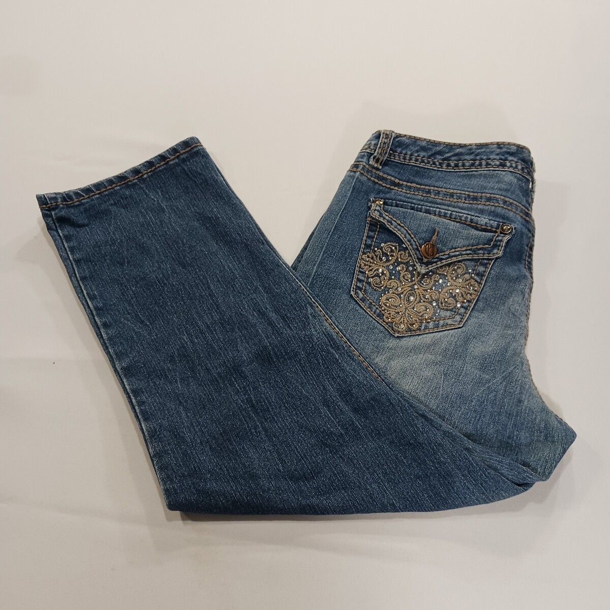 The Nine West RN#89828 Women's Blue Cotton Blend Denim Cropped Jeans Size 10 are a stylish and comfortable choice for women. Made of a dark wash denim fabric blend, these jeans feature a solid blue color with a mid-rise fit. The zip and button closure adds convenience, while the cropped style and easy-care features make them a practical addition to any wardrobe. With a waist size of 32 inches and an inseam of 25 inches, these jeans offer a regular fit and are perfect for everyday wear.
