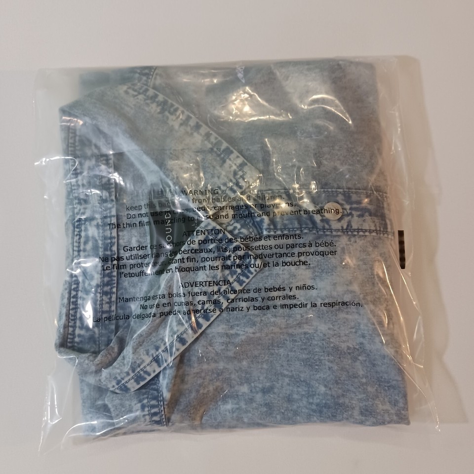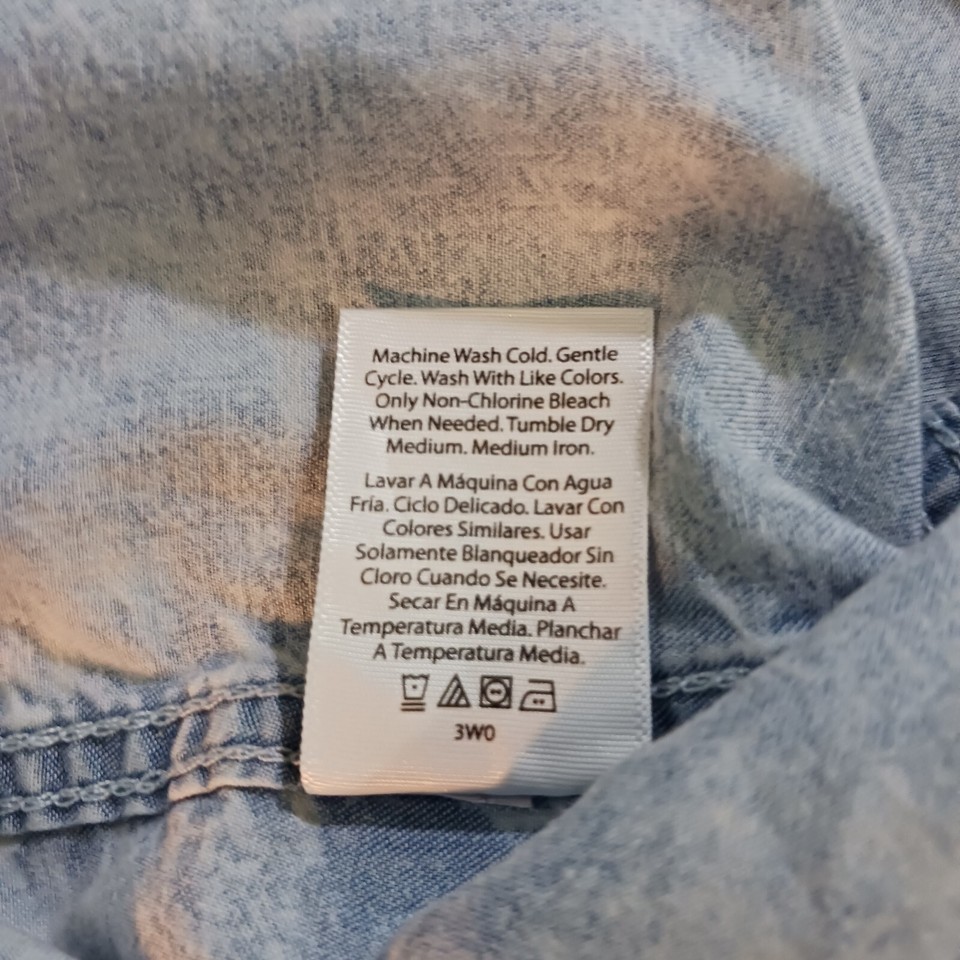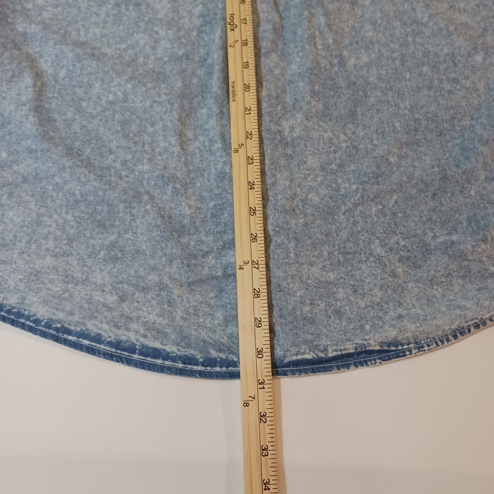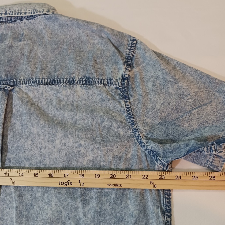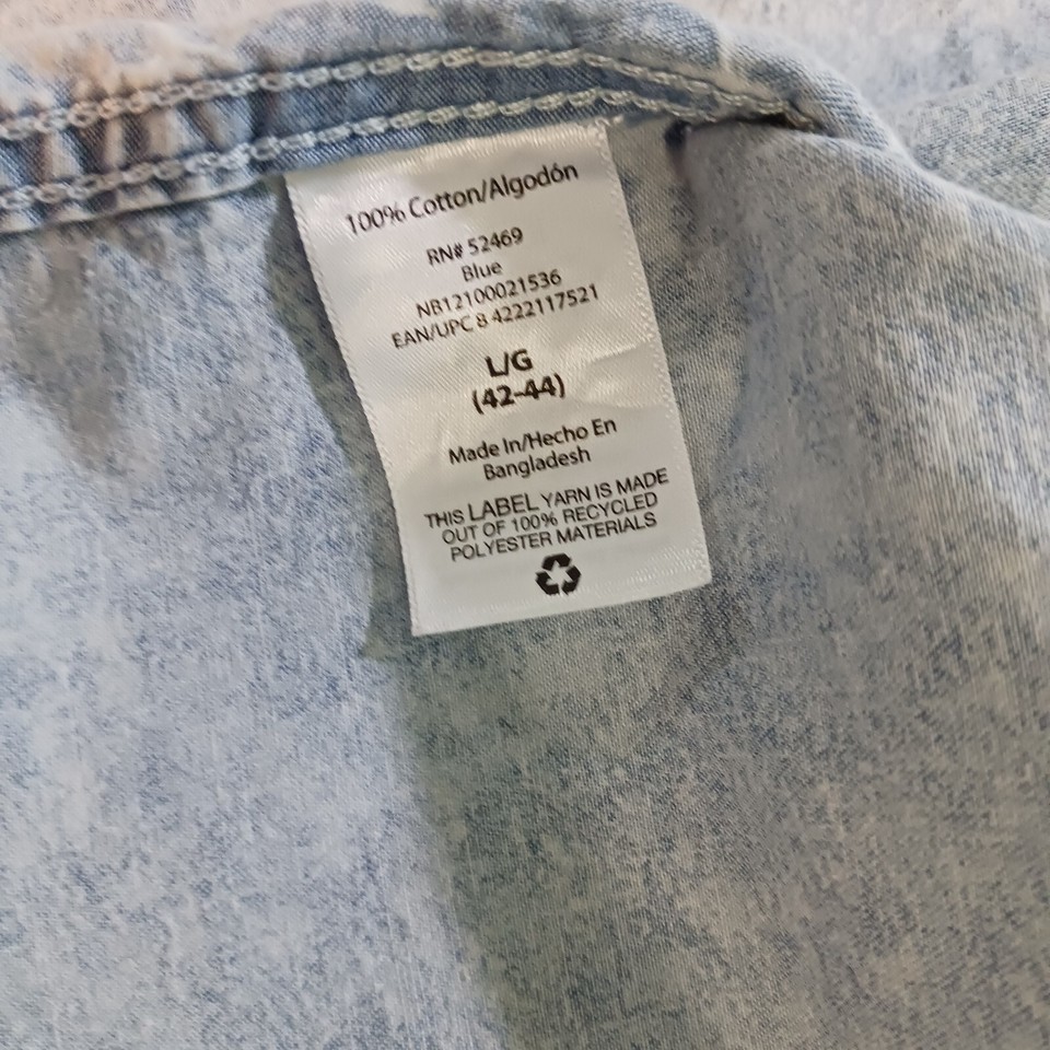 This is a pre-owned No Boundaries men's shirt made of woven cotton fabric in faded blue color. It has a collared neckline and a spread collar style. The closure is button-up with short sleeves and a pocket feature. The shirt is a regular fit and size L (42-44). It is a casual button-down shirt suitable for summer and spring seasons. The shirt is machine washable and made in Bangladesh.
