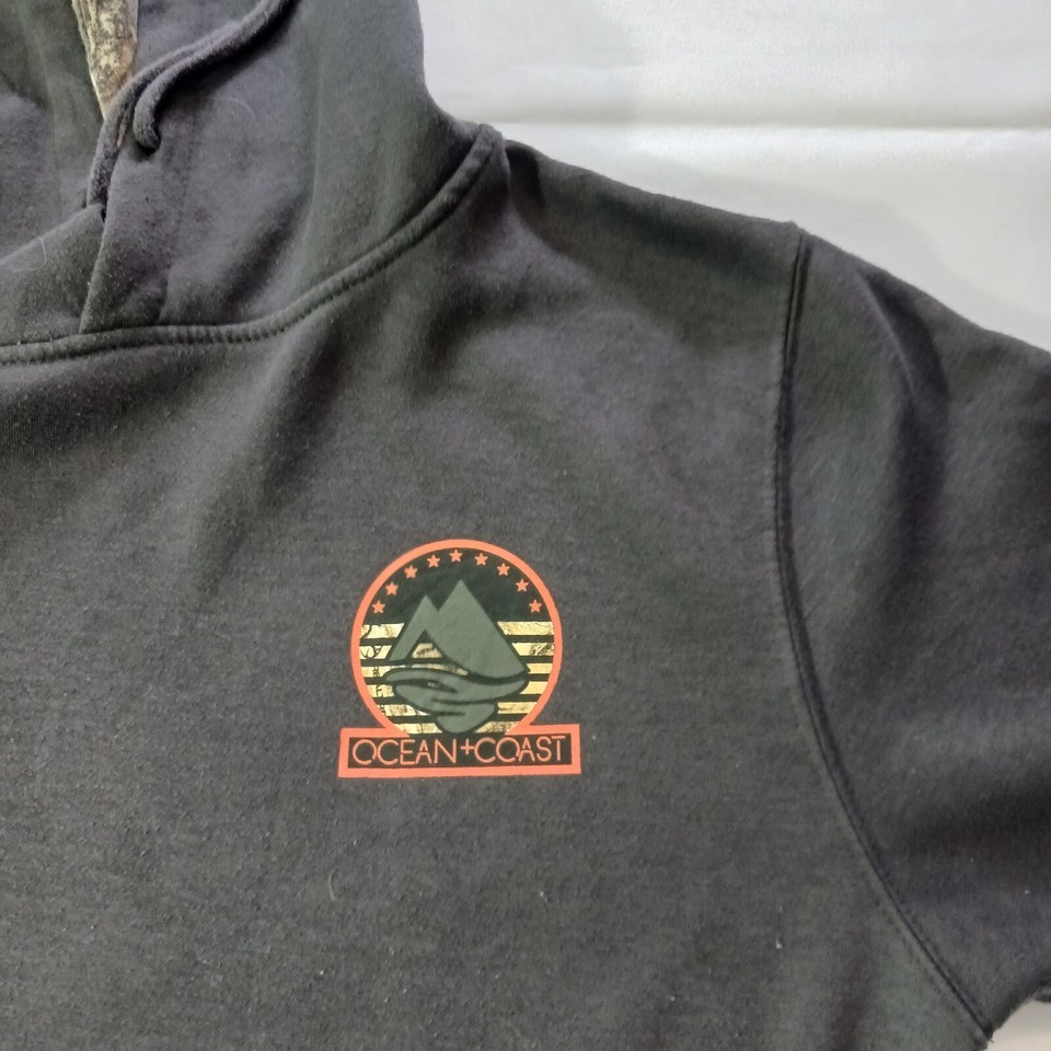 This Ocean + Coast RealTree hoodie is perfect for the outdoor activity enthusiast. With a solid pattern and camouflage accents, it features a drawstring closure and a round neck for a comfortable fit. The long sleeve pullover sweatshirt is made of a polyester and cotton blend fleece fabric, making it perfect for winter and fall seasons.