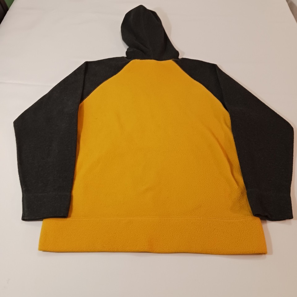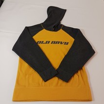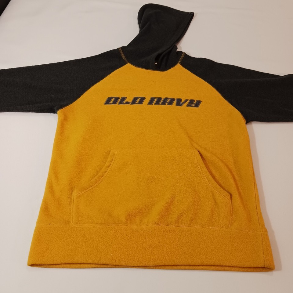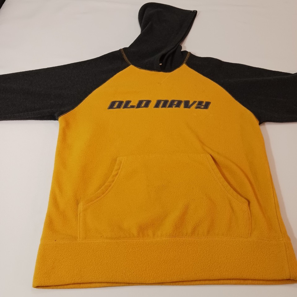 This Old Navy Men's Fleece Pullover Hoodie Sweatshirt features a solid design in red with long sleeves and a drawstring closure. Made of a blend of polyester and cotton fleece fabric, it is machine washable and size L. The hoodie is adorned with embroidered and logo accents, making it a stylish choice for casual wear. The design includes graphic prints related to school, USA, university, American culture, and sports, suitable for all seasons and various activities like gym training, running, and football.