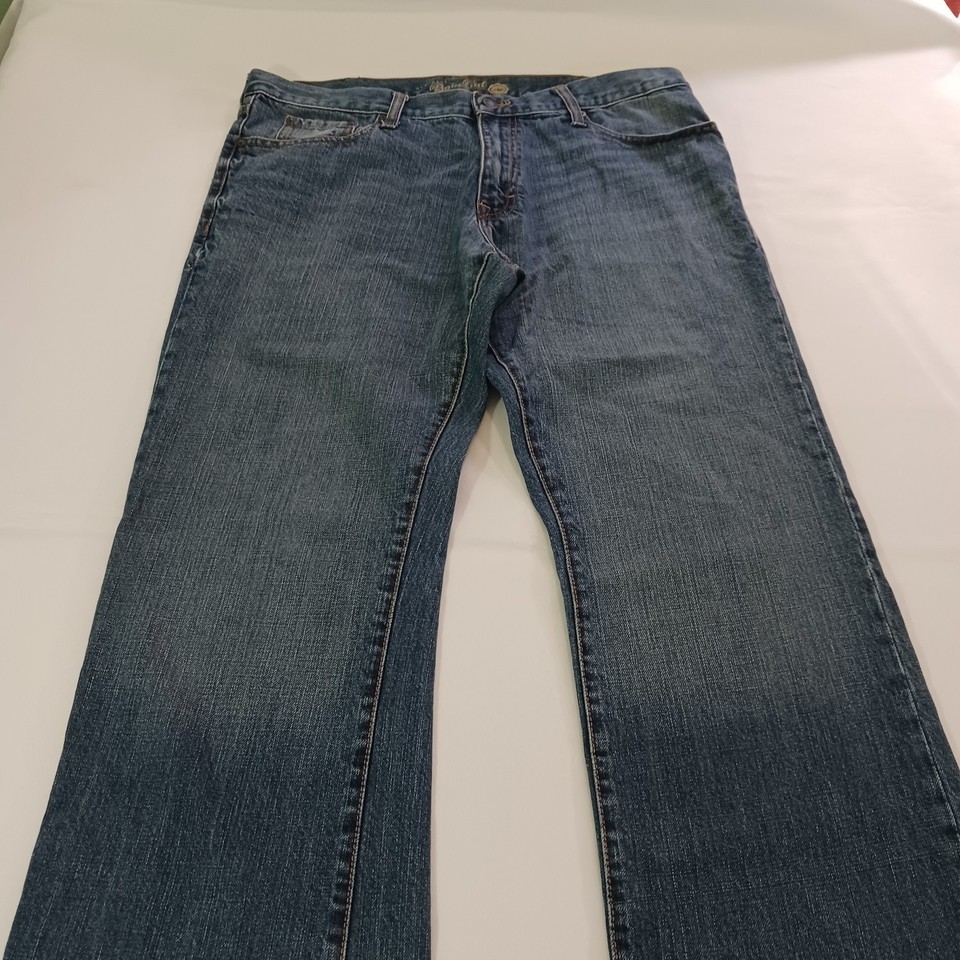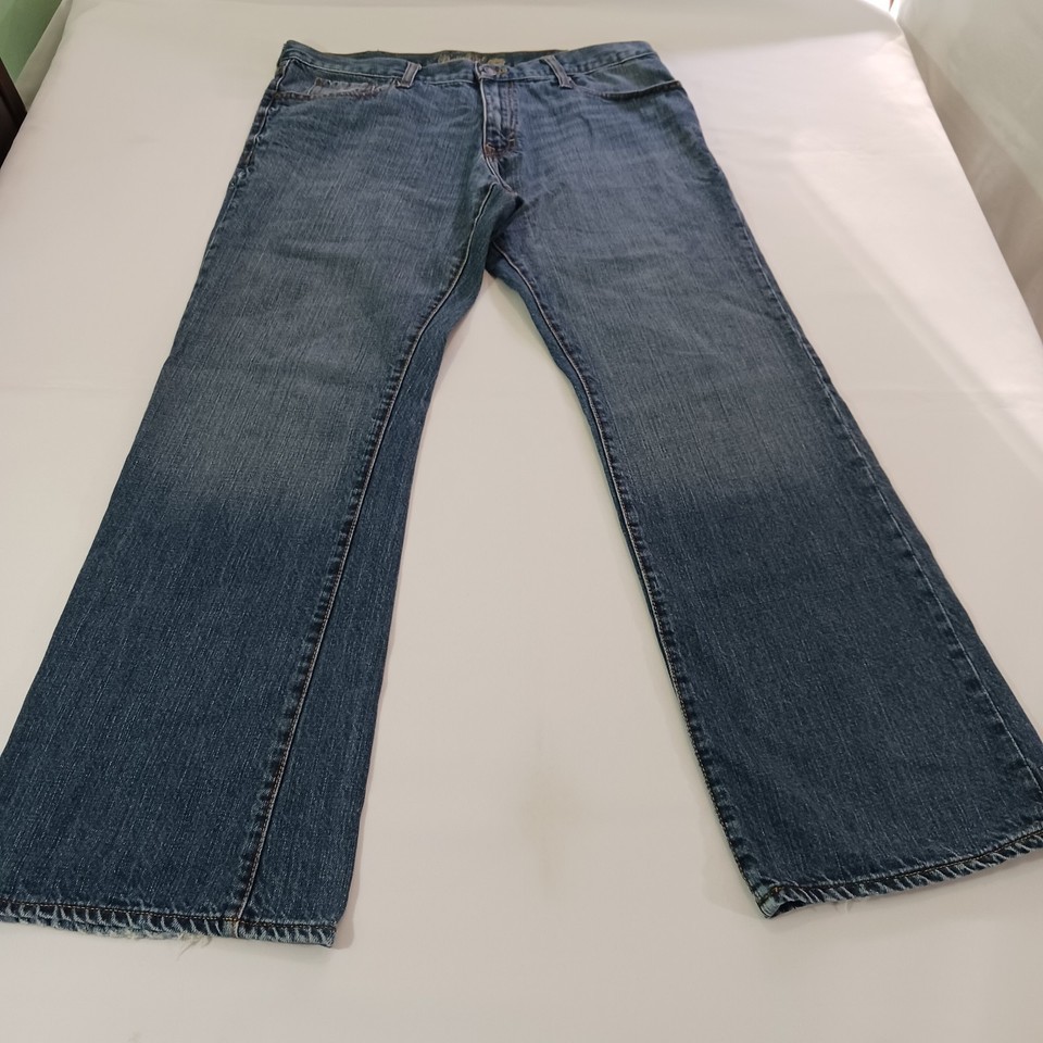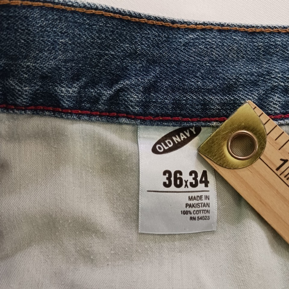This is a pair of Old Navy Bootcut jeans for women in a size 38x32. The jeans are made of blue denim with a solid pattern and a high rise waist measuring 38 inches. They feature a zip closure, are made of cotton with some stretch, and have pockets. The style is modern with a bootcut design, suitable for regular fit. These jeans are from Old Navy and were manufactured in Pakistan.
