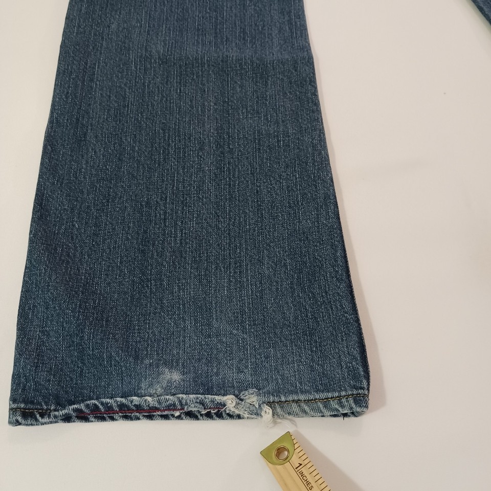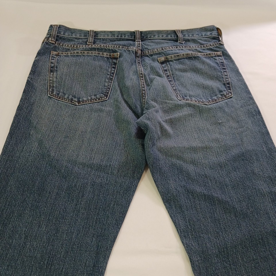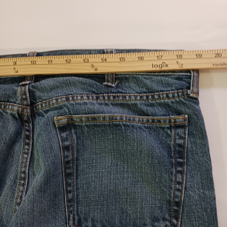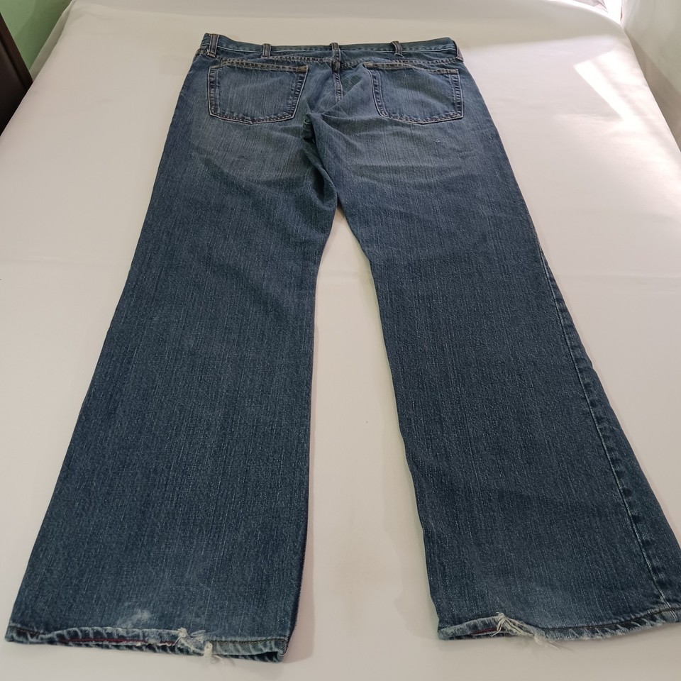 This is a pair of Old Navy Bootcut jeans for women in a size 38x32. The jeans are made of blue denim with a solid pattern and a high rise waist measuring 38 inches. They feature a zip closure, are made of cotton with some stretch, and have pockets. The style is modern with a bootcut design, suitable for regular fit. These jeans are from Old Navy and were manufactured in Pakistan.
