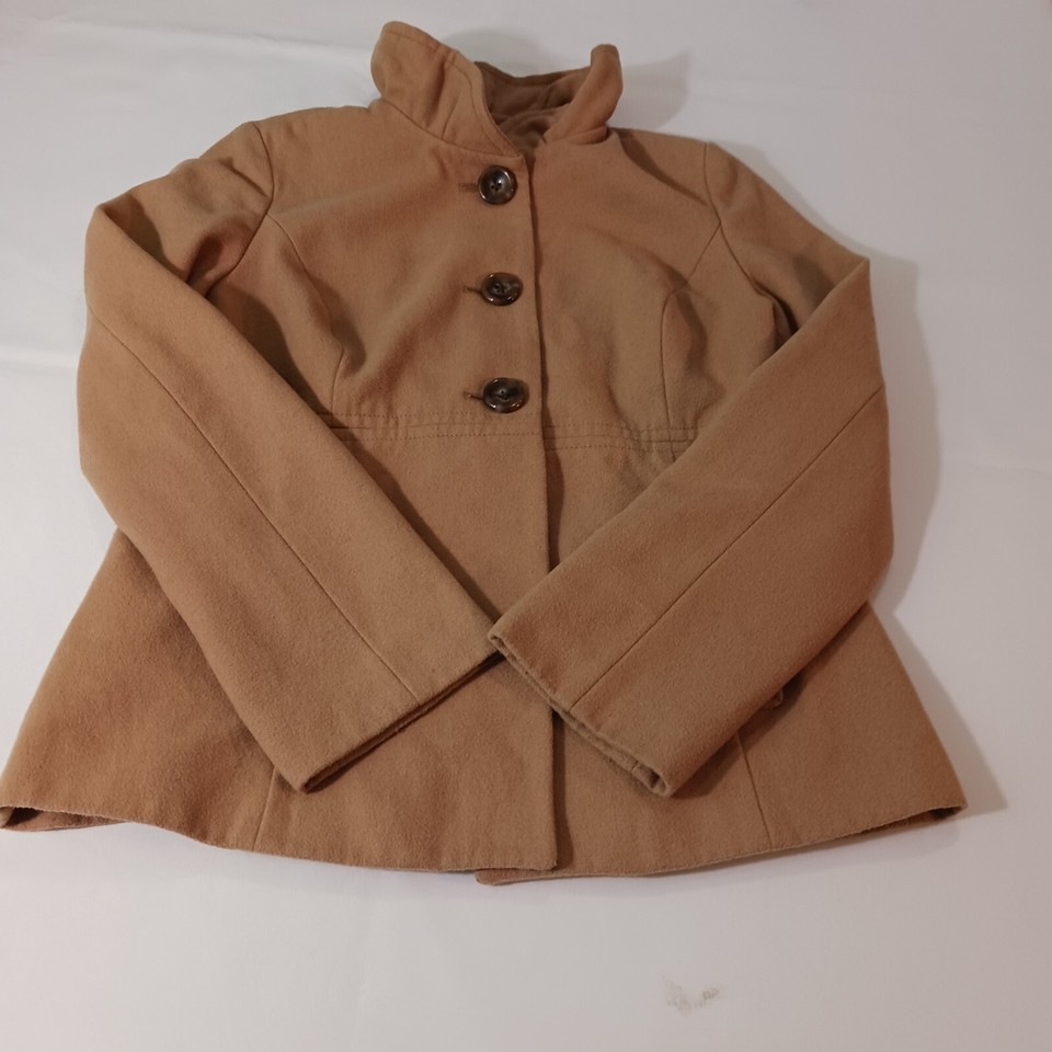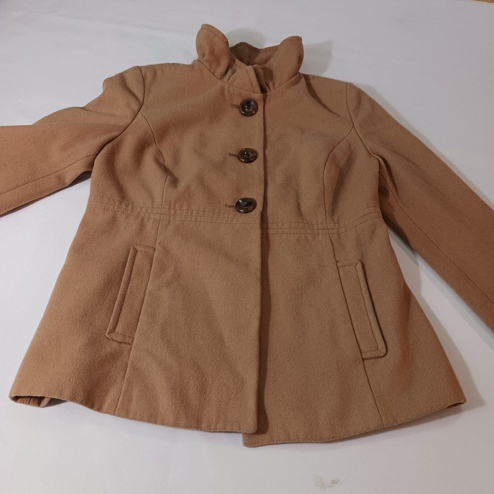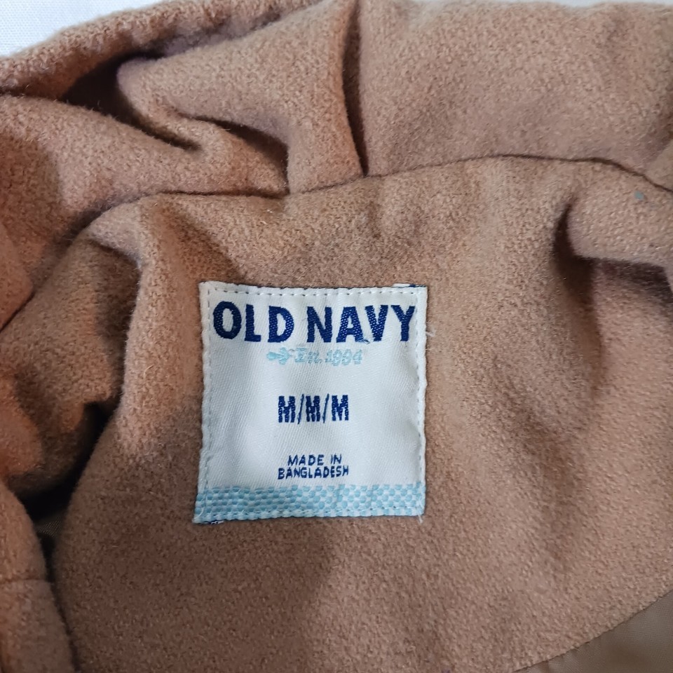 This Old Navy women's jacket features a camel color and a button front closure. It has a raffle collar and pockets for added convenience. The jacket is made of a blend of polyester, rayon, and wool, while the lining is made of polyester. The jacket/coat length is 25 inches, and the sleeves are long. The jacket is a size M and is designed for regular size women. It is a solid pattern jacket with a stylish design. The jacket is perfect for any occasion and can be worn with any outfit. It is a great addition to your wardrobe.