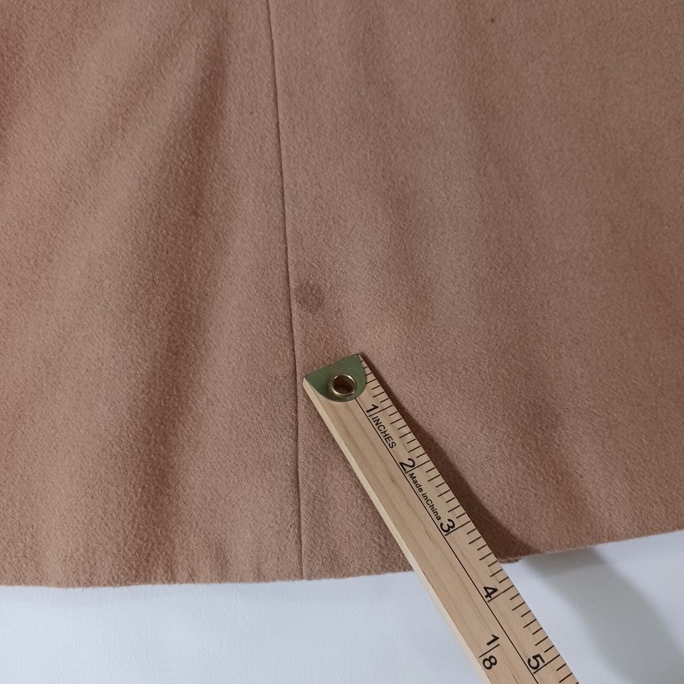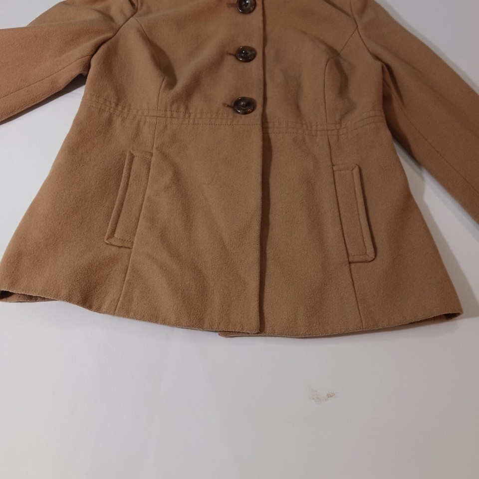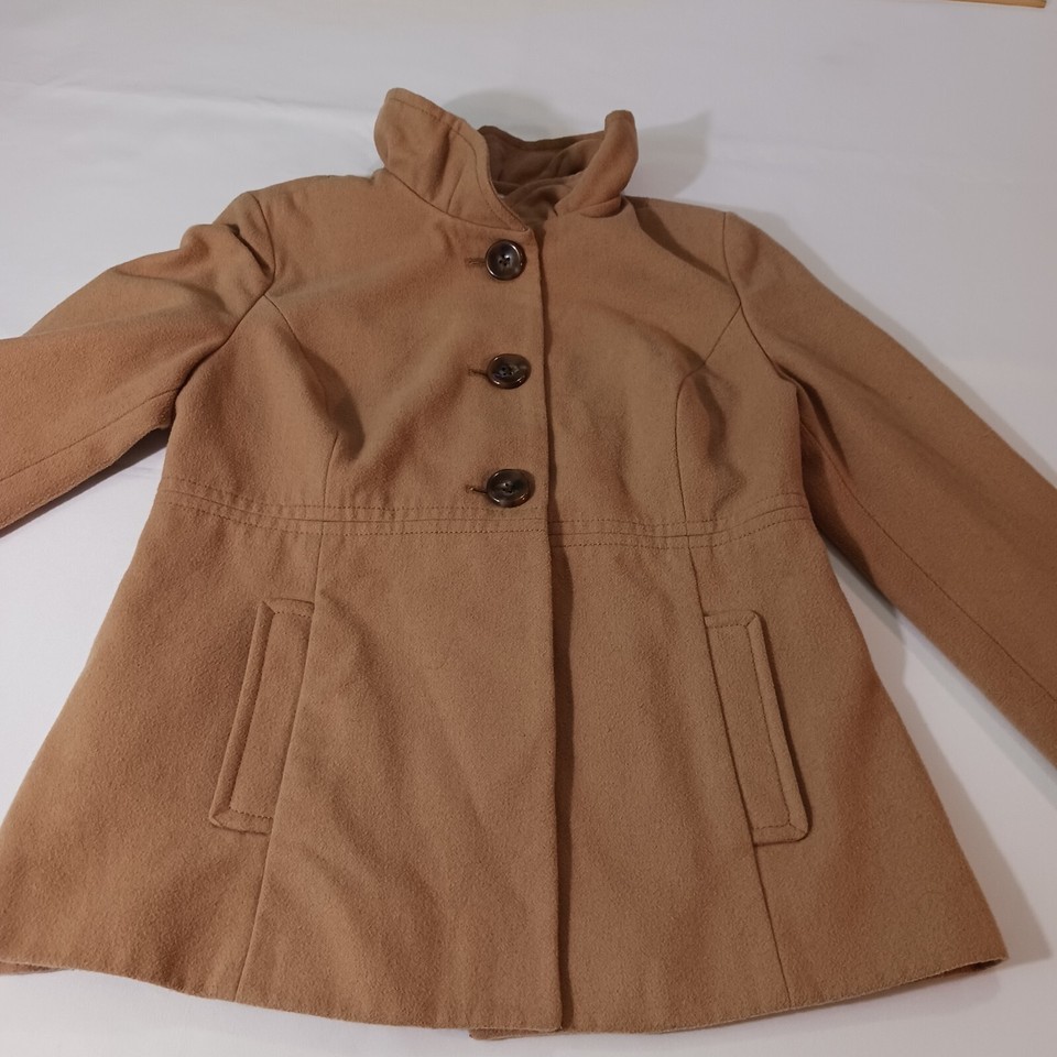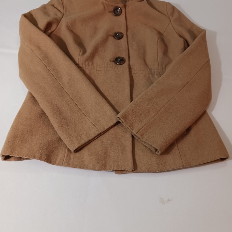 This Old Navy women's jacket features a camel color and a button front closure. It has a raffle collar and pockets for added convenience. The jacket is made of a blend of polyester, rayon, and wool, while the lining is made of polyester. The jacket/coat length is 25 inches, and the sleeves are long. The jacket is a size M and is designed for regular size women. It is a solid pattern jacket with a stylish design. The jacket is perfect for any occasion and can be worn with any outfit. It is a great addition to your wardrobe.