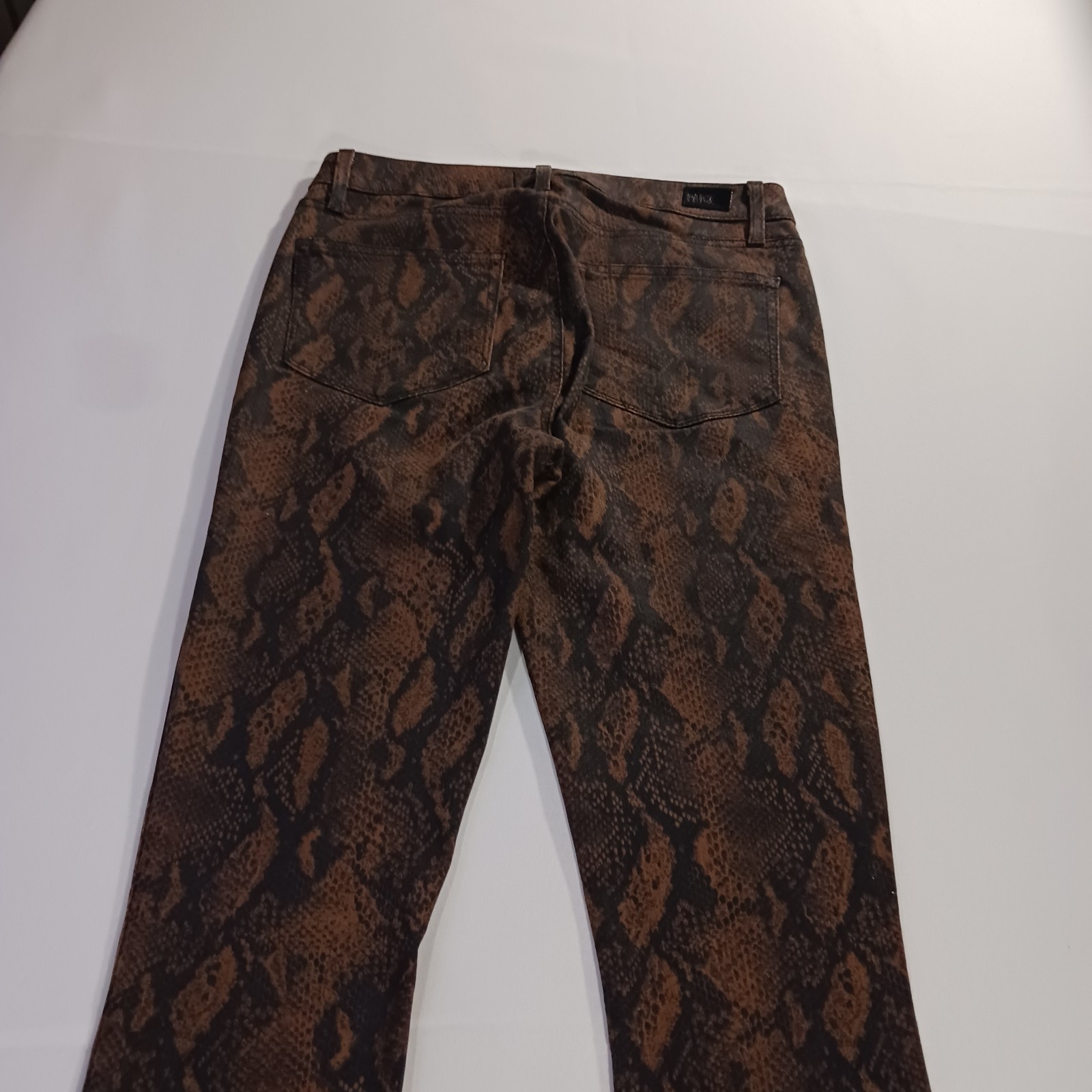 The product is a pair of Paige W6510 Women's Hoxton Ultra Skinny Coated Brown Snake Print Jeans in size 30. These jeans feature a stylish coated snake print pattern in brown, with a skinny style and a 30-inch inseam. Made with a blend of spandex, rayon, and cotton, these jeans have a zip and button closure and are designed for women in a regular size fit. The brand Paige is known for its quality and trendy designs, making these jeans a fashionable choice for those looking to add a unique touch to their wardrobe.
