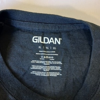 The product is a men's black cotton graphic t-shirt in size XL, specifically designed by Gildan with a regular fit. The shirt features a solid pattern, short sleeves, a crew neck neckline, and is suitable for all seasons. Made from cotton, this t-shirt is a versatile and comfortable option for everyday wear.