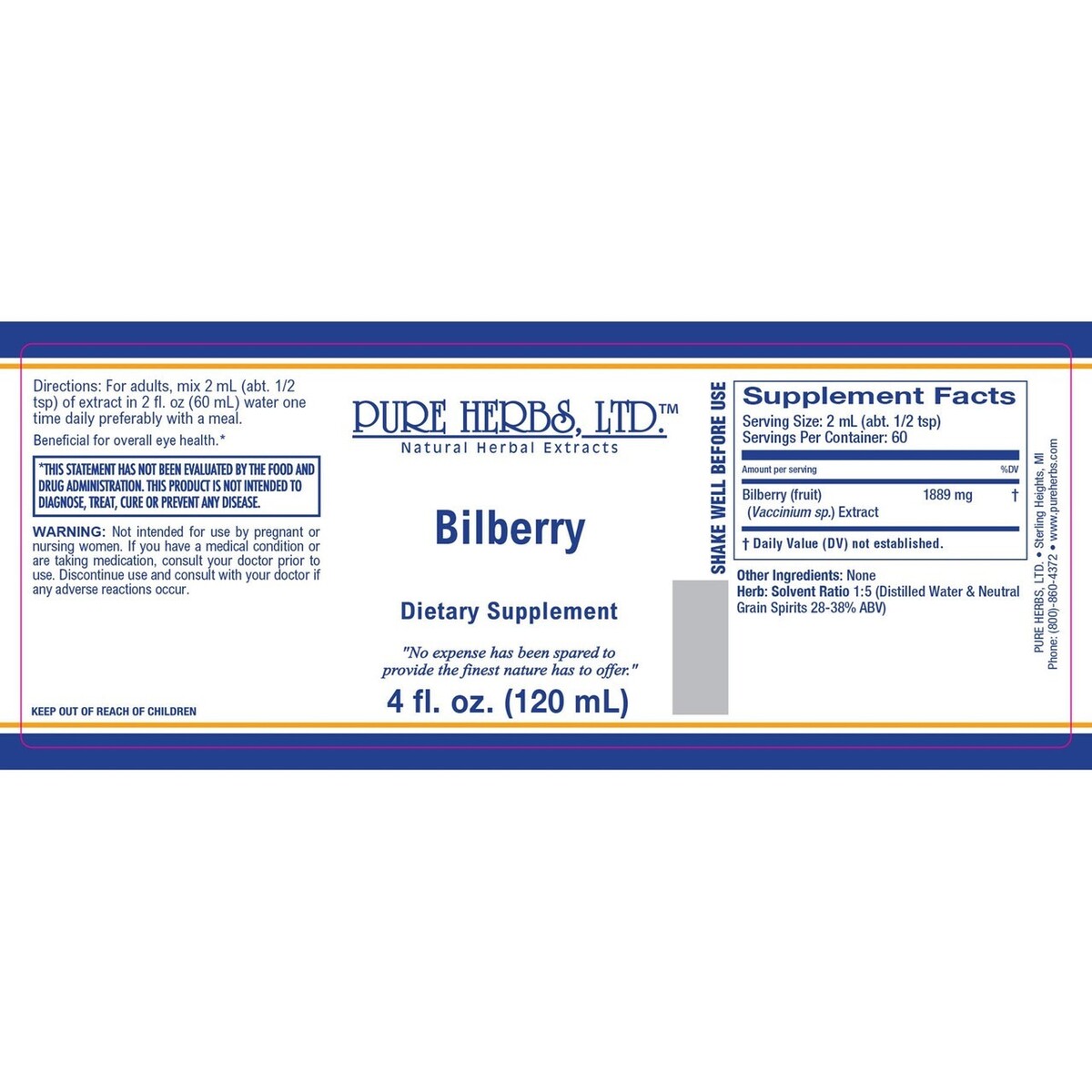 Pure Herbs: Bilberry - 4 oz. (Natural Herbal Extracts).
