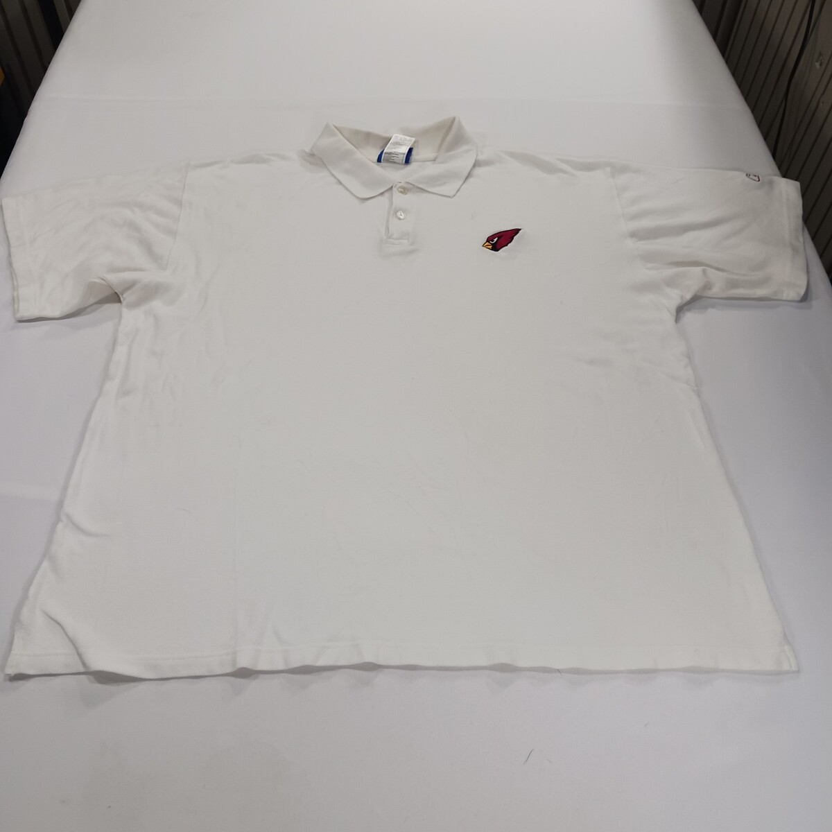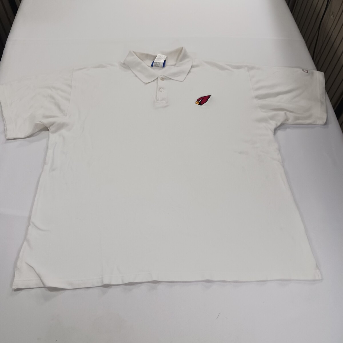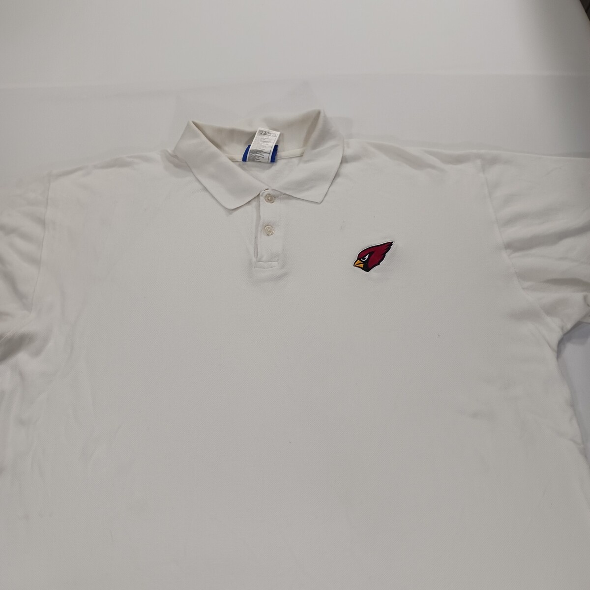 The product is a Reebok NFL short sleeve button-down Arizona Cardinals polo shirt in white, size 2XL. This officially licensed shirt is perfect for male fans of the National Football League (NFL) and the Arizona Cardinals. Made by a trusted brand like Reebok, this shirt combines style and team spirit, making it a must-have for any football enthusiast.