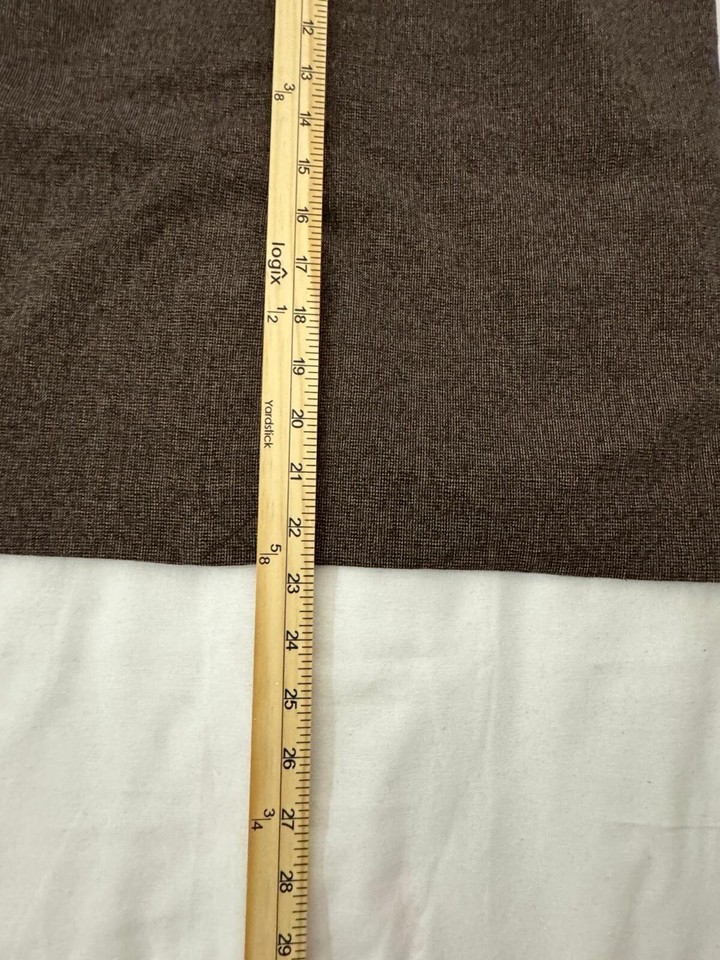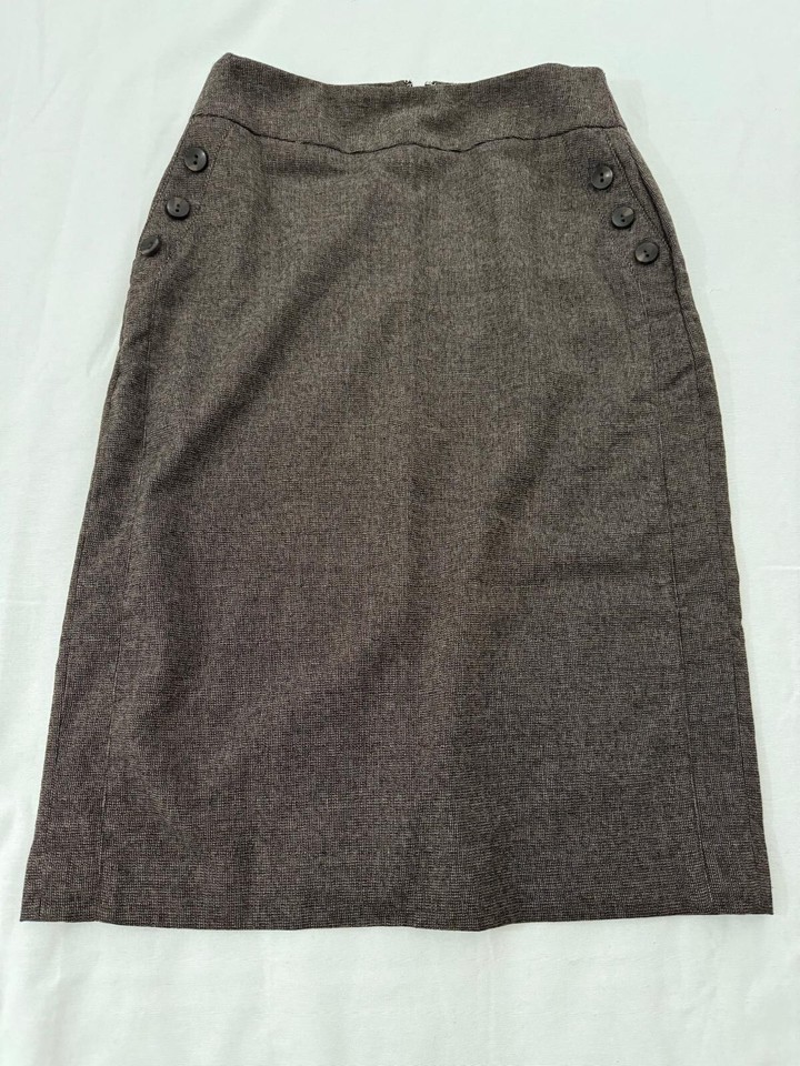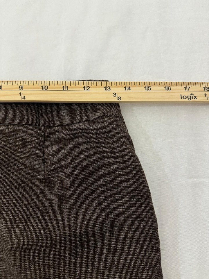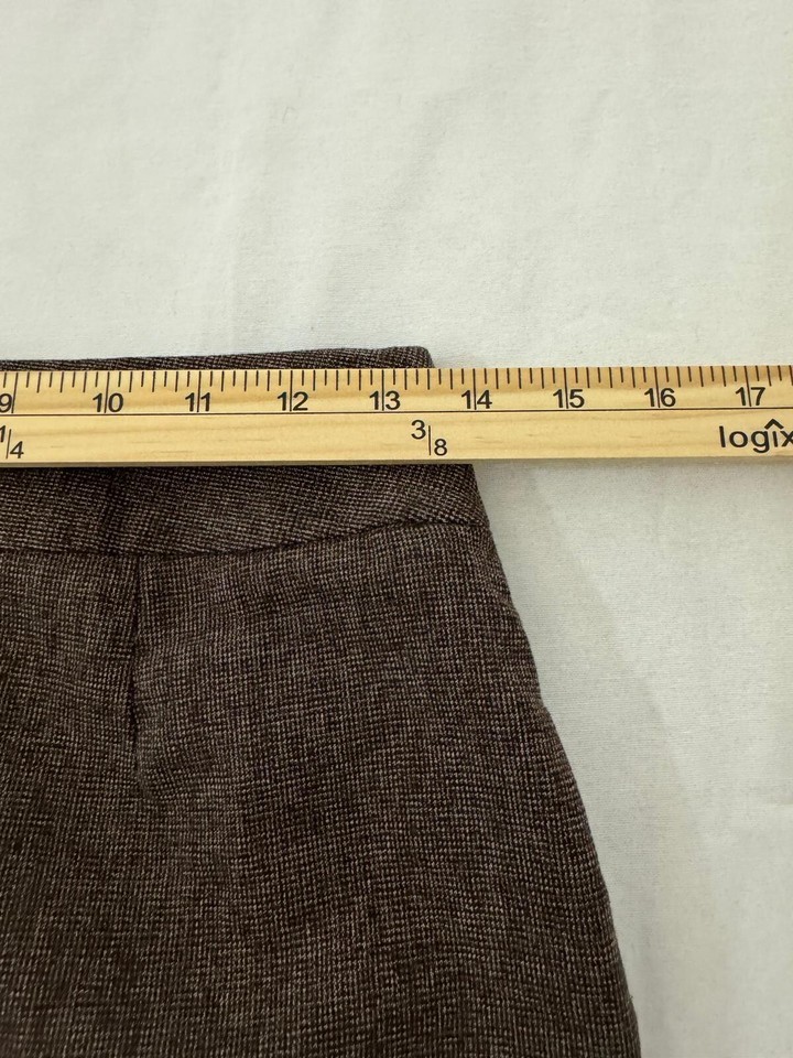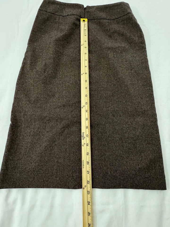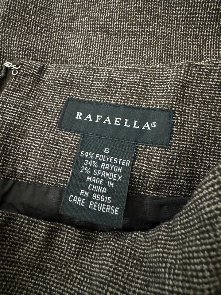 This is a Rafaella women's A-line skirt in brown, size 6 with a waist size of 27. It features a 1/4 rear zipper and a pull-on closure for easy wear. Made of polyester, spandex, and rayon, this skirt has a length of 23 inches and offers stretch for comfort. Suitable for casual occasions, it is machine washable and suitable for all seasons.