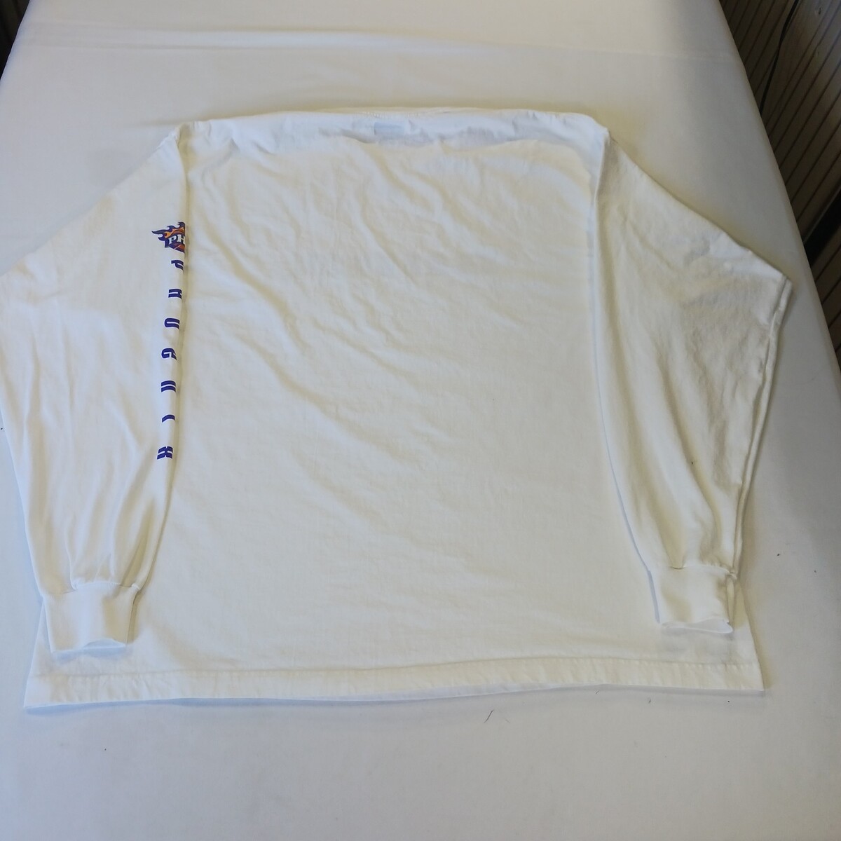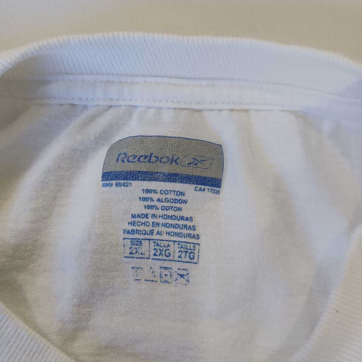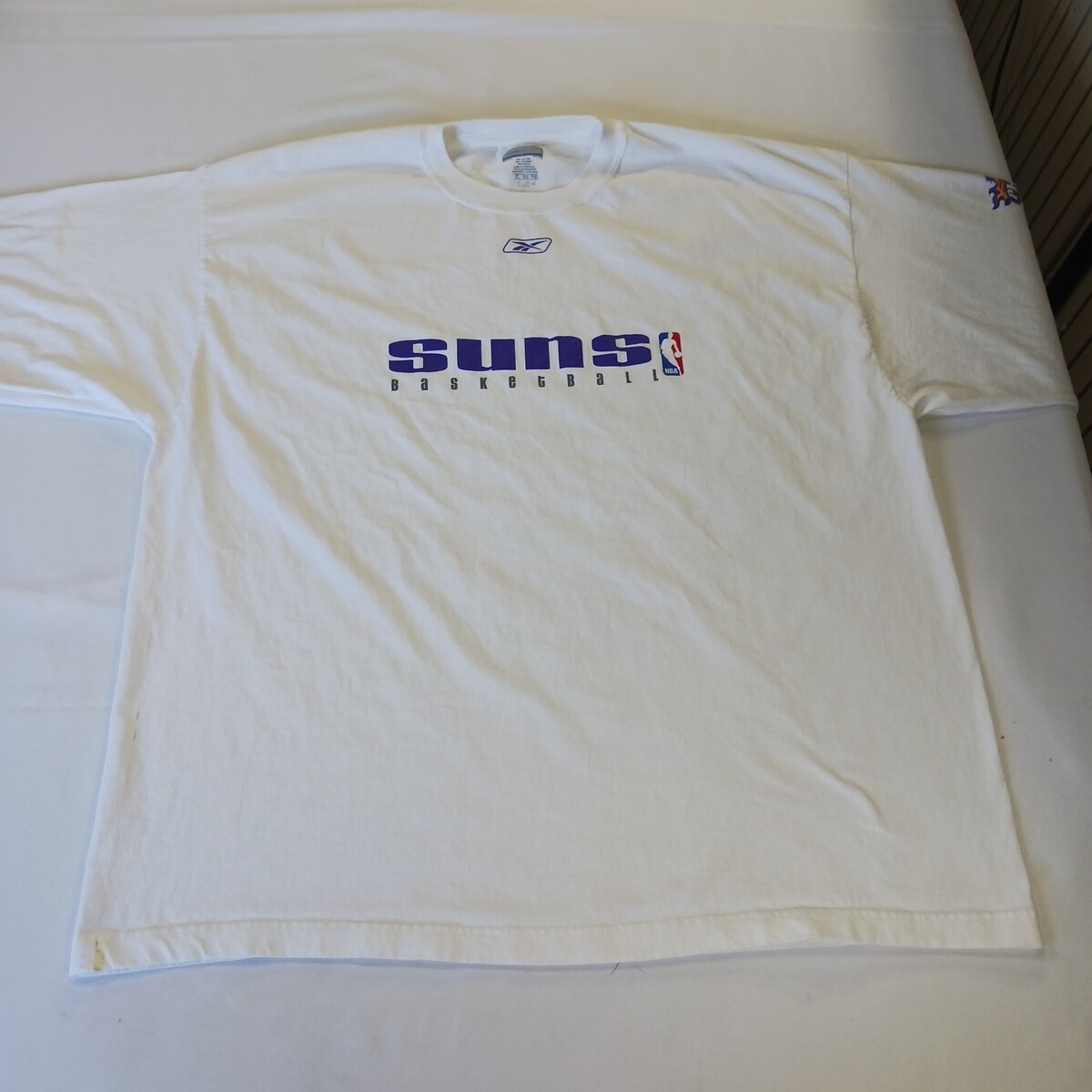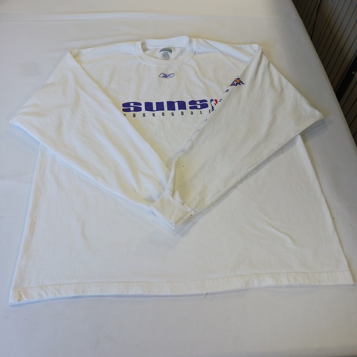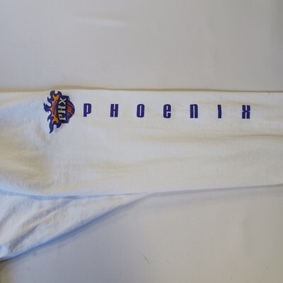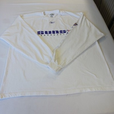 The product is a Reebok men's white cotton long sleeve t-shirt in size 2XL, officially licensed by the National Basketball Association (NBA) featuring the Phoenix Suns team logo. Made in Honduras, this shirt is perfect for fans of basketball and the Phoenix Suns looking to show their support during the regular season. With the Reebok brand and official licensing, this shirt is high-quality and a must-have for any basketball fan.