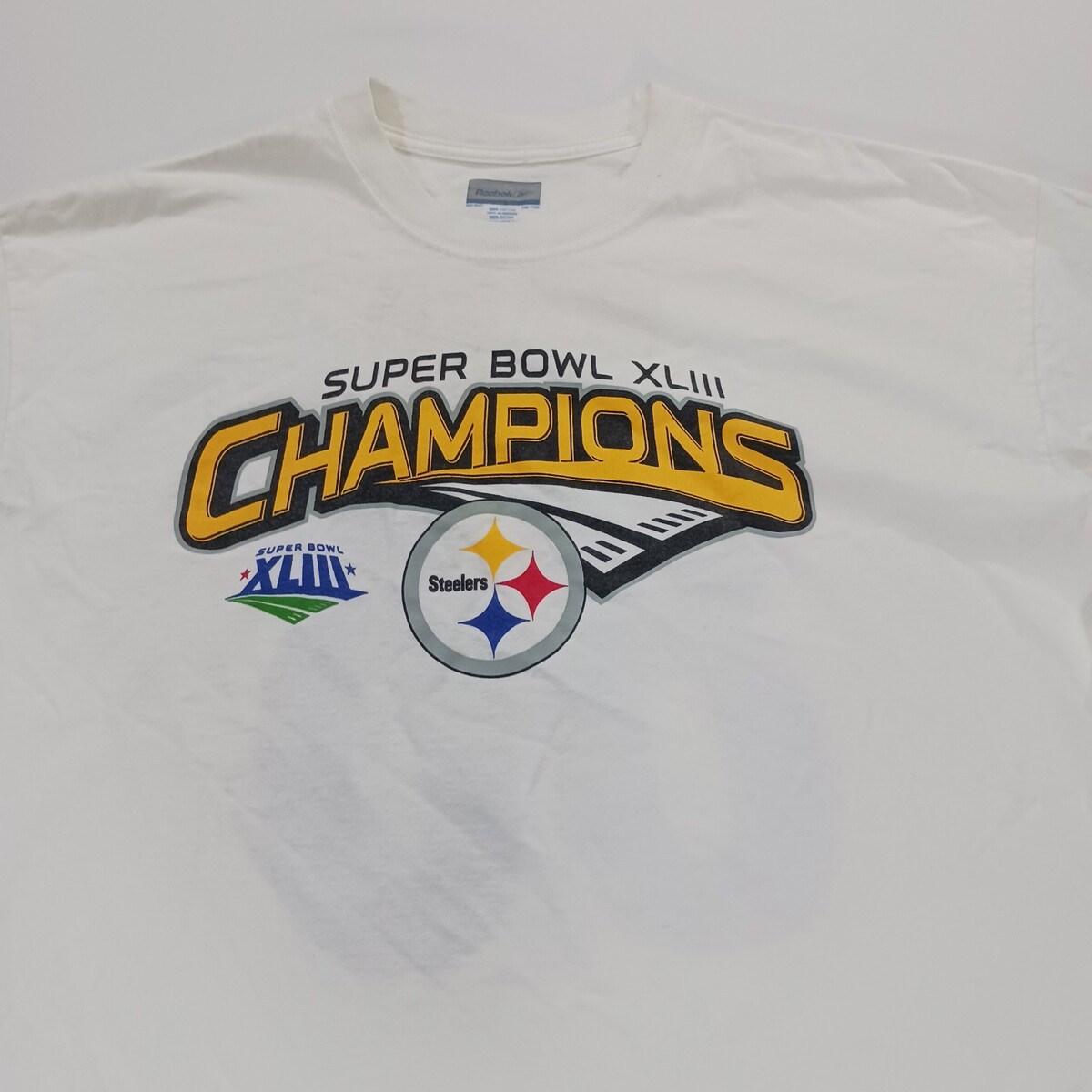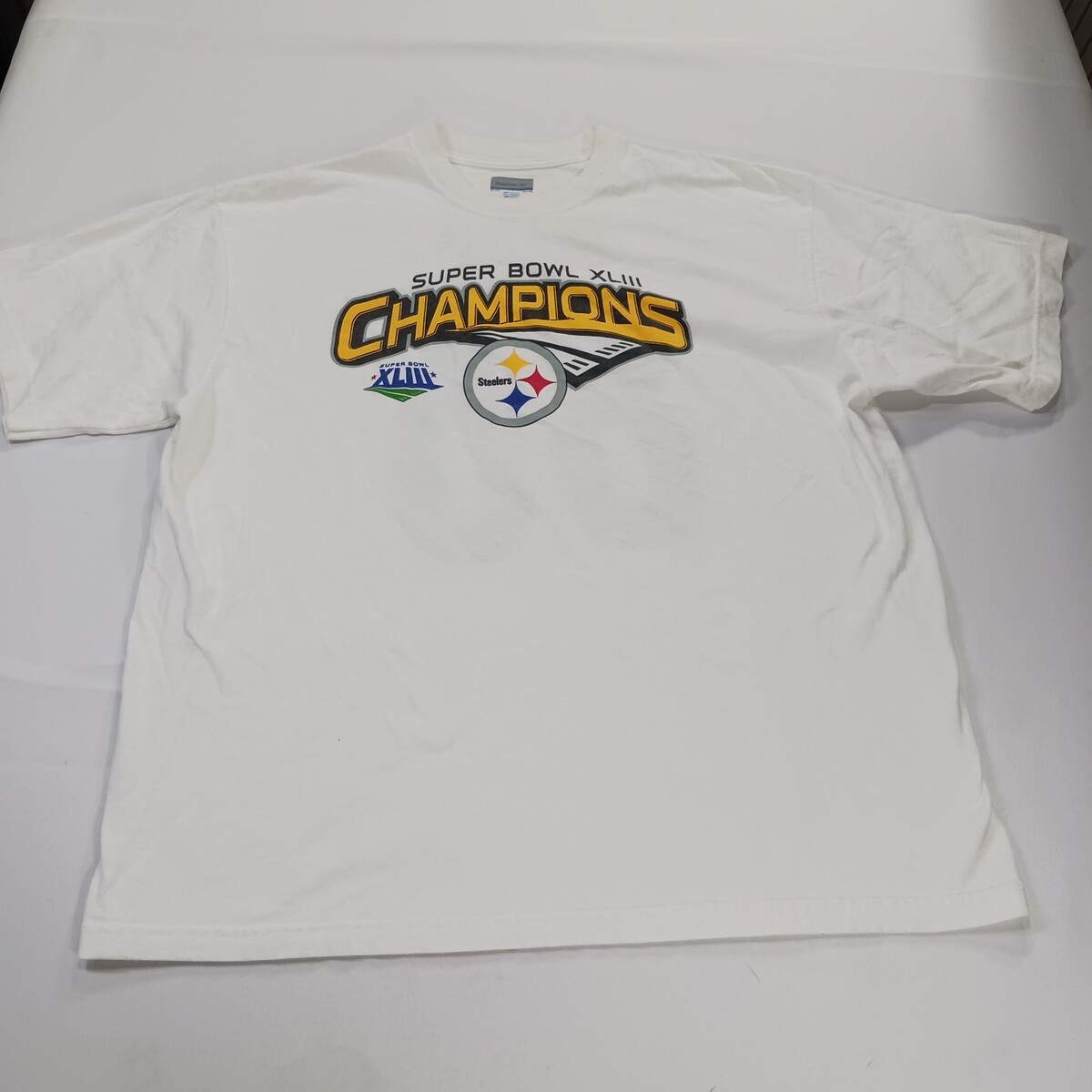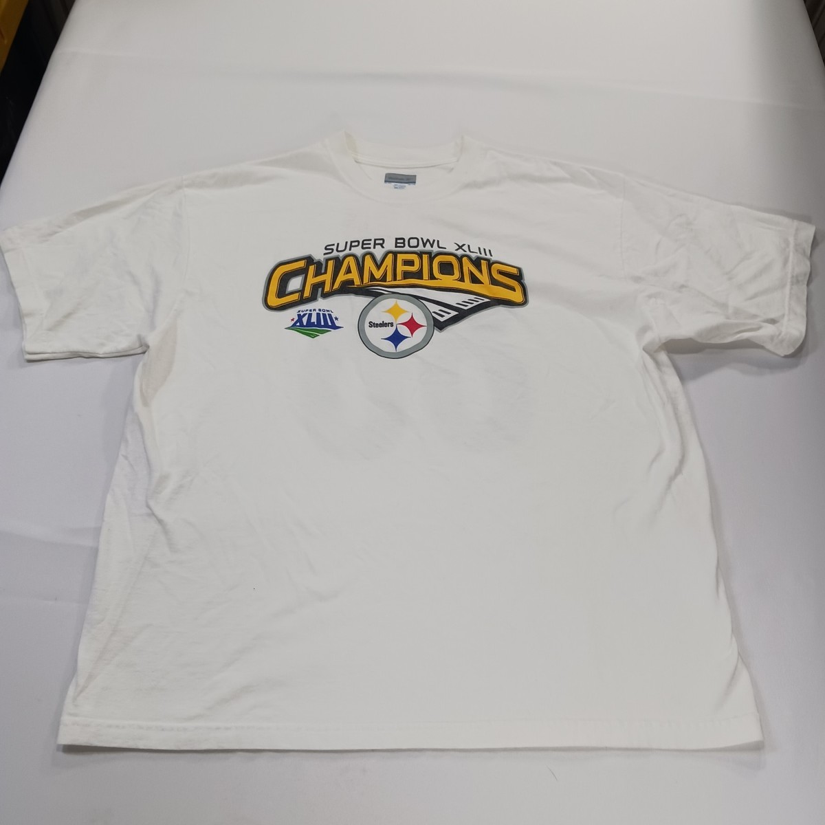 The product is a men's white short sleeve graphic t-shirt by Reebok, celebrating the Super Bowl XLIII Champions. Made of cotton, this regular fit shirt features a colorful graphic print design, perfect for fans looking to show their support in style. The XL size ensures a comfortable and flattering fit for most men.