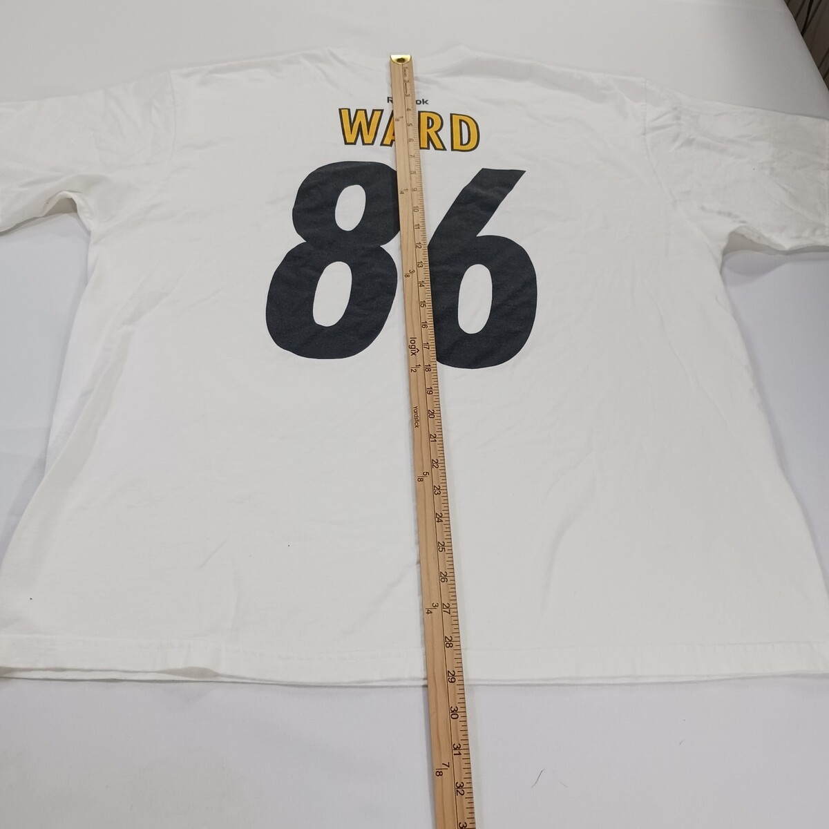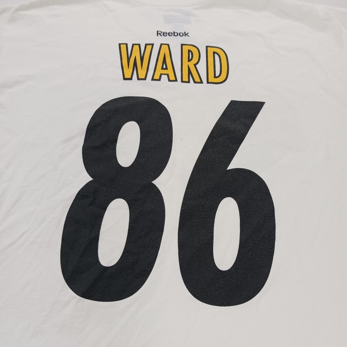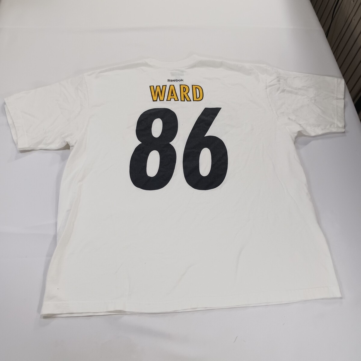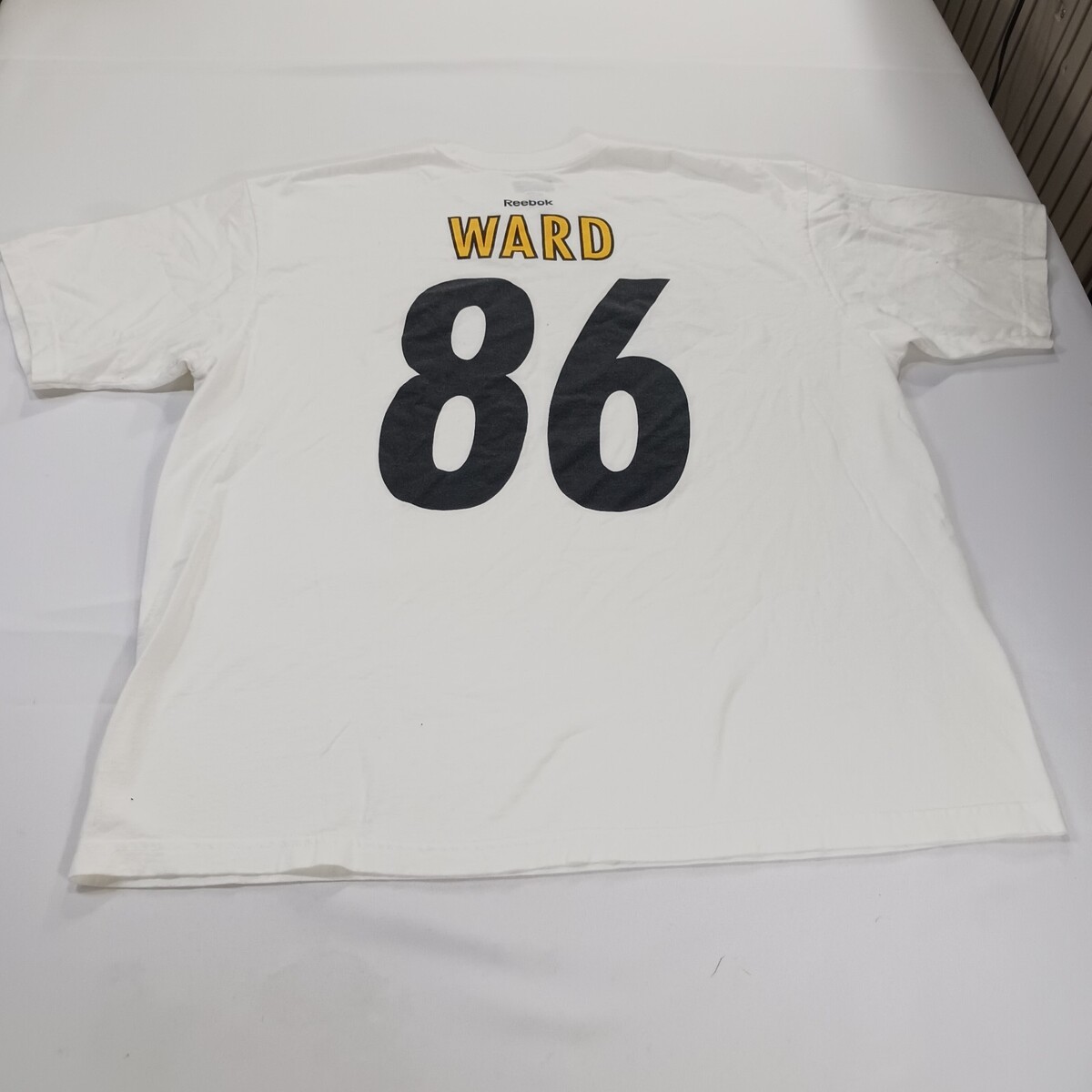 The product is a men's white short sleeve graphic t-shirt by Reebok, celebrating the Super Bowl XLIII Champions. Made of cotton, this regular fit shirt features a colorful graphic print design, perfect for fans looking to show their support in style. The XL size ensures a comfortable and flattering fit for most men.