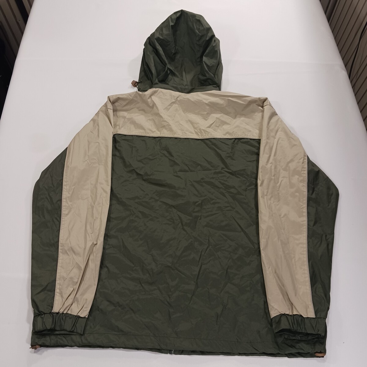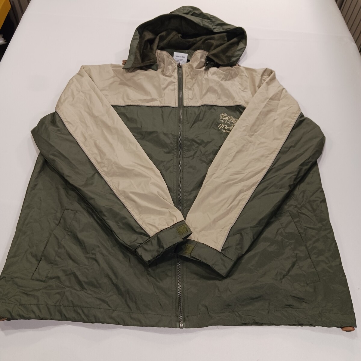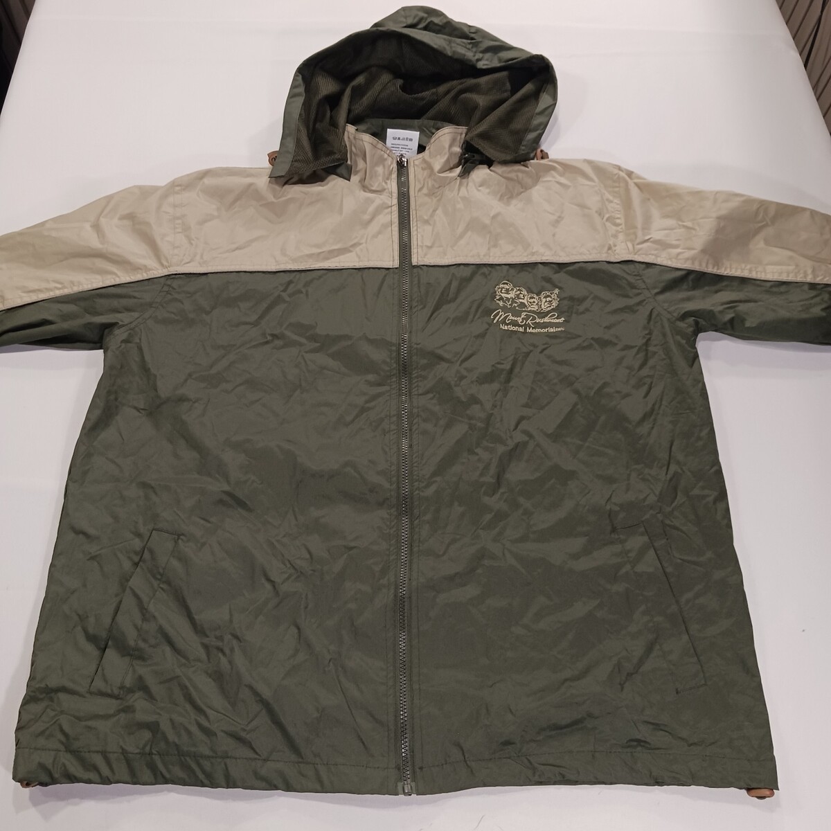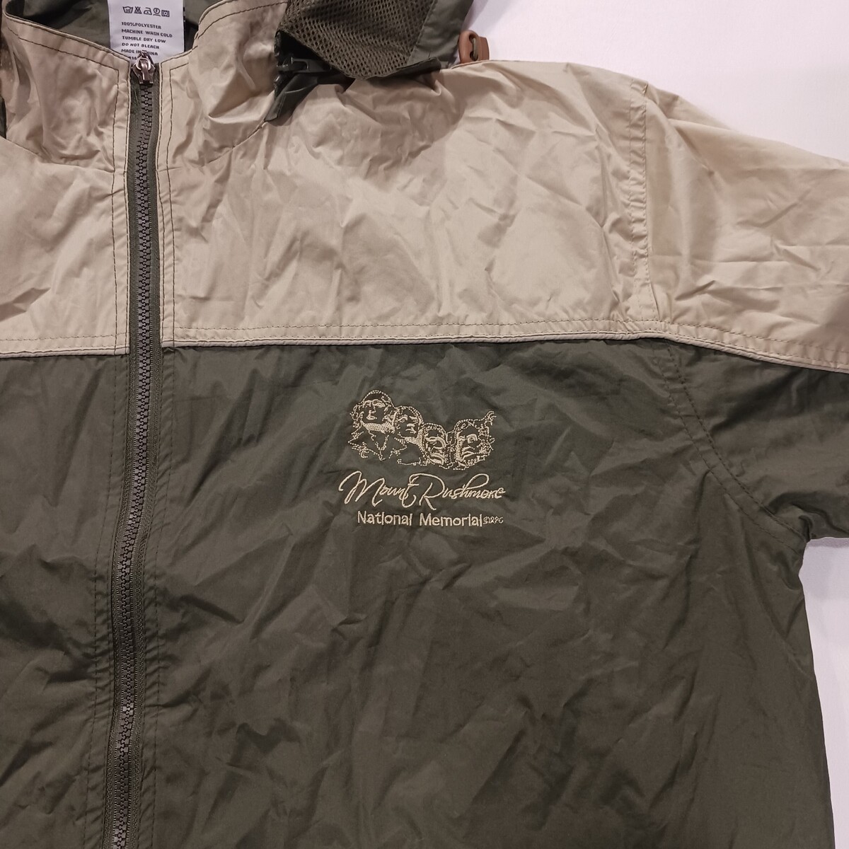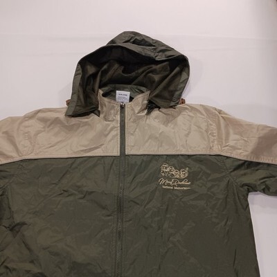 The RPG Souvenirs Mount Rushmore Men's Green/Beige Full Zip Hooded Jacket in Size 2XL is a stylish and comfortable windbreaker jacket perfect for casual occasions. Made with a durable polyester outer shell and lining, this jacket features a colorblock design with an embroidered logo accent. The full zip closure and stand-up collar add a touch of convenience and sophistication to this regularly fit jacket, making it a versatile addition to any man's wardrobe. Easy to care for with machine washable fabric, this jacket is a functional and fashionable choice for everyday wear.