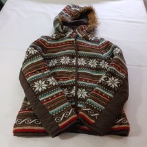 • Rue 21 Women's Brown Multicolor Geometric Removable Hoodie Snap Button Jacket M image 1