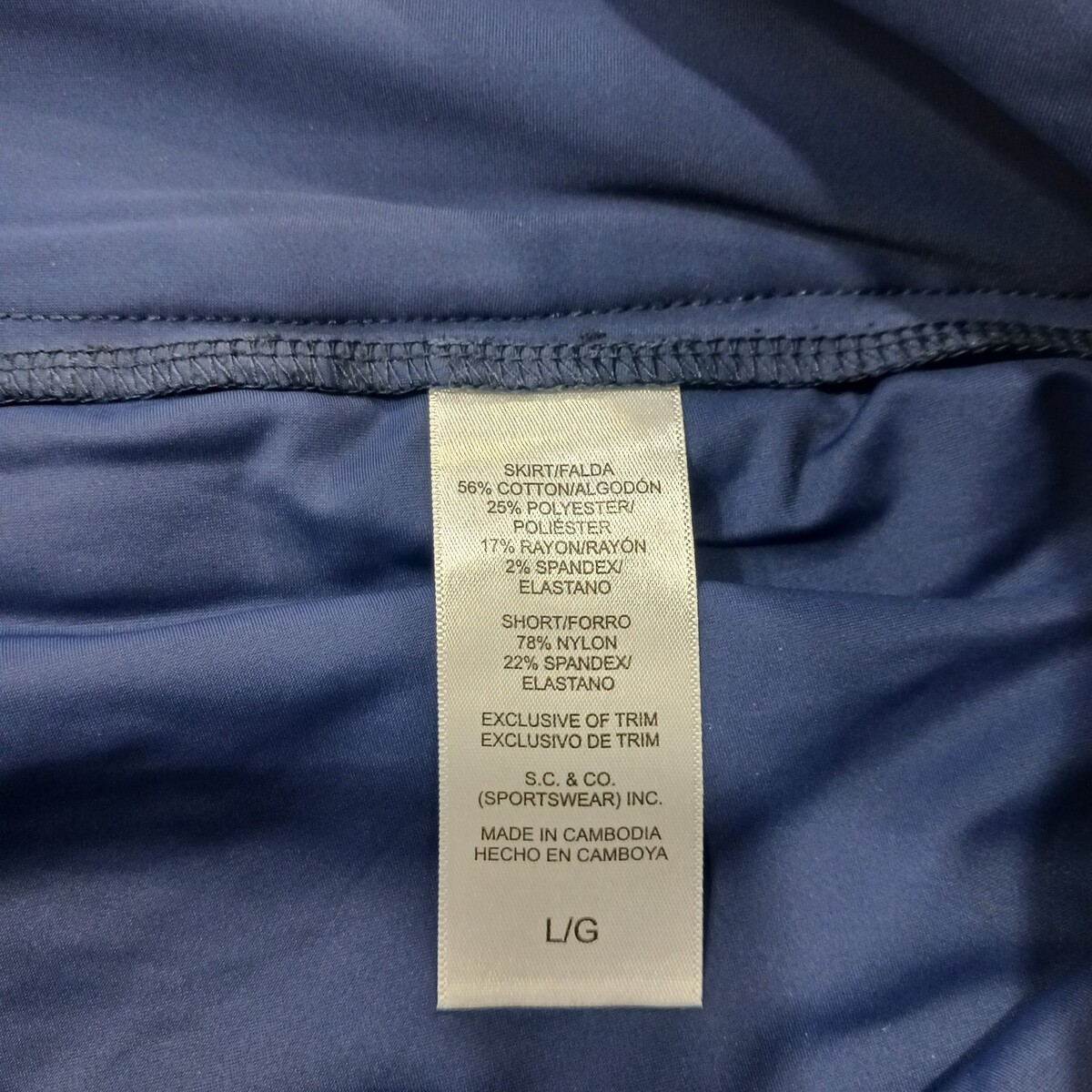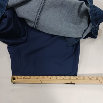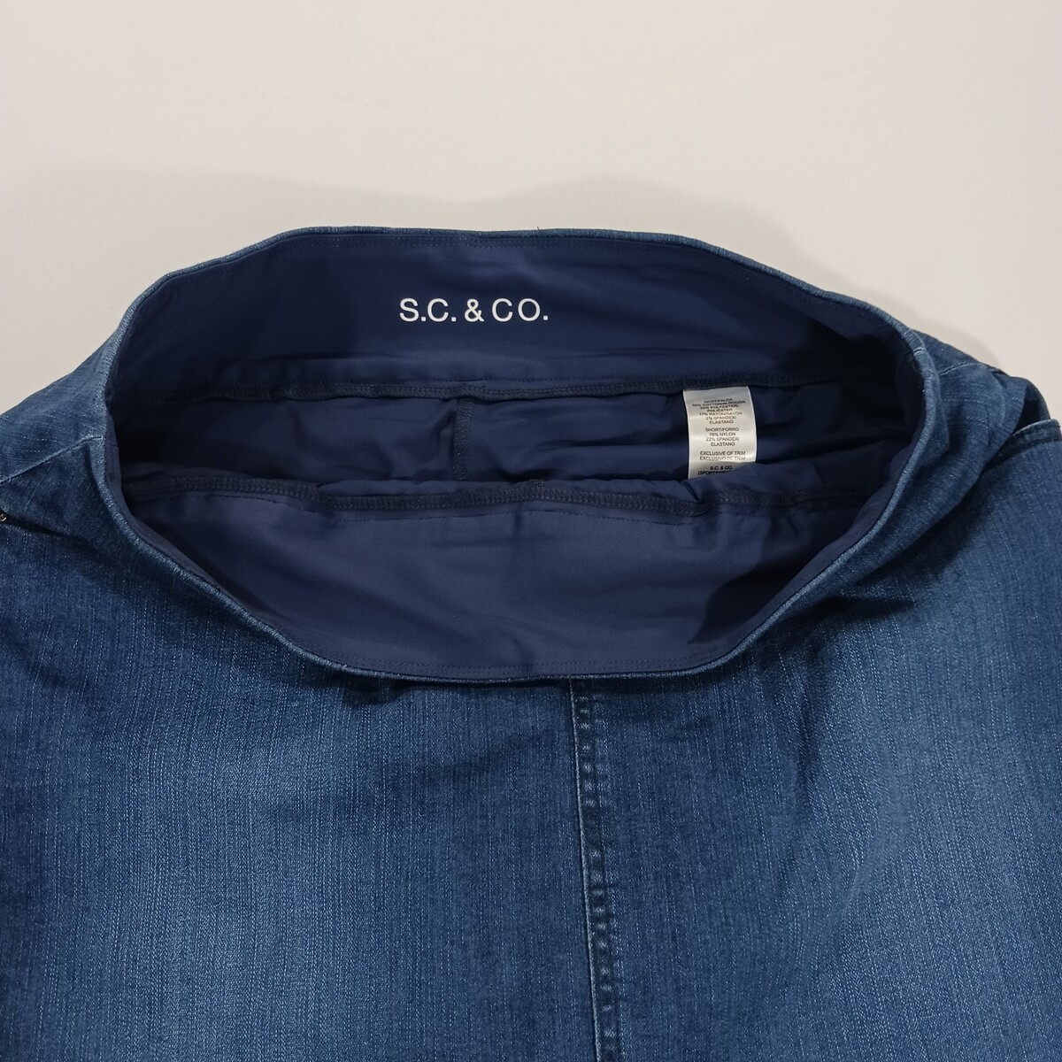 The S.C. & Co. Denim Skort is a stylish and comfortable piece of women's clothing in a pull-on stretch mini skirt style. Made from a blend of polyester, spandex, rayon, and cotton, this solid blue skort features an elastic waist and pockets for added convenience. With a skirt length of 19 inches, this versatile garment is perfect for casual or travel occasions during the summer and spring seasons. Easy to care for with machine washable fabric, this skort from S.C. & Co. is a fashionable choice for the modern woman.