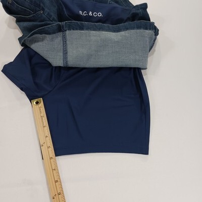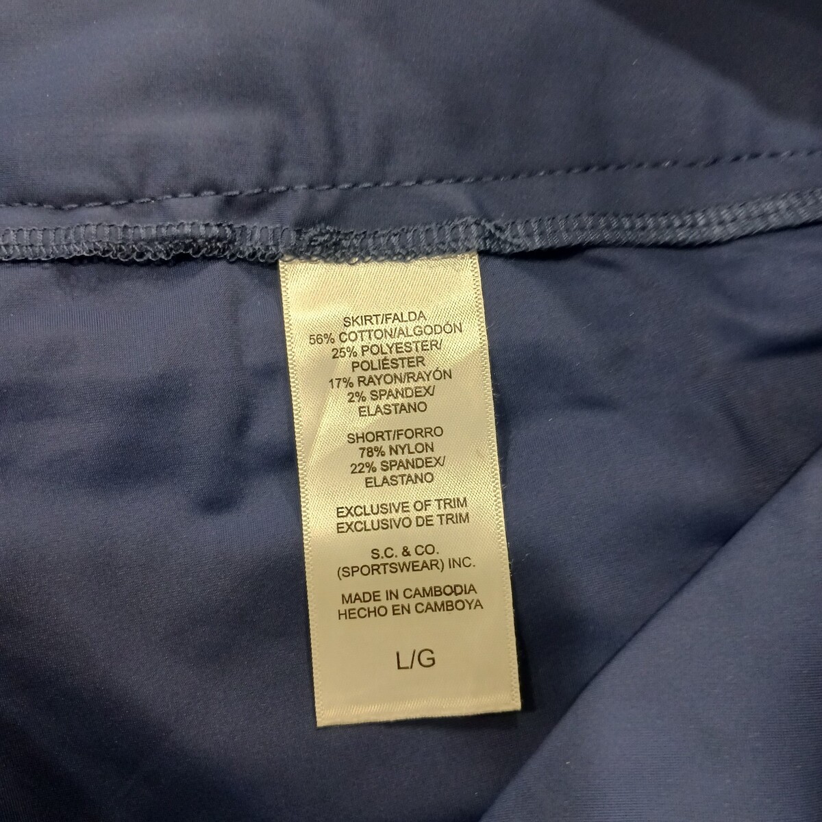 The S.C. & Co. Denim Skort in women's size large is a stylish and versatile piece perfect for casual occasions or travel. The pull-on design with an elastic waist offers comfort and ease of wear, while the stretch denim fabric ensures a flattering fit. This mini denim skirt, measuring 19 inches in length, features a solid blue color and a logo accent. With machine washable care instructions and convenient pockets, this skort is a practical and fashionable addition to any wardrobe for the summer and spring seasons.