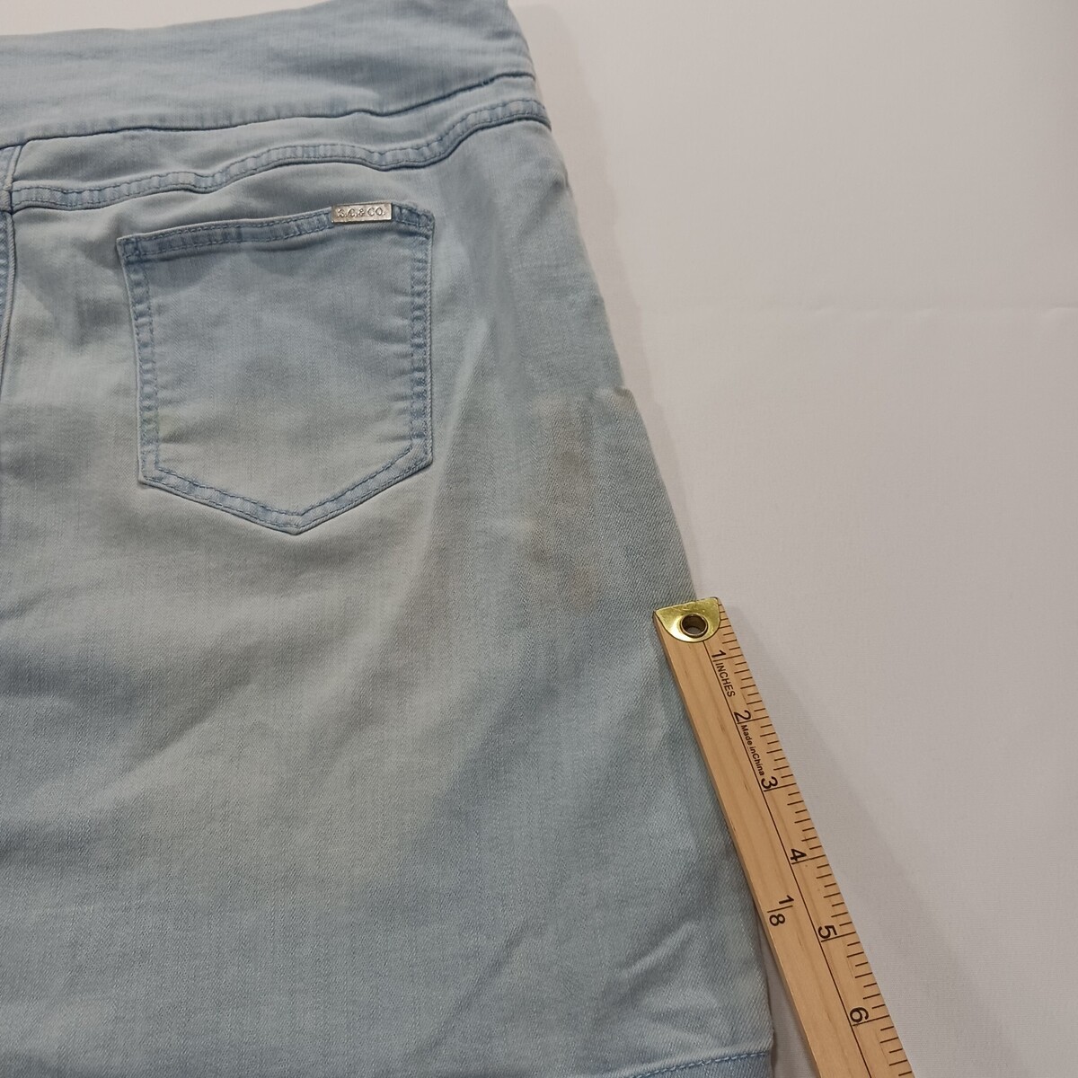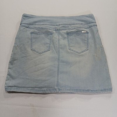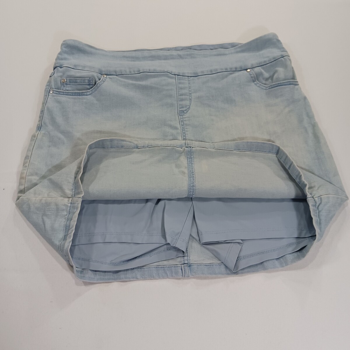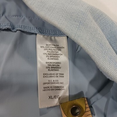 The S.C. & Co. Denim Skort in Women's XL size features a pull-on closure and is made of a comfortable blend of polyester, spandex, rayon, cotton, and cotton blend materials. This light blue skort is perfect for casual occasions and travel, with a skirt length of 19 inches and an elastic waist for a comfortable fit. The skort is machine washable and includes accents like a logo, making it a stylish choice for the summer and spring seasons. Made by the brand S.C. & Co., this skort is a stylish and versatile addition to any woman's wardrobe.
