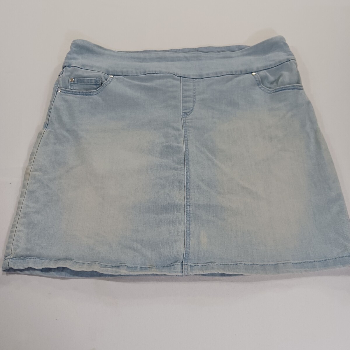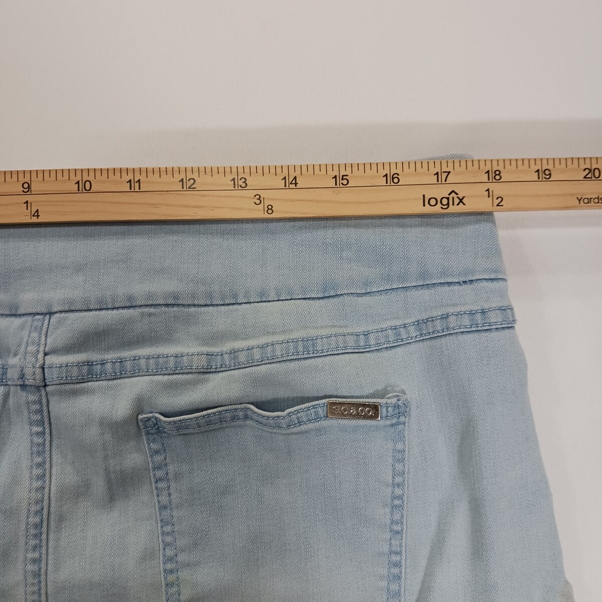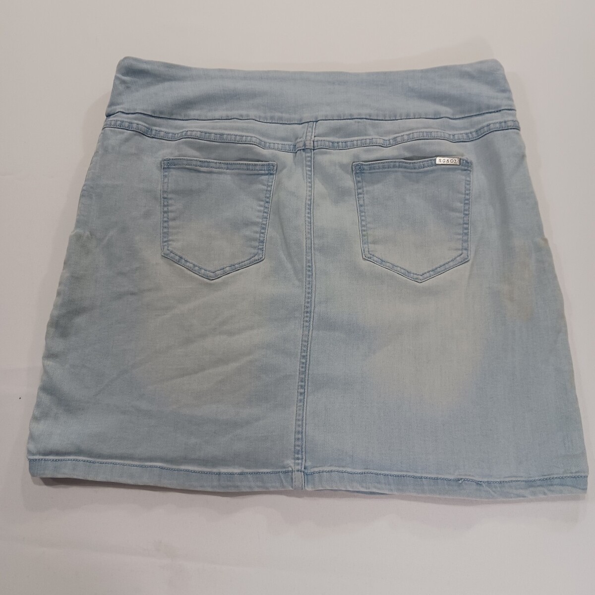The S.C. & Co. Denim Skort in Women's XL size features a pull-on closure and is made of a comfortable blend of polyester, spandex, rayon, cotton, and cotton blend materials. This light blue skort is perfect for casual occasions and travel, with a skirt length of 19 inches and an elastic waist for a comfortable fit. The skort is machine washable and includes accents like a logo, making it a stylish choice for the summer and spring seasons. Made by the brand S.C. & Co., this skort is a stylish and versatile addition to any woman's wardrobe.