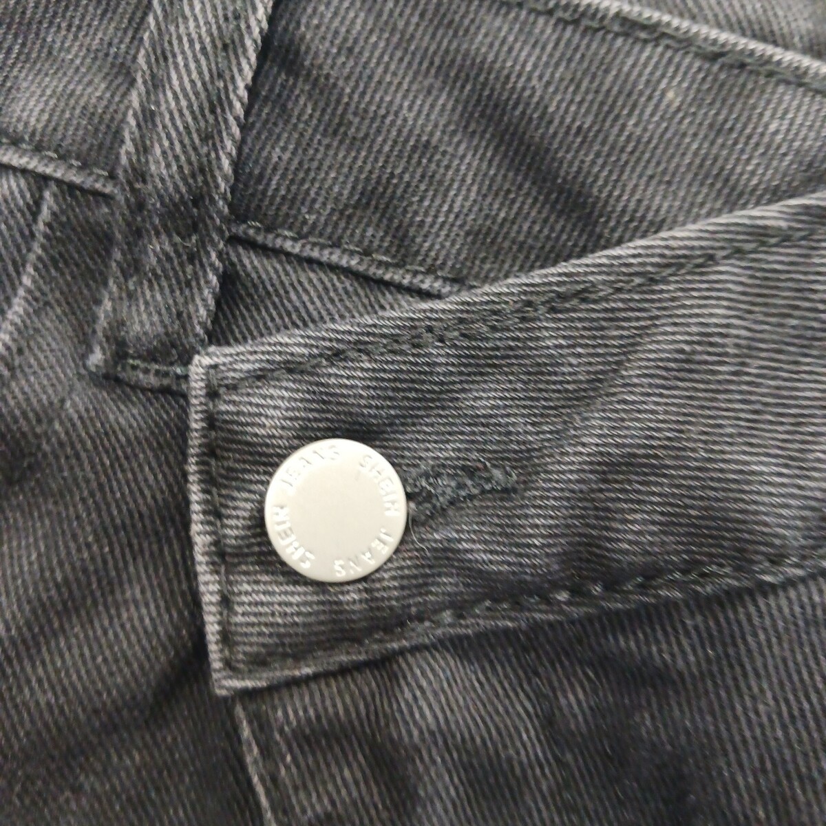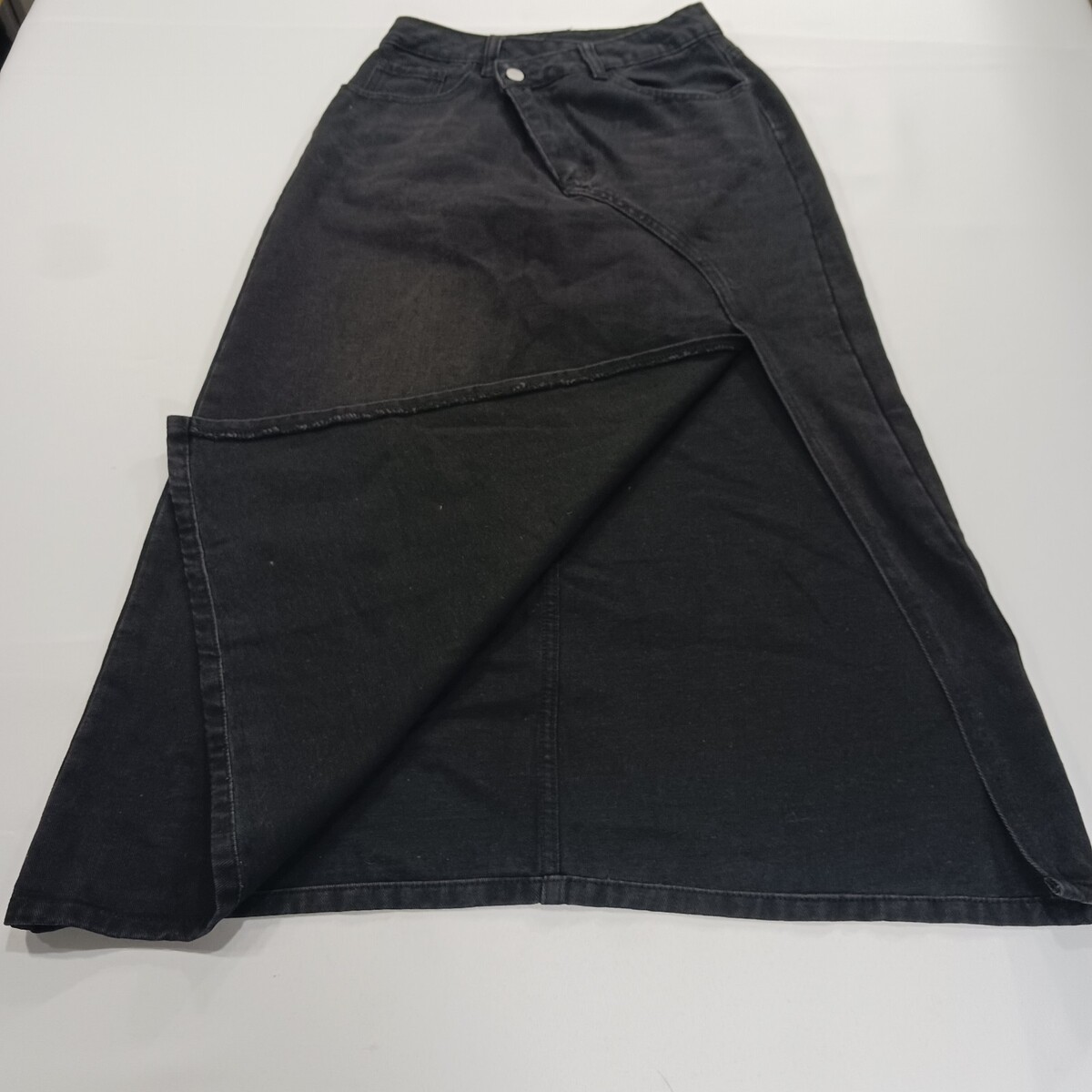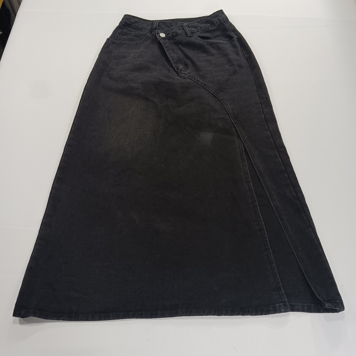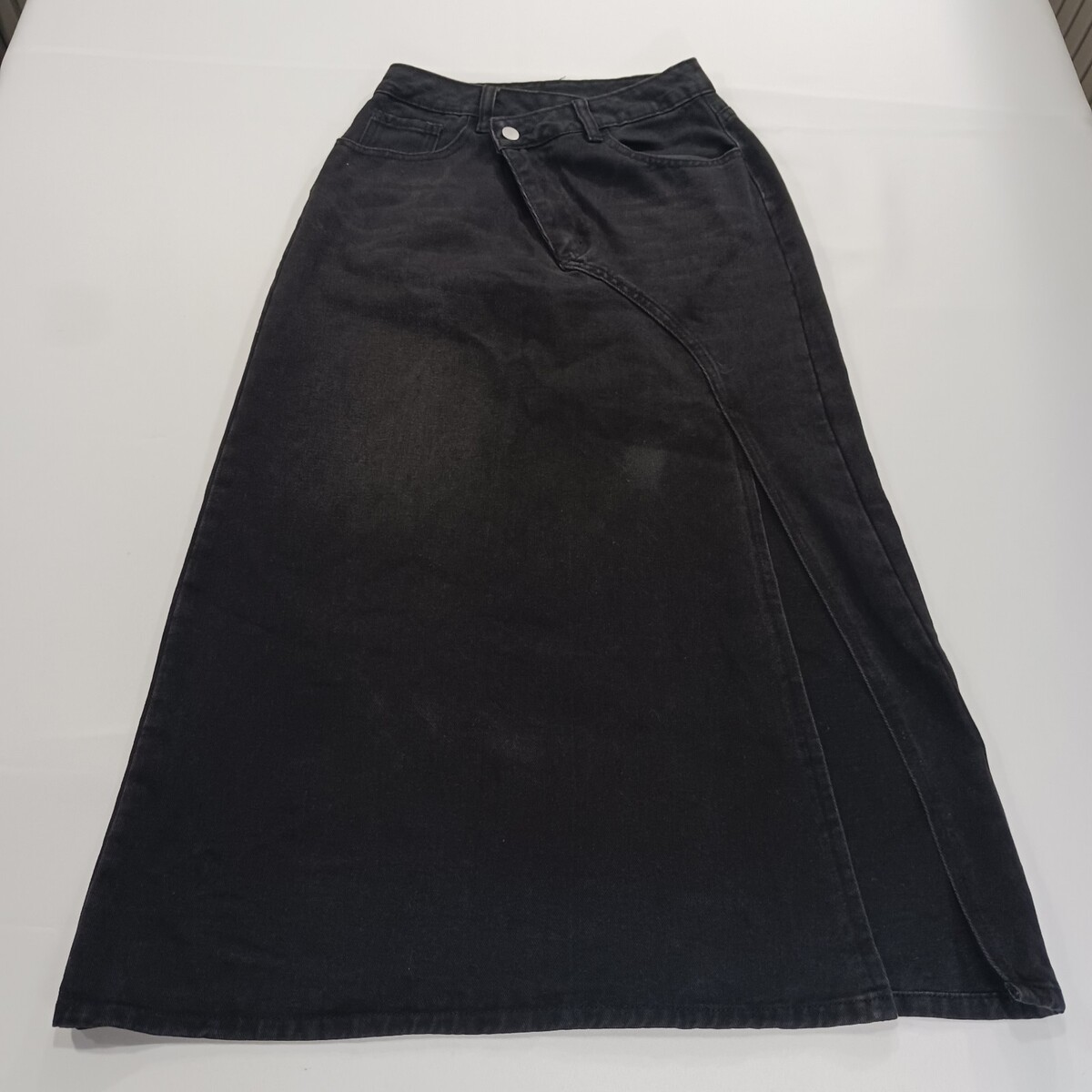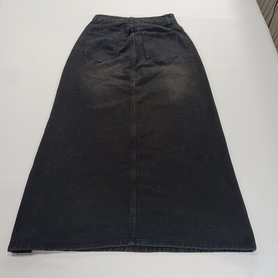 The product is a stylish SheIn women's black skirt in size 26, made of a comfortable cotton blend denim fabric. This A-line skirt features a front zipper closure, a high slit, and pockets, making it perfect for casual occasions during the summer, fall, or spring seasons. With its solid color and button accents, this skirt is easy to care for with machine washable instructions, and comes from the brand SheIn, requiring no personalization. Perfect for adding a trendy touch to any woman's wardrobe.