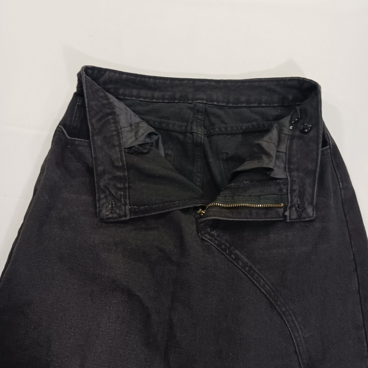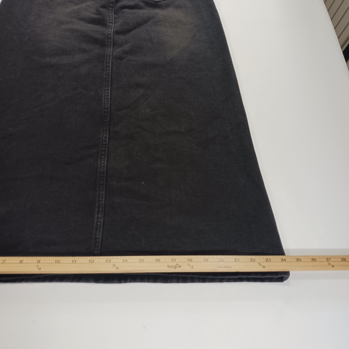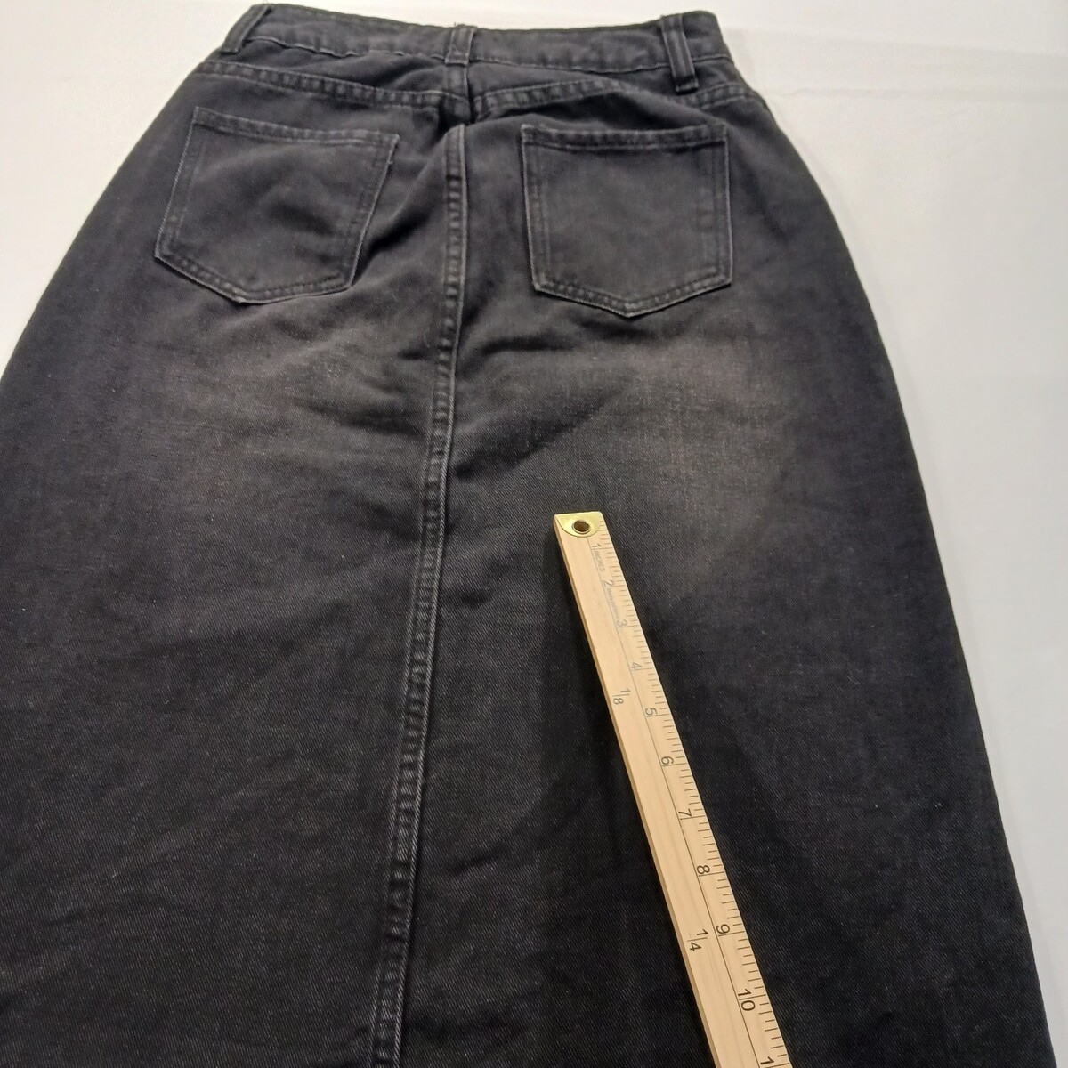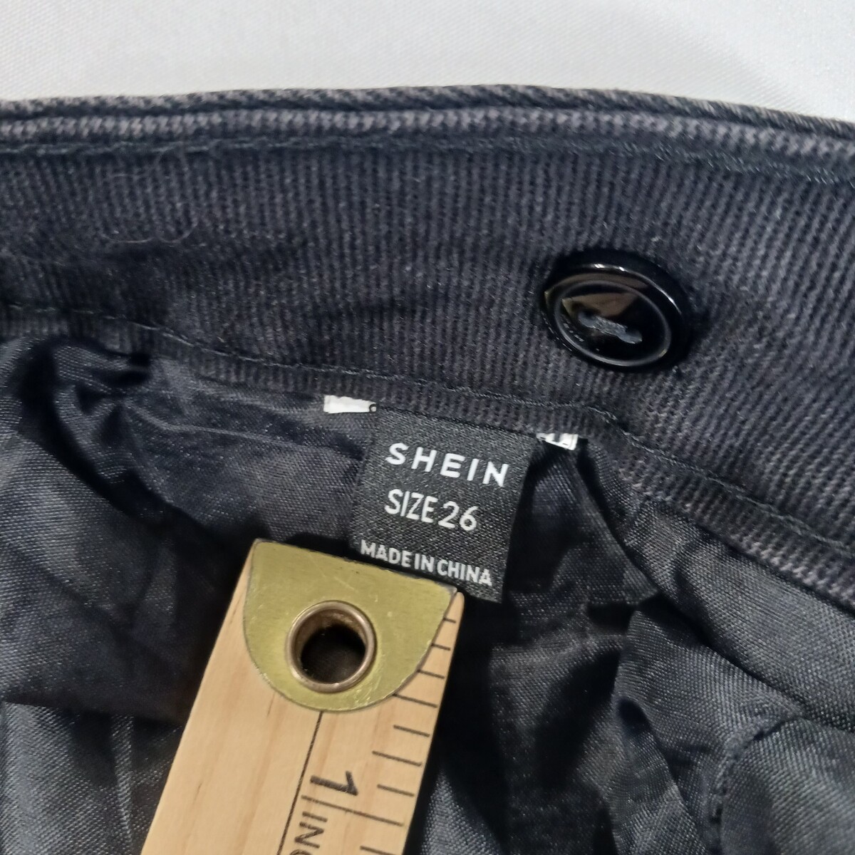 The product is a stylish SheIn women's black skirt in size 26, made of a comfortable cotton blend denim fabric. This A-line skirt features a front zipper closure, a high slit, and pockets, making it perfect for casual occasions during the summer, fall, or spring seasons. With its solid color and button accents, this skirt is easy to care for with machine washable instructions, and comes from the brand SheIn, requiring no personalization. Perfect for adding a trendy touch to any woman's wardrobe.