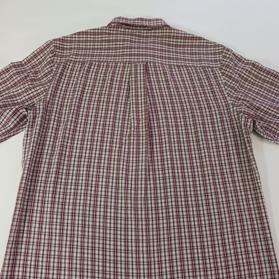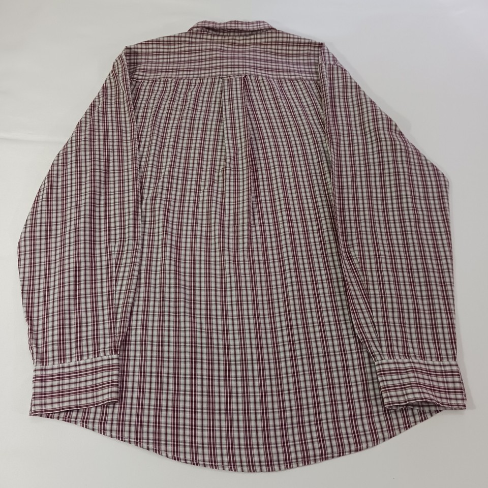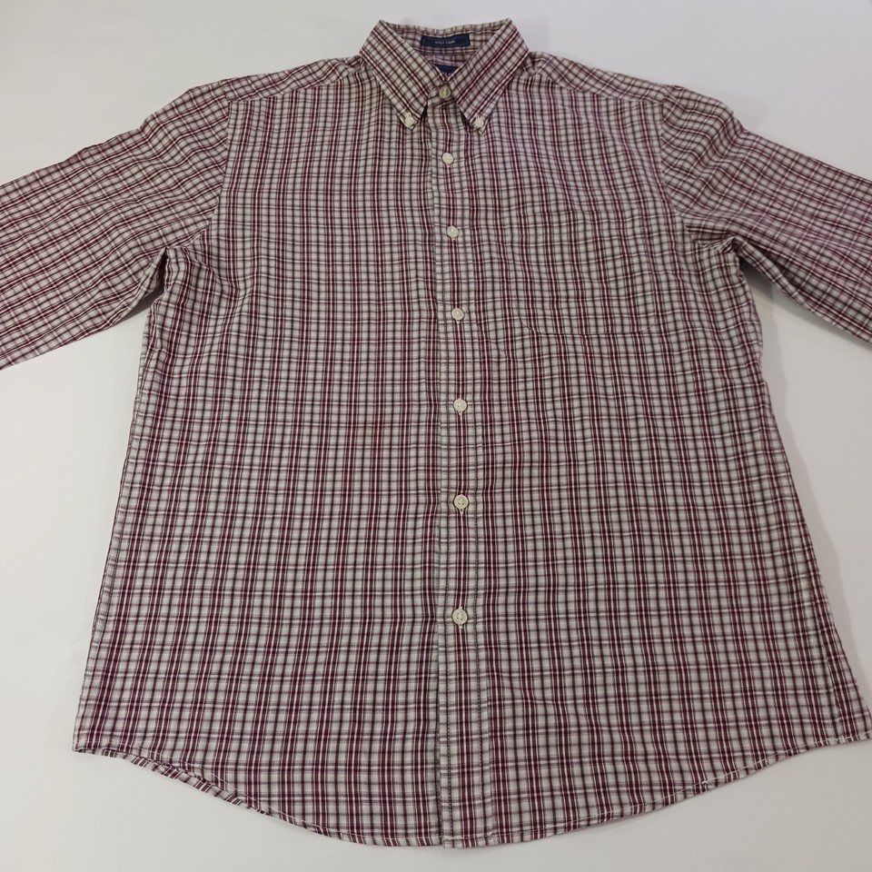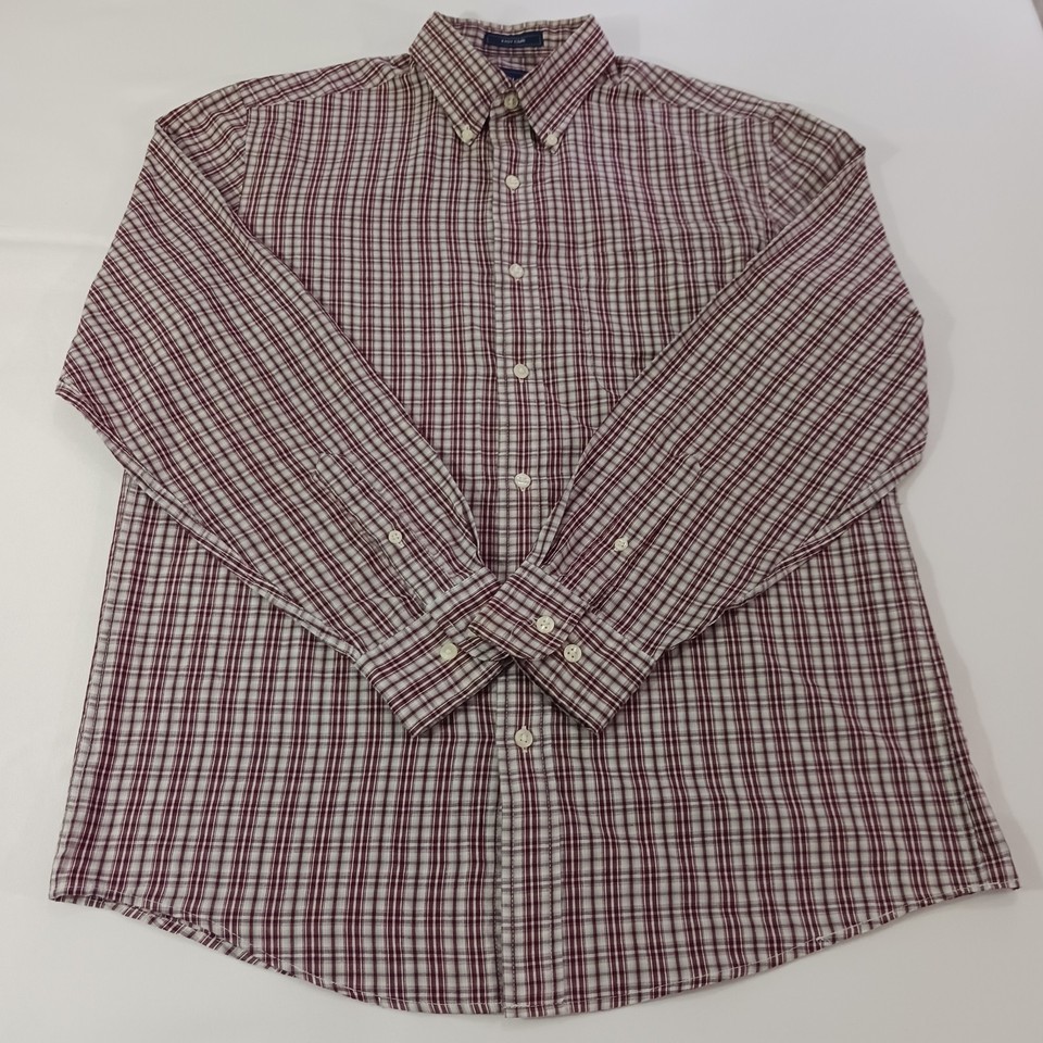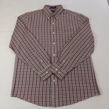 This is a men's red and white plaid shirt by the brand Saddlebred, featuring a button-down collar and long sleeves. The shirt is in size Medium with a chest size of 46 inches, suitable for casual or travel occasions in the fall or winter season. Made of polyester and cotton, it is machine washable for easy care and has a classic design with button accents and a pocket on the chest. Perfect for a regular fit, this button-up shirt exudes a timeless and versatile style for men.