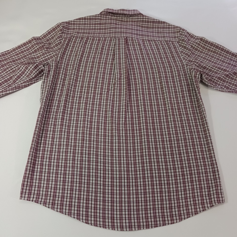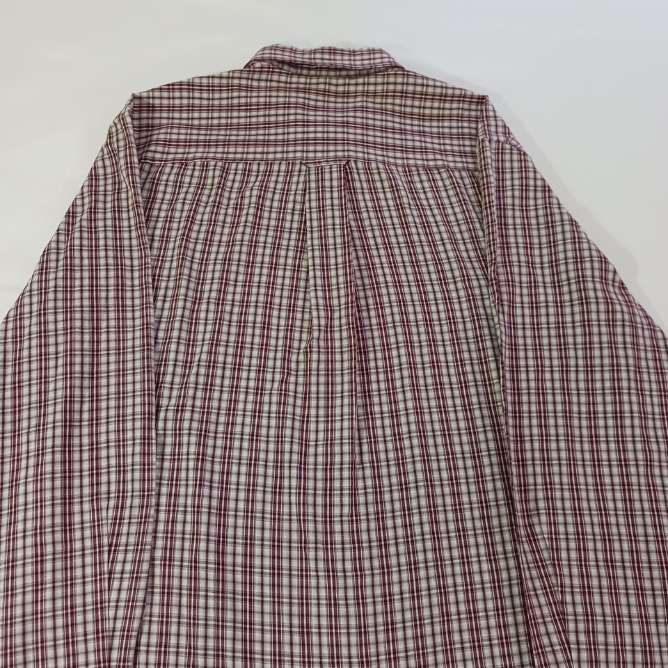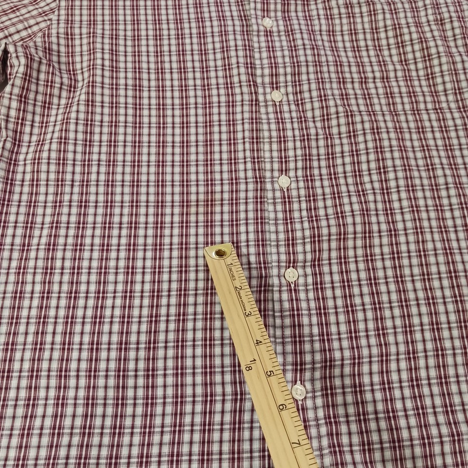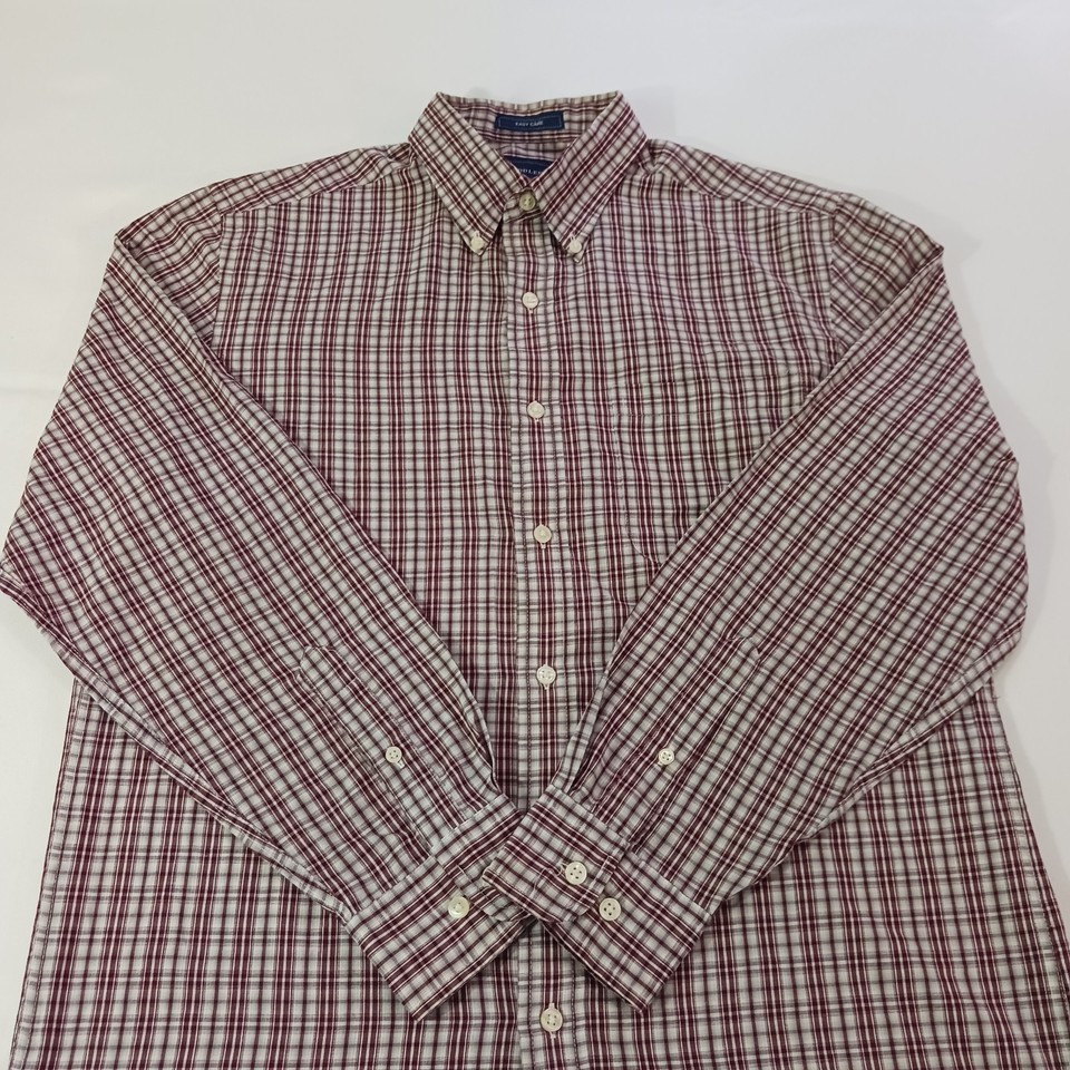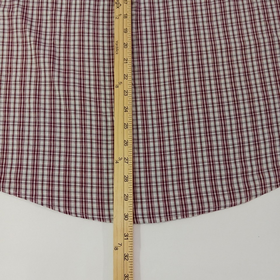 This is a men's red and white plaid shirt by the brand Saddlebred, featuring a button-down collar and long sleeves. The shirt is in size Medium with a chest size of 46 inches, suitable for casual or travel occasions in the fall or winter season. Made of polyester and cotton, it is machine washable for easy care and has a classic design with button accents and a pocket on the chest. Perfect for a regular fit, this button-up shirt exudes a timeless and versatile style for men.