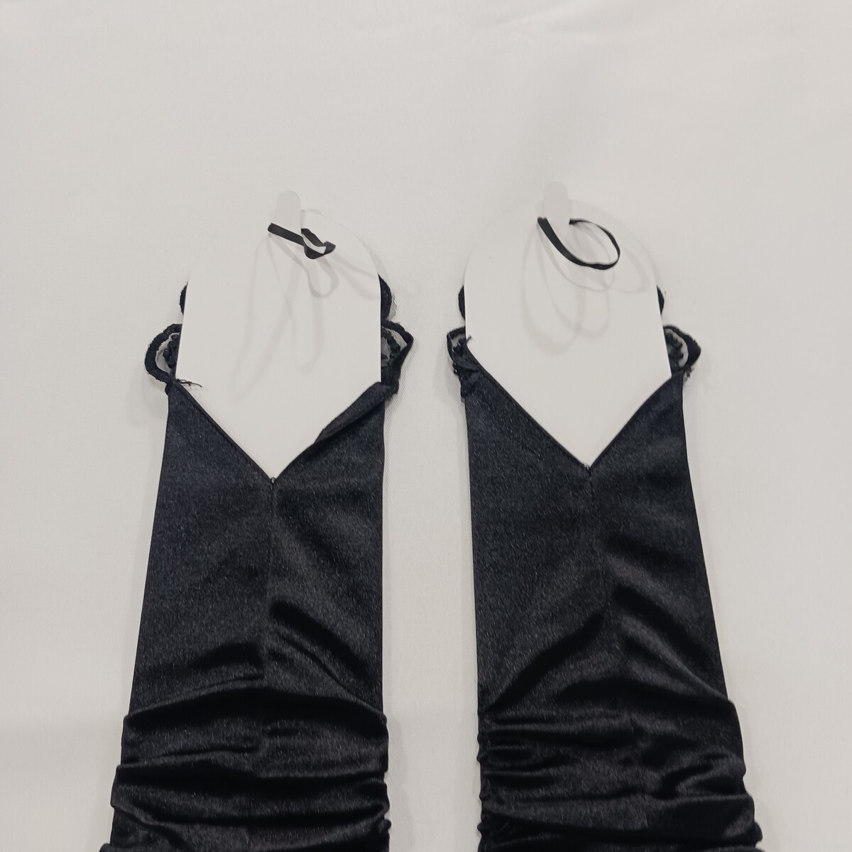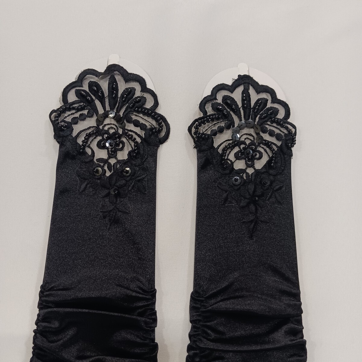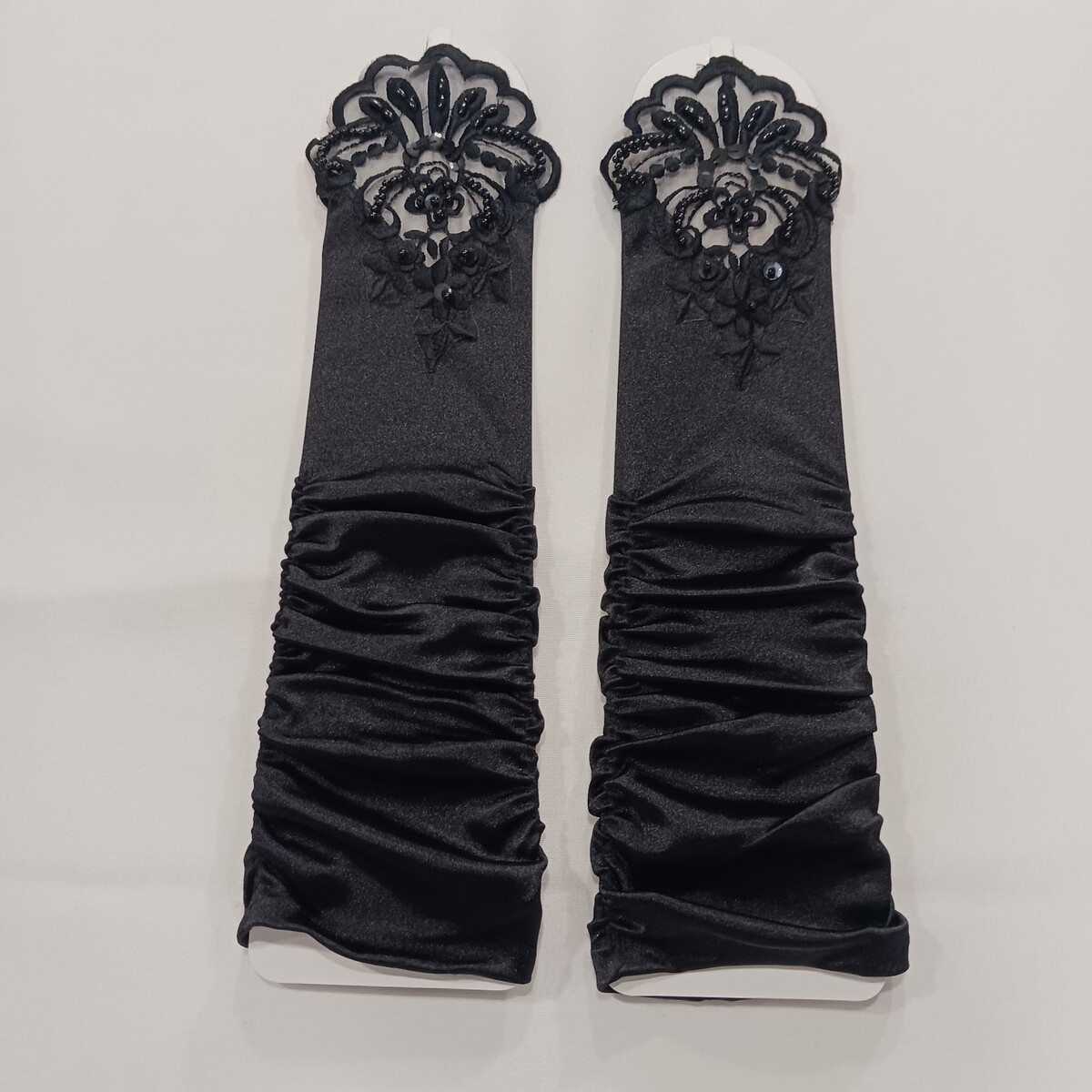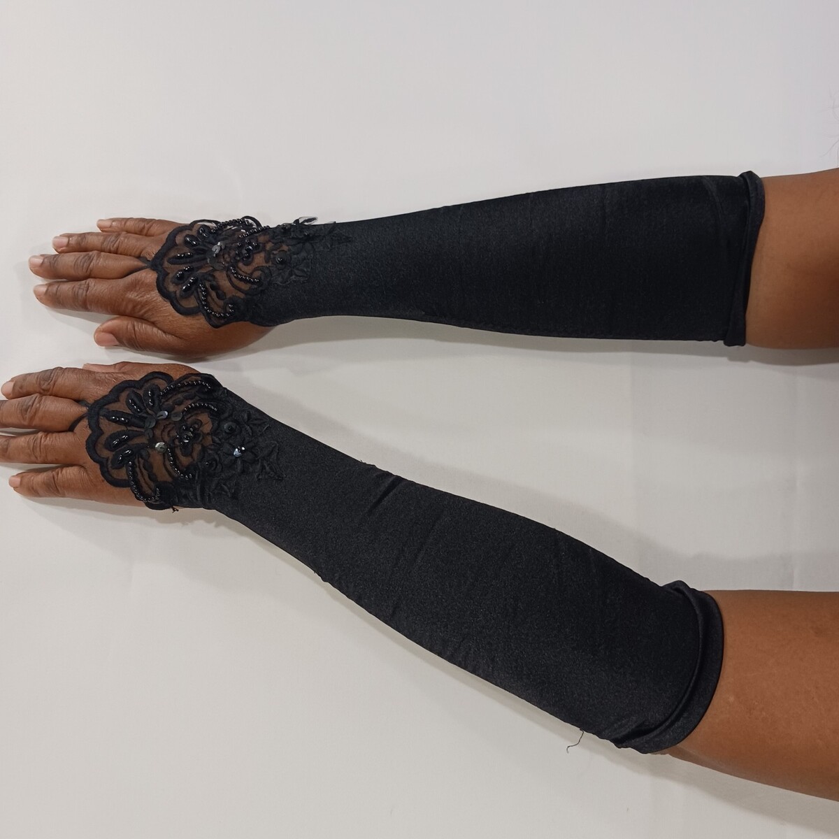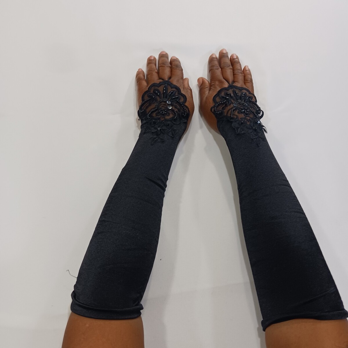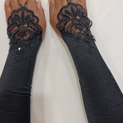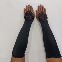 These sexy women's nylon spandex blend fingerless stretch black gloves are a stylish accessory for various occasions such as weddings, parties, or casual outings. The one-size-fits-all design features a solid black color with a leather lining for added comfort. Made from a durable nylon material with a polyester insulation, these gloves are machine washable and suitable for all seasons, making them a versatile and fashionable choice for any woman.