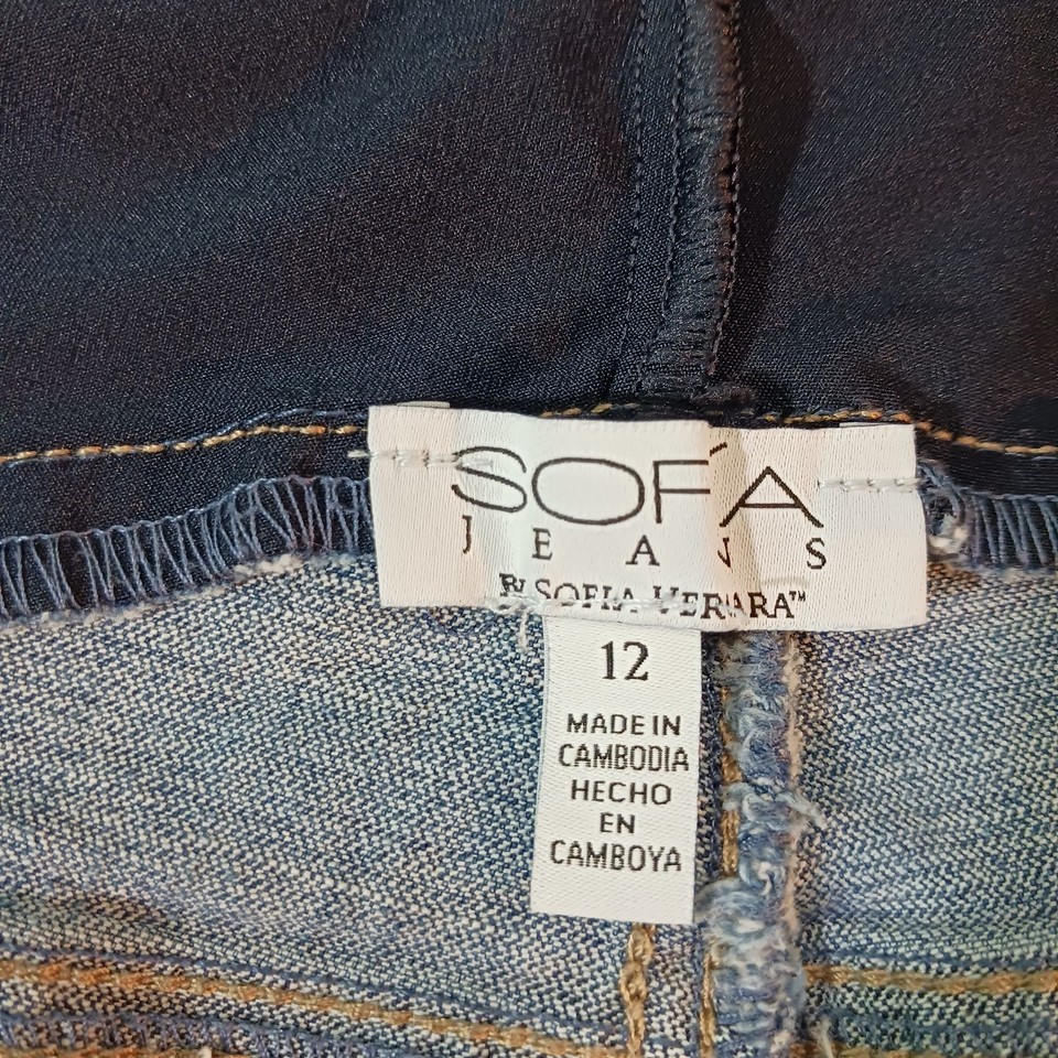 This Sofia Vergara jeans for women in size 12 feature a solid blue denim fabric with a medium wash and stretch for a comfortable fit. The boyfriend style jeans have a mid-rise waist and a 5-pocket design with a zip and button closure. Made of a blend of spandex and cotton, these jeans have a logo accent and are machine washable. They are suitable for various themes such as festivals, school, and city outings, making them a versatile wardrobe choice for all seasons.