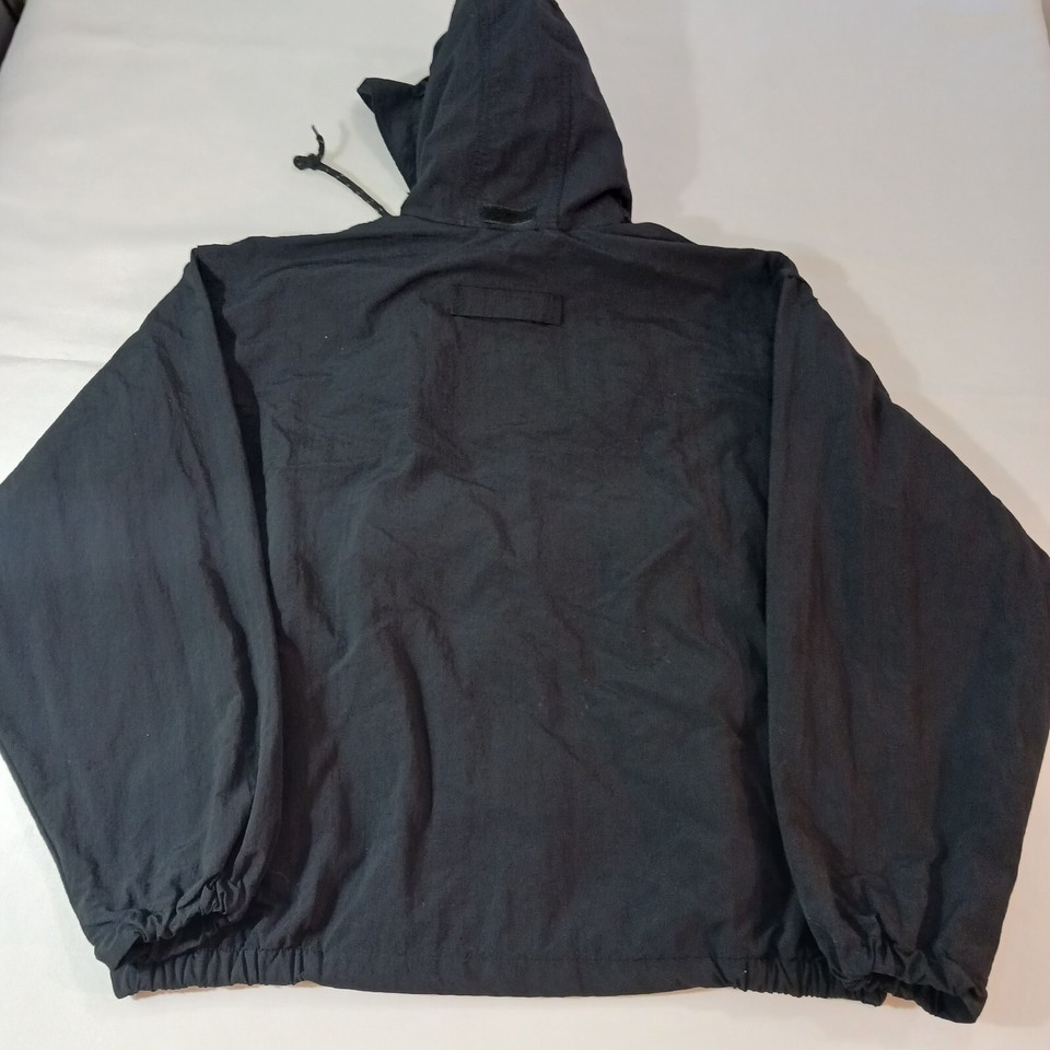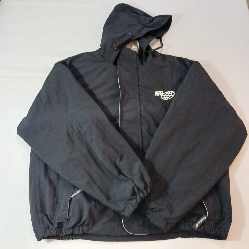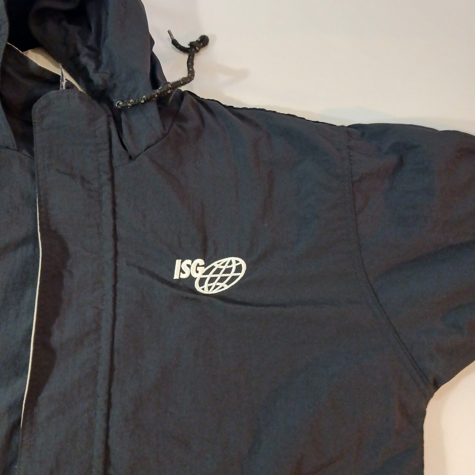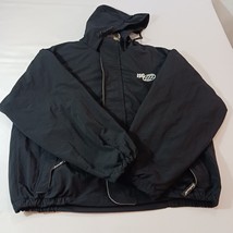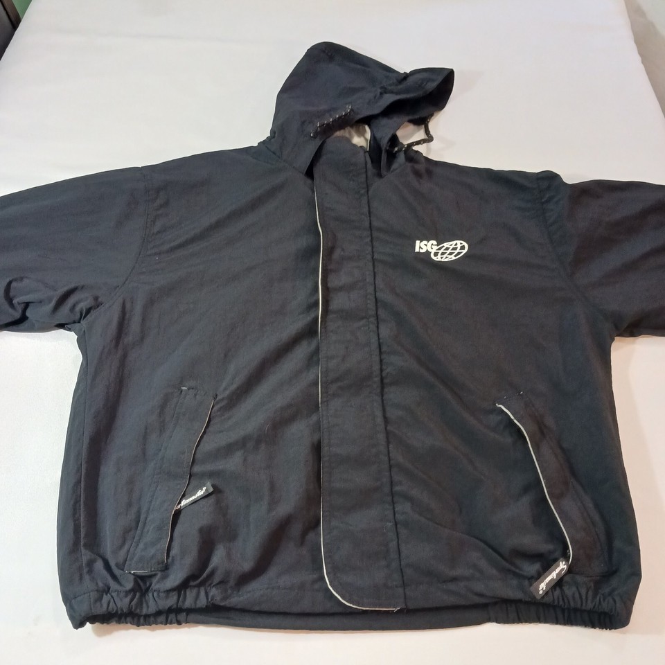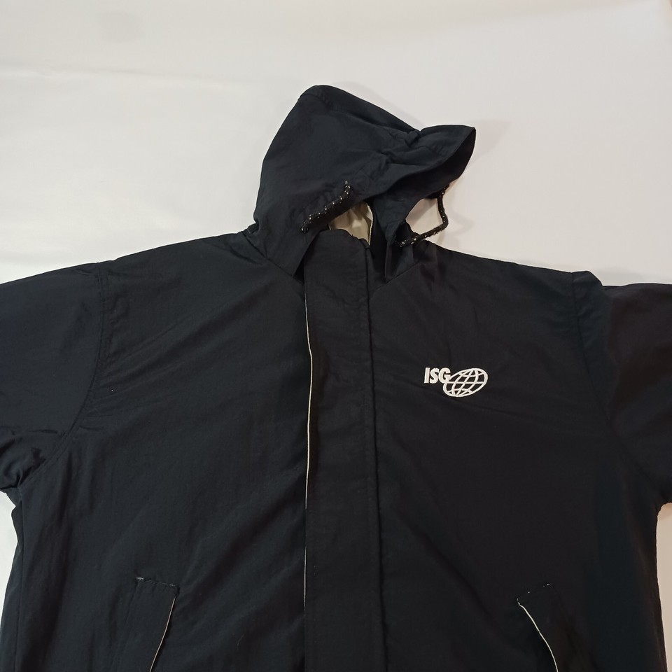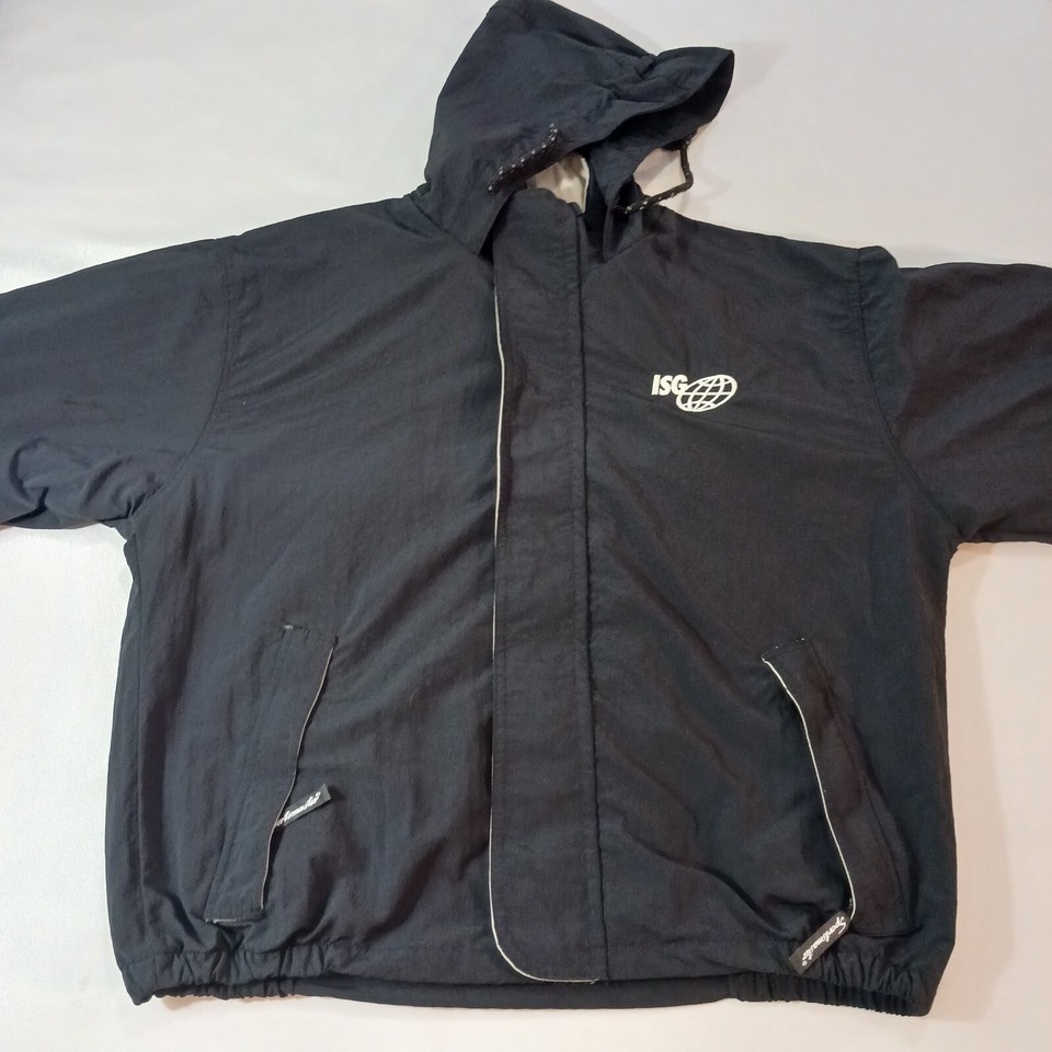 This Sportsmaster ISG Men's Black Hoodie Jacket is a size Large made in the USA. The outer shell material is a Cotton Blend in a solid black color with a chest size of 53 inches. It features a full zip closure, hood, and pockets, making it a practical and stylish choice for everyday wear. The jacket has a USA theme and is designed for regular fit, representing a blend of comfort and American craftsmanship.