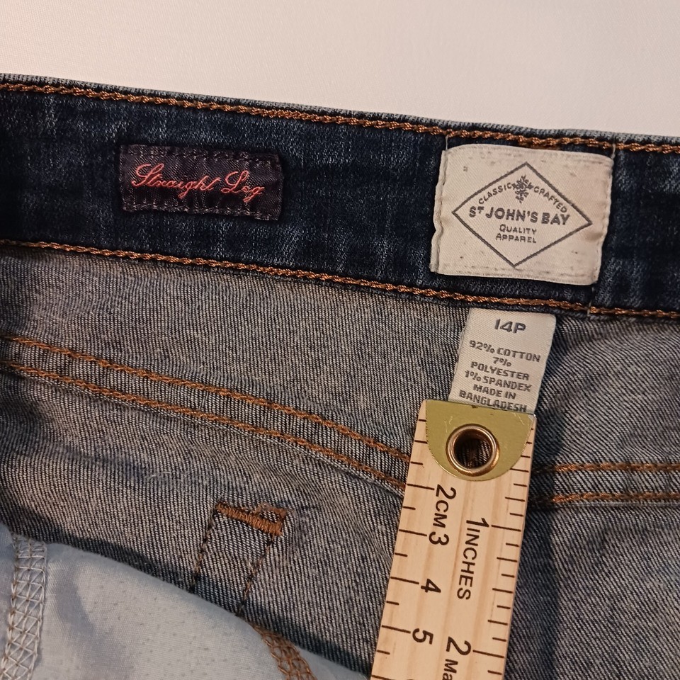 Upgrade your wardrobe with these stylish St. John's Bay straight-leg jeans. The dark wash, solid pattern, and button accents make them a timeless classic. With a zip closure and pockets, these pre-owned jeans are perfect for any occasion. Made of a blend of polyester, spandex, and cotton, they provide both comfort and durability. These denim jeans are size 14P with a waist size of 32 inches. They are designed for women who prefer a regular fit and a size type of regular. The brand is known for producing quality apparel, ensuring that these jeans are of the highest standard.