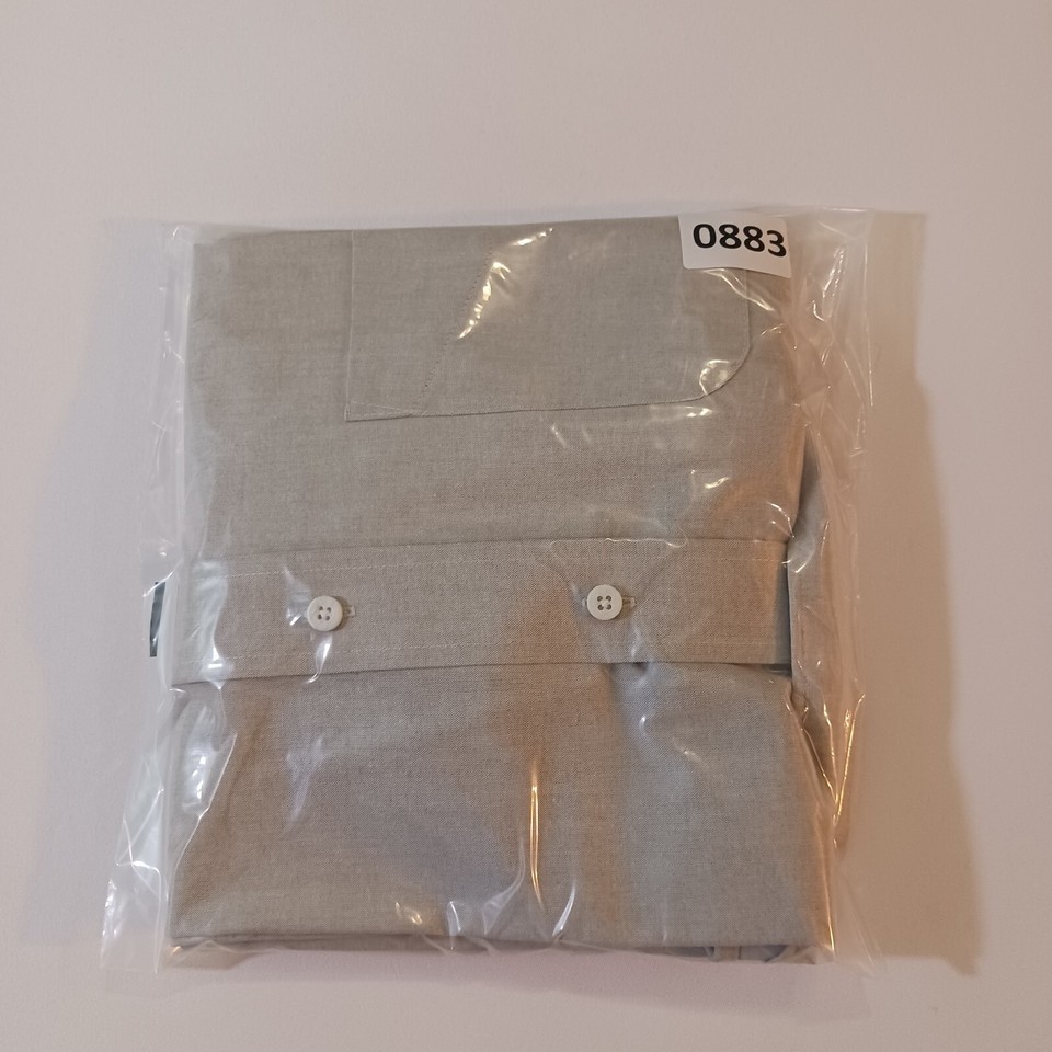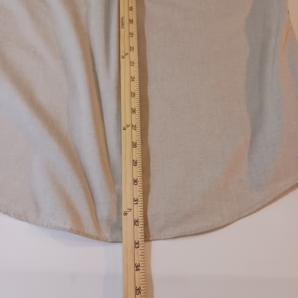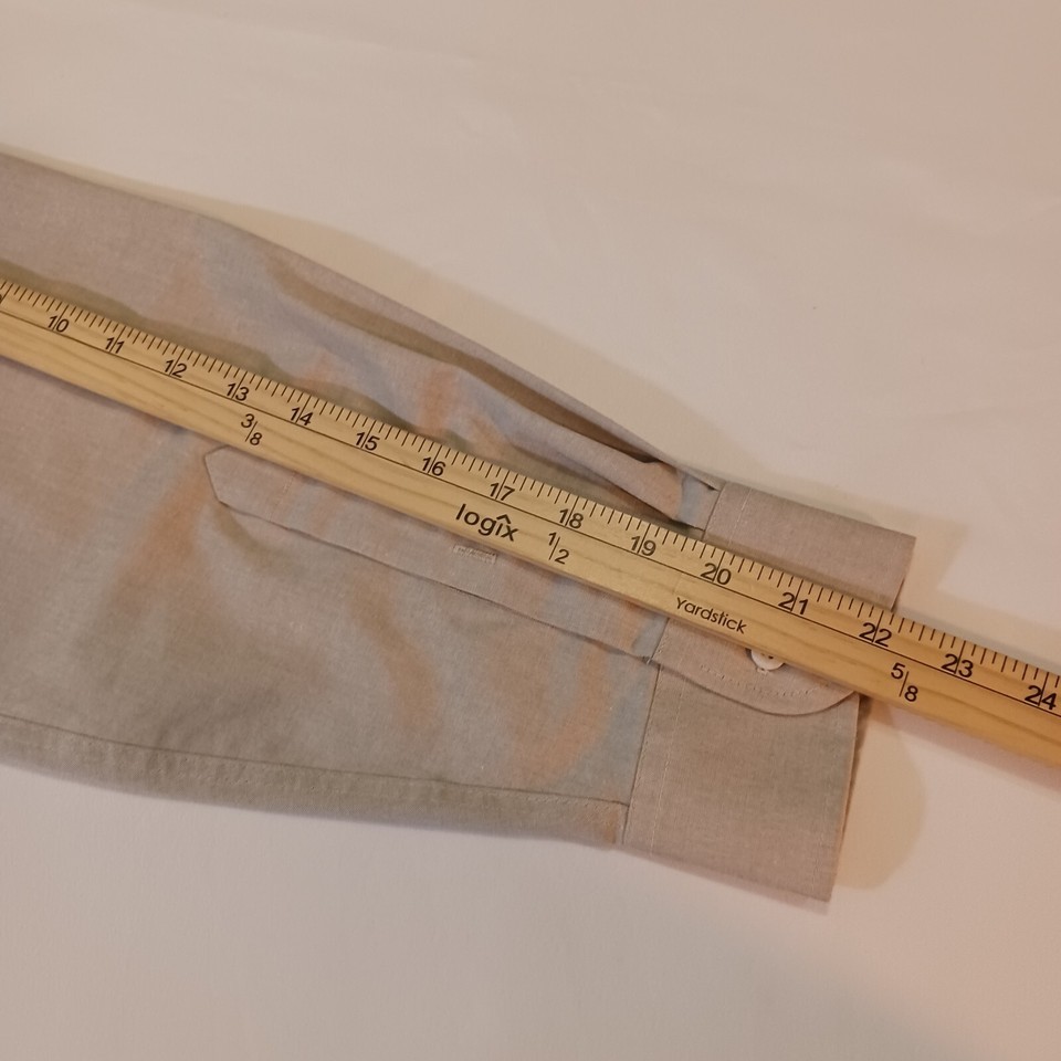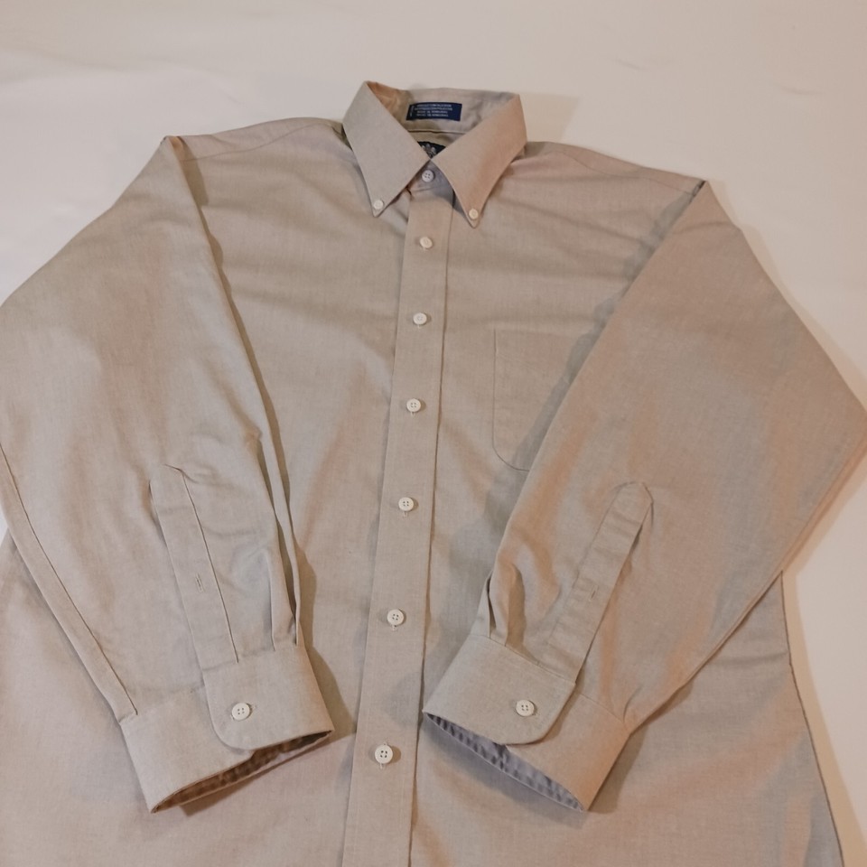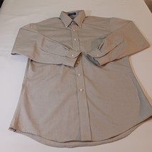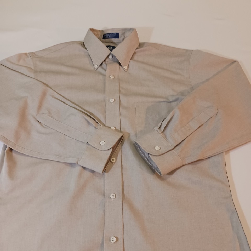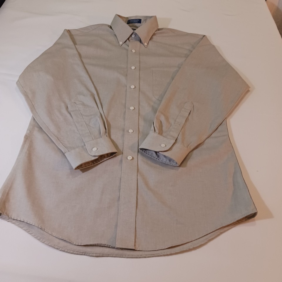 Stafford Shirt is a gray, long-sleeved, button-up shirt with a collared neckline and a button-down collar style. It is made of a wrinkle-free blend of polyester and cotton, in size 16.5, and is a regular fit for men. The shirt is pre-owned and has a solid pattern. The brand is Stafford, and it was made in Honduras.