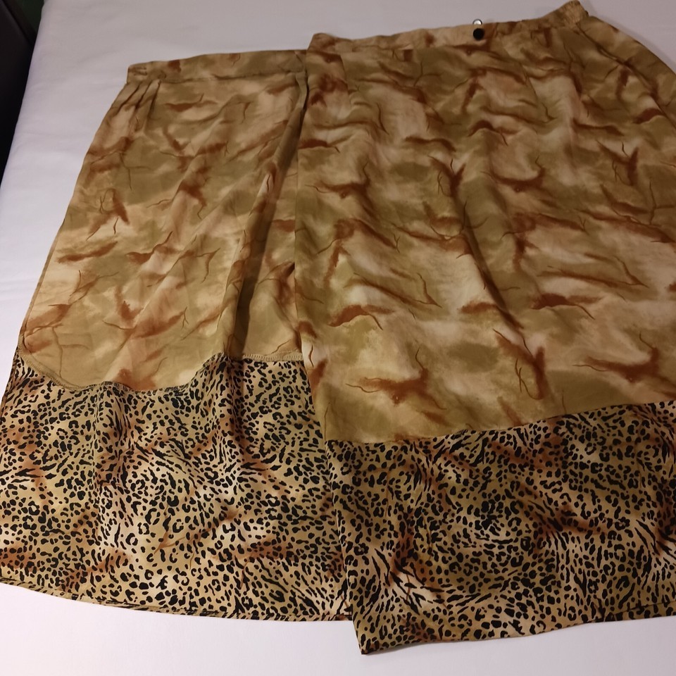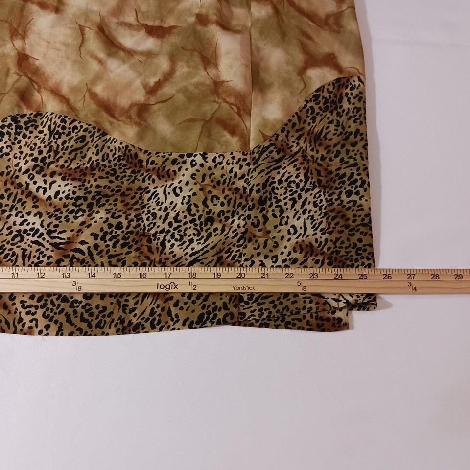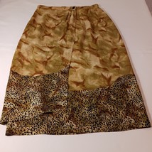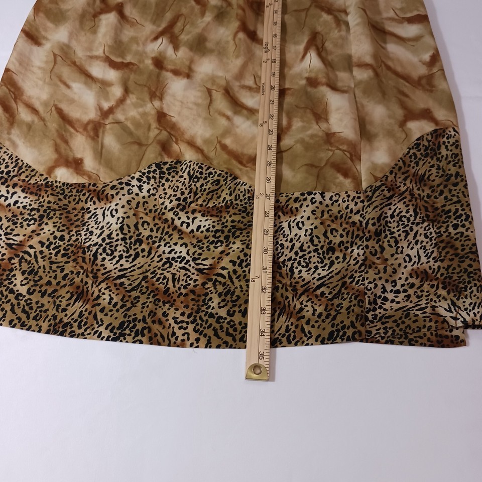 This Studio C women's skirt features a bold brown color with a playful leopard print button closure. The wrap style and mid-rise fit make it a versatile choice for both casual and workwear occasions. The skirt is made from polyester fabric and measures 35" in length, making it suitable for all seasons.
