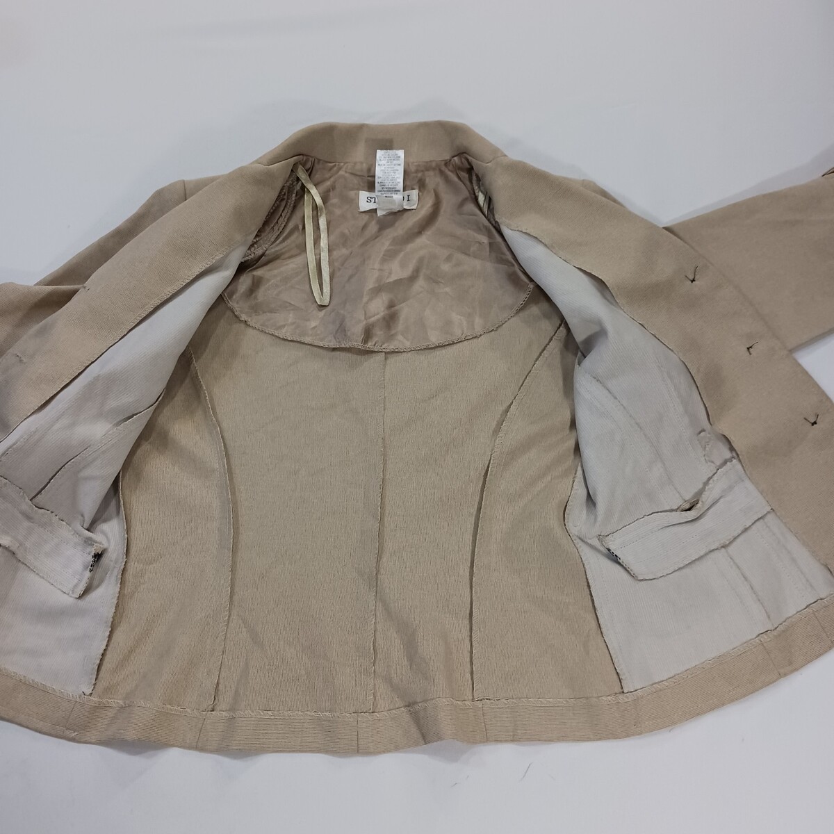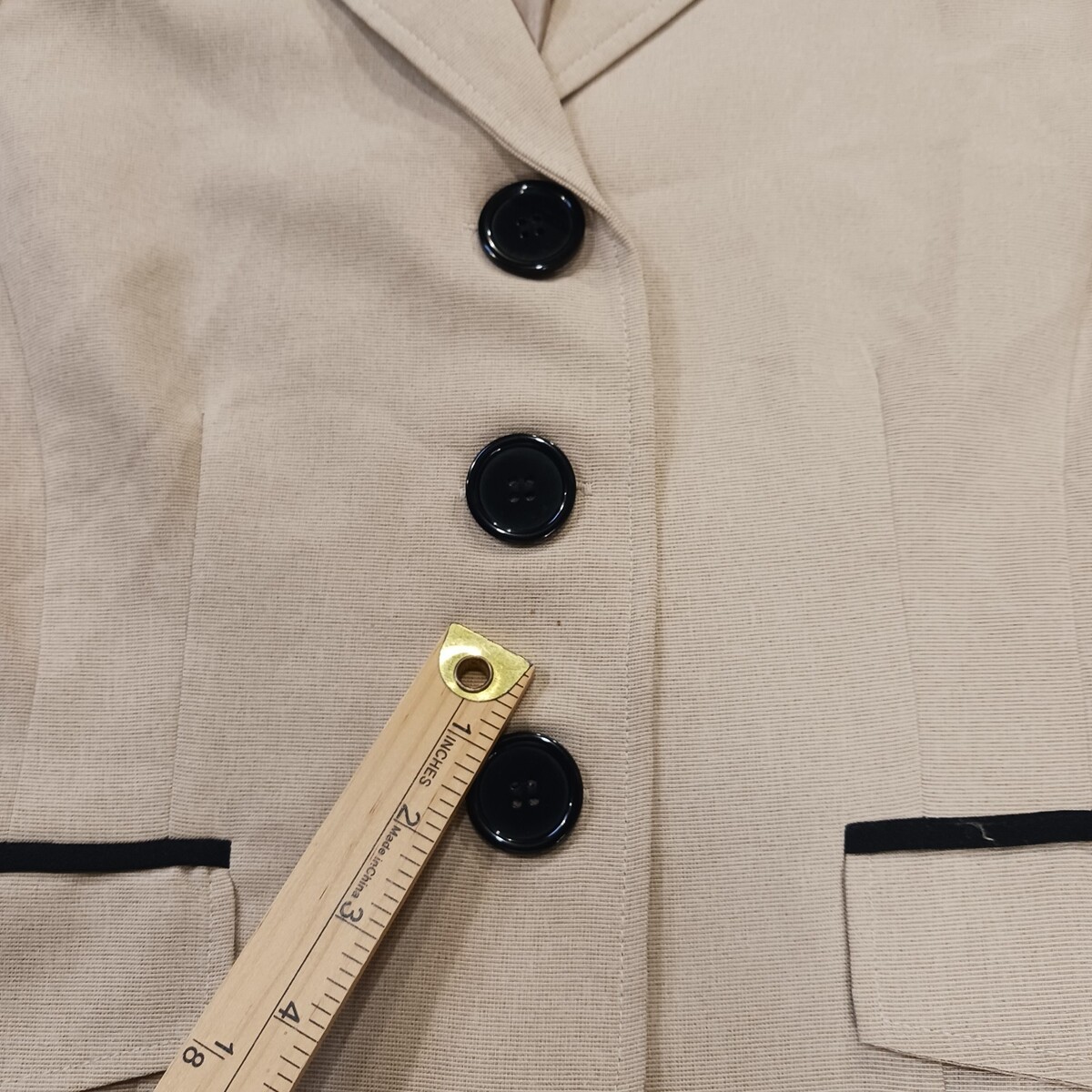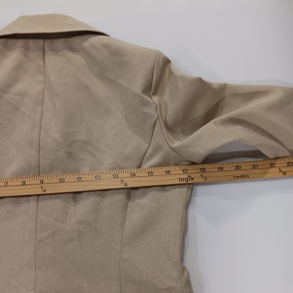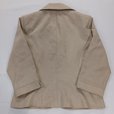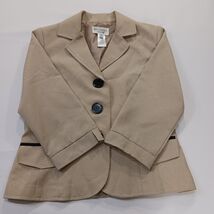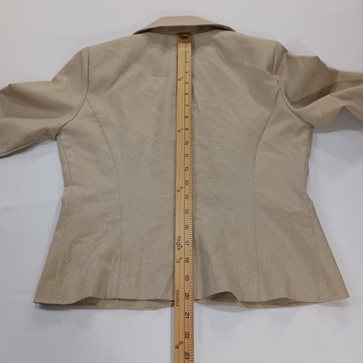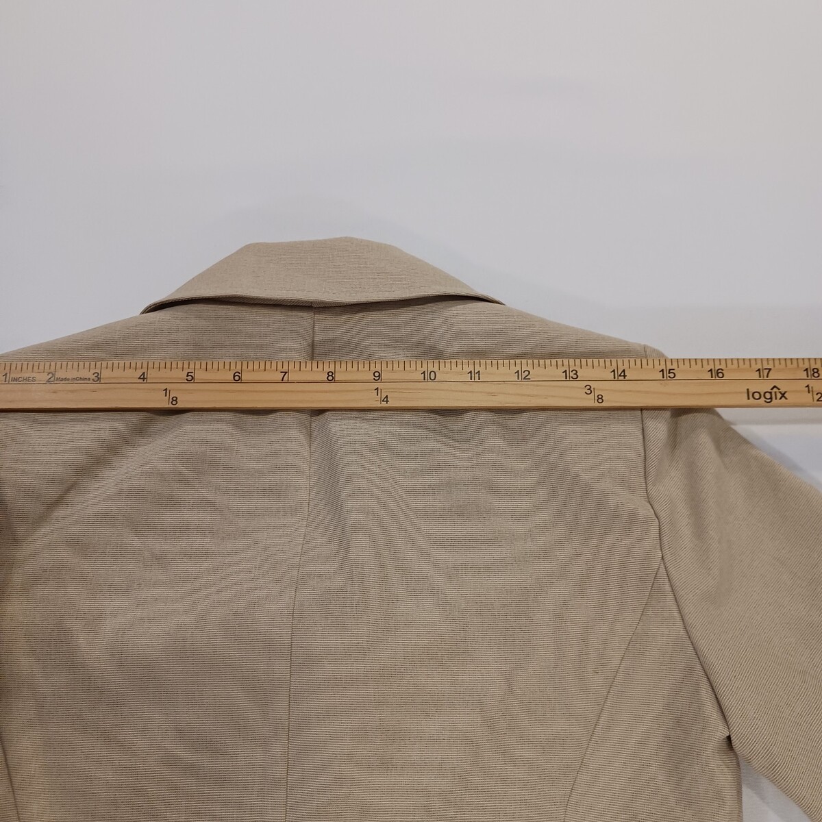 The Studio I Petite Women's Tan/Beige 3-Button Blazer Jacket in size 4P is a classic and stylish outerwear piece designed for petite women. Made from polyester, this jacket features a solid beige color with a button closure and long sleeves. Perfect for both casual and business occasions, this jacket is tailored to fit a classic style and is 20 inches in length. The jacket is accented with buttons and is designed by the brand Studio I, making it a versatile and flattering addition to any fall or spring wardrobe.