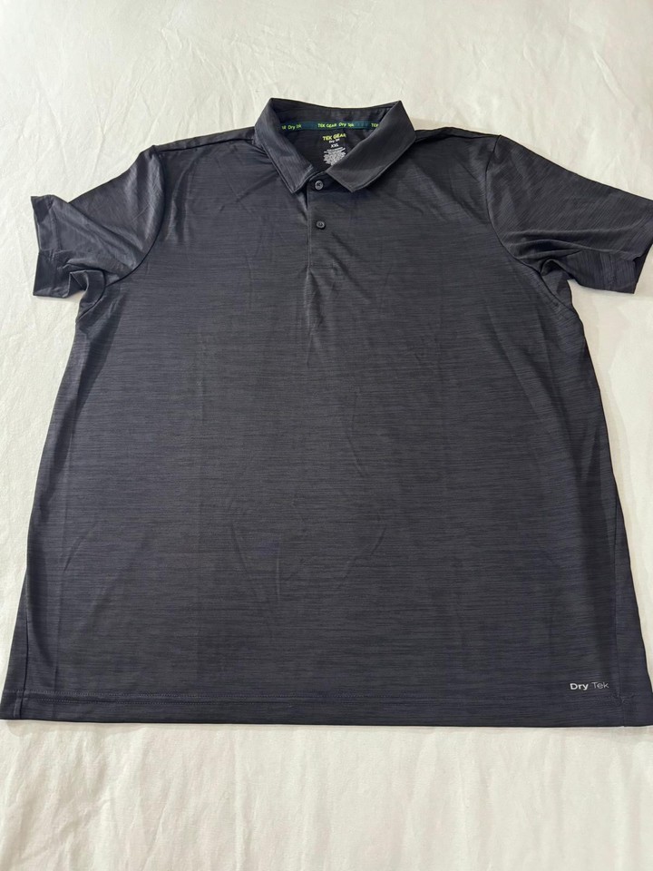 The Tek Gear Dry Tek Men's Gray Short Sleeve Polo Shirt in size 2XL is a versatile and comfortable addition to any man's wardrobe. This polo shirt features a classic collared neckline, short sleeves, and a solid blue color with a medium fabric wash, made from polyester material for durability and easy care. Ideal for casual or active wear, this regular fit polo from Tek Gear offers both style and functionality.